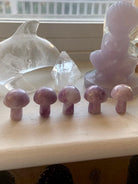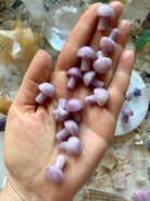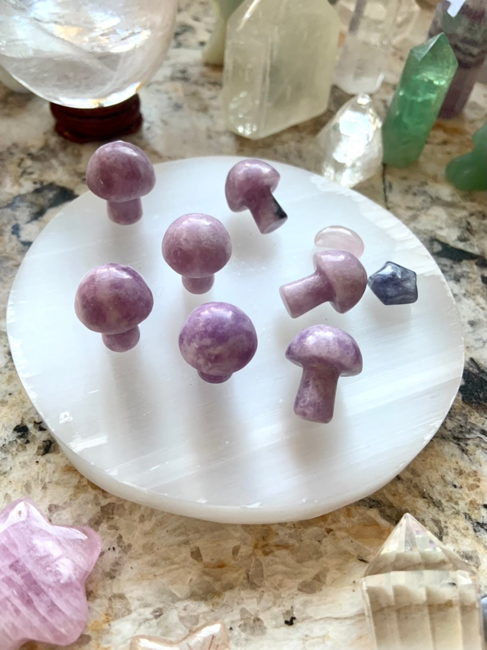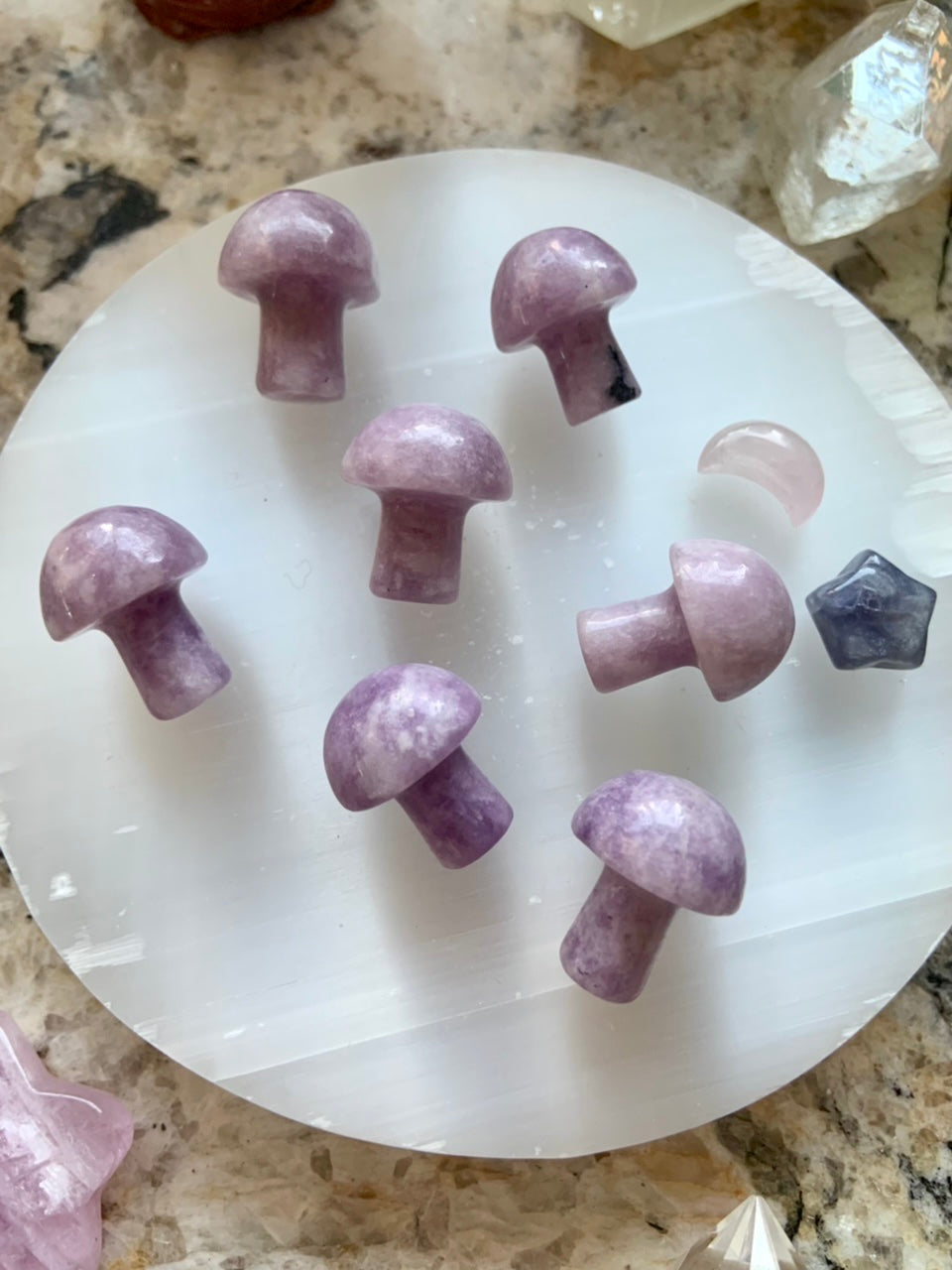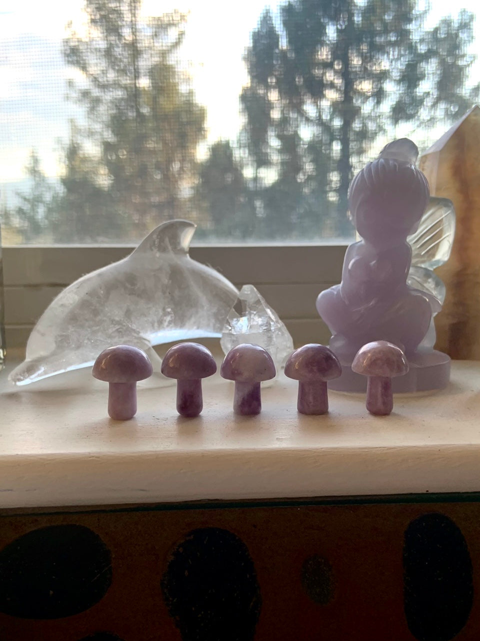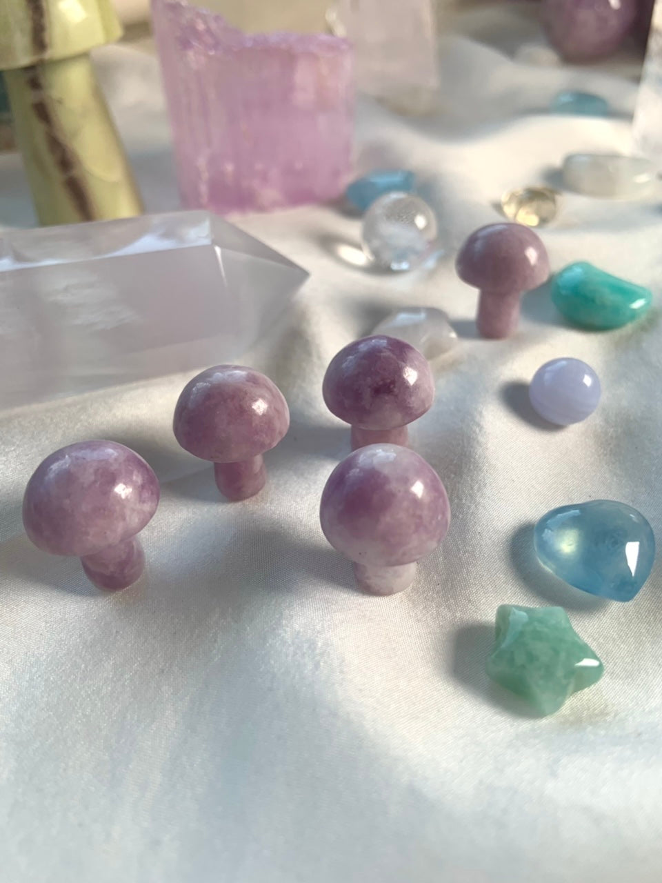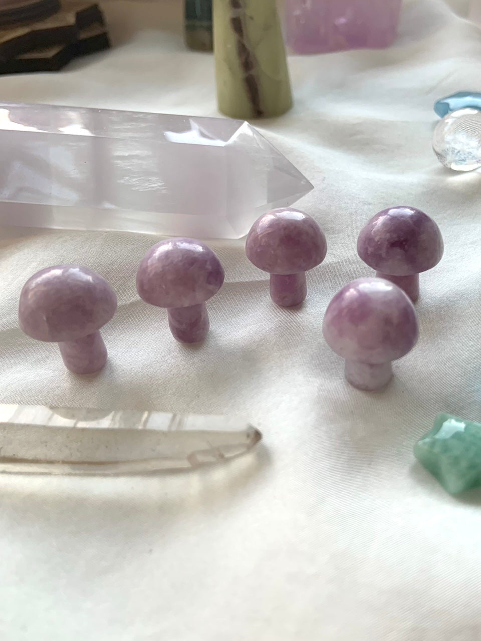 These hand carved mini crystal mushrooms are so magical + special, carved out of a very pretty pastel lilac colored Lepidolite. The mushroom is symbolic of kundalini energy + enlightenment with the stalk representing the spine + the cap is the crown chakra.