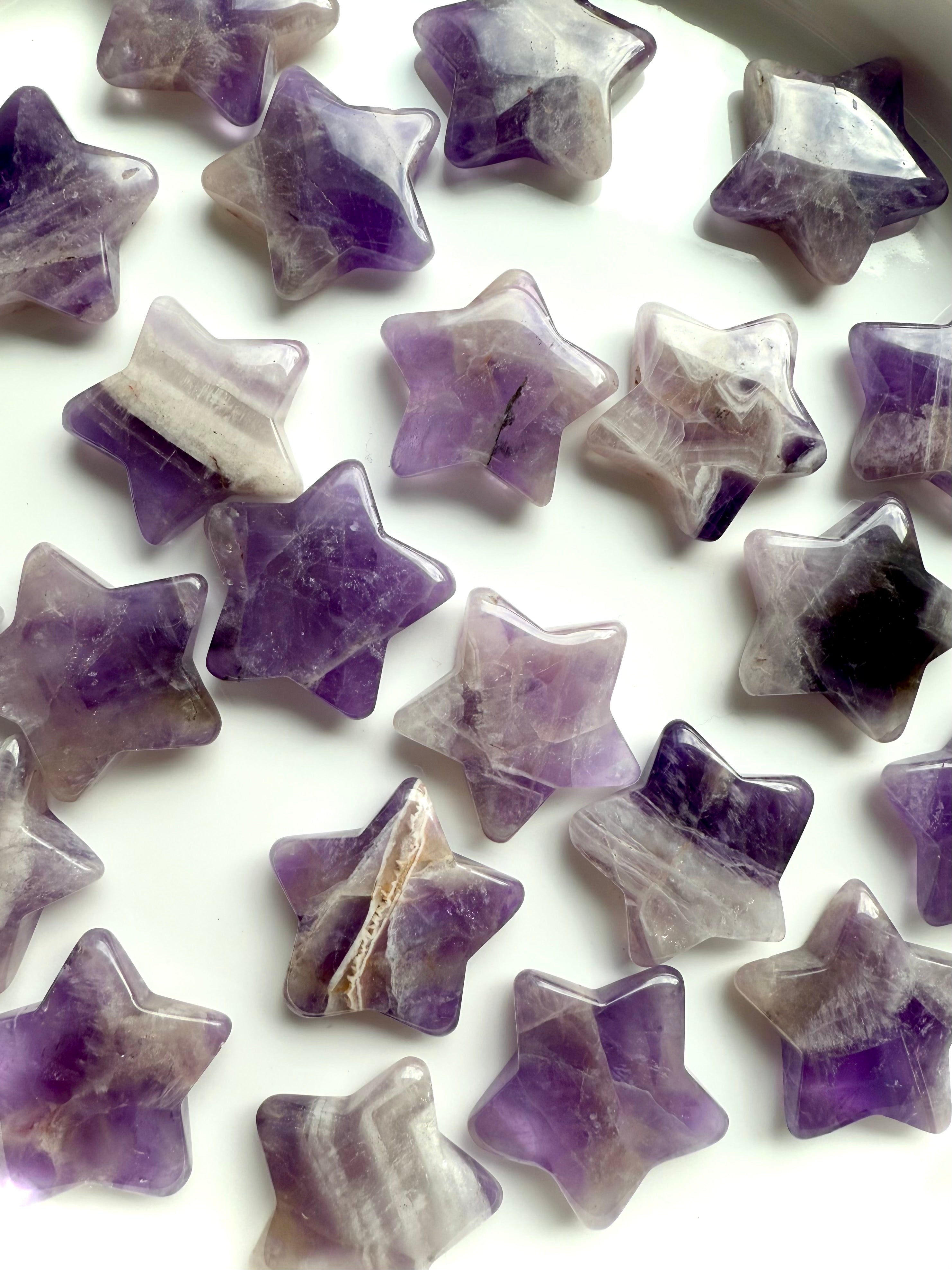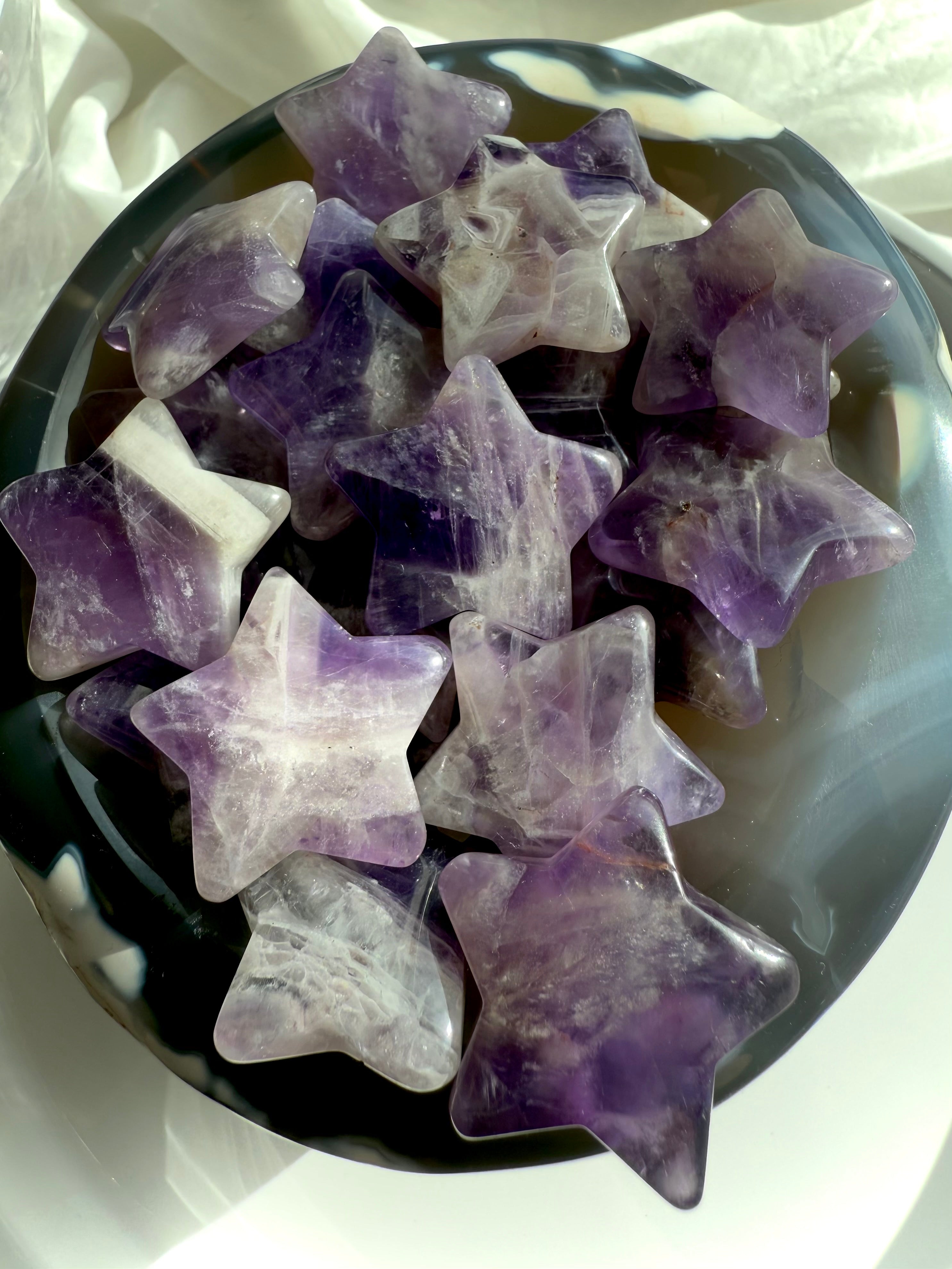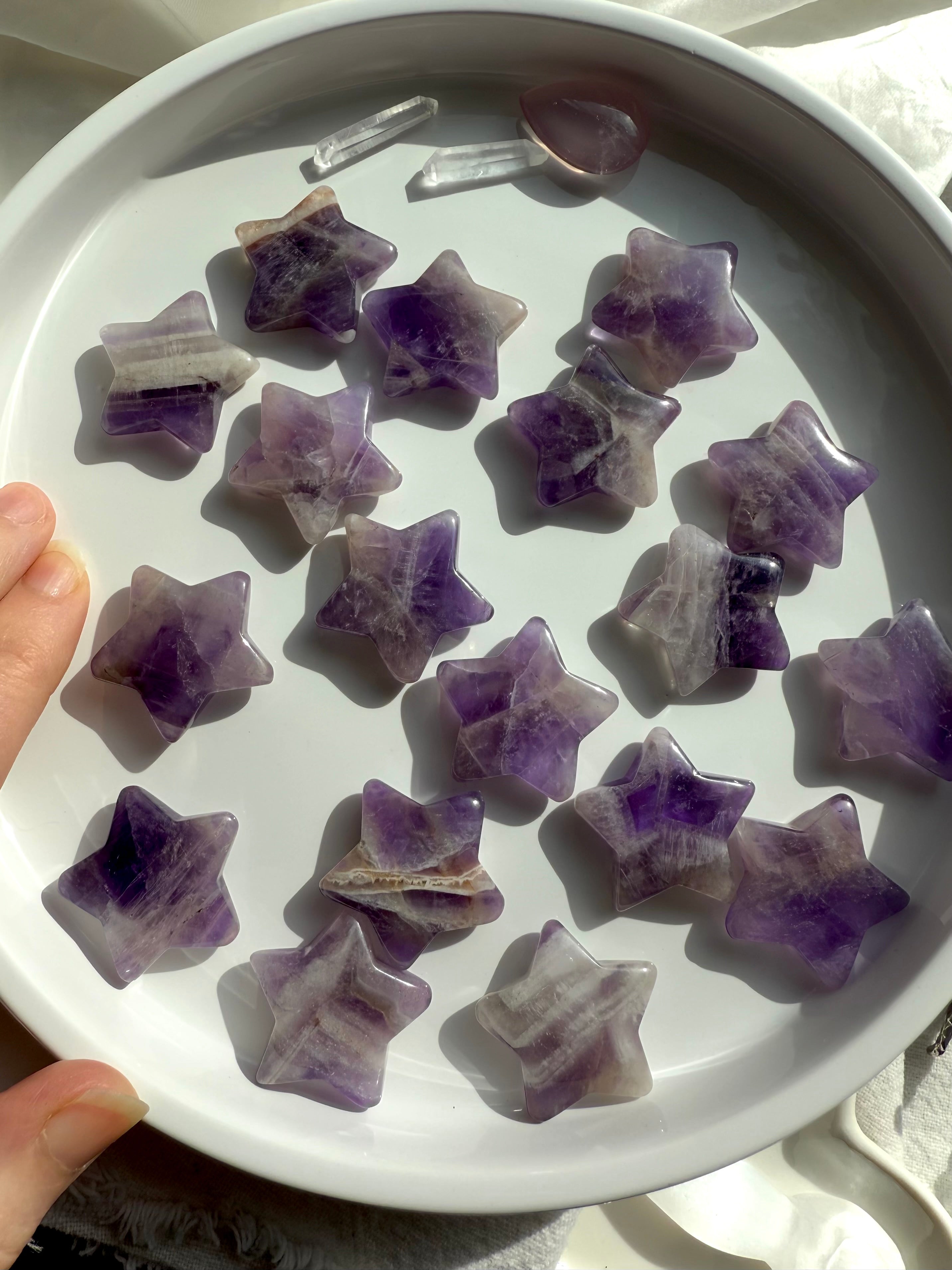 Crystal Stars are symbolic of divine guidance + protection, as well as imagination, wonder, dreams + magic. These dream amethyst crystal stars make a unique addition to your crystal collection. Use them in your crystal grids, moon rituals, or just floating in your jewelry box.