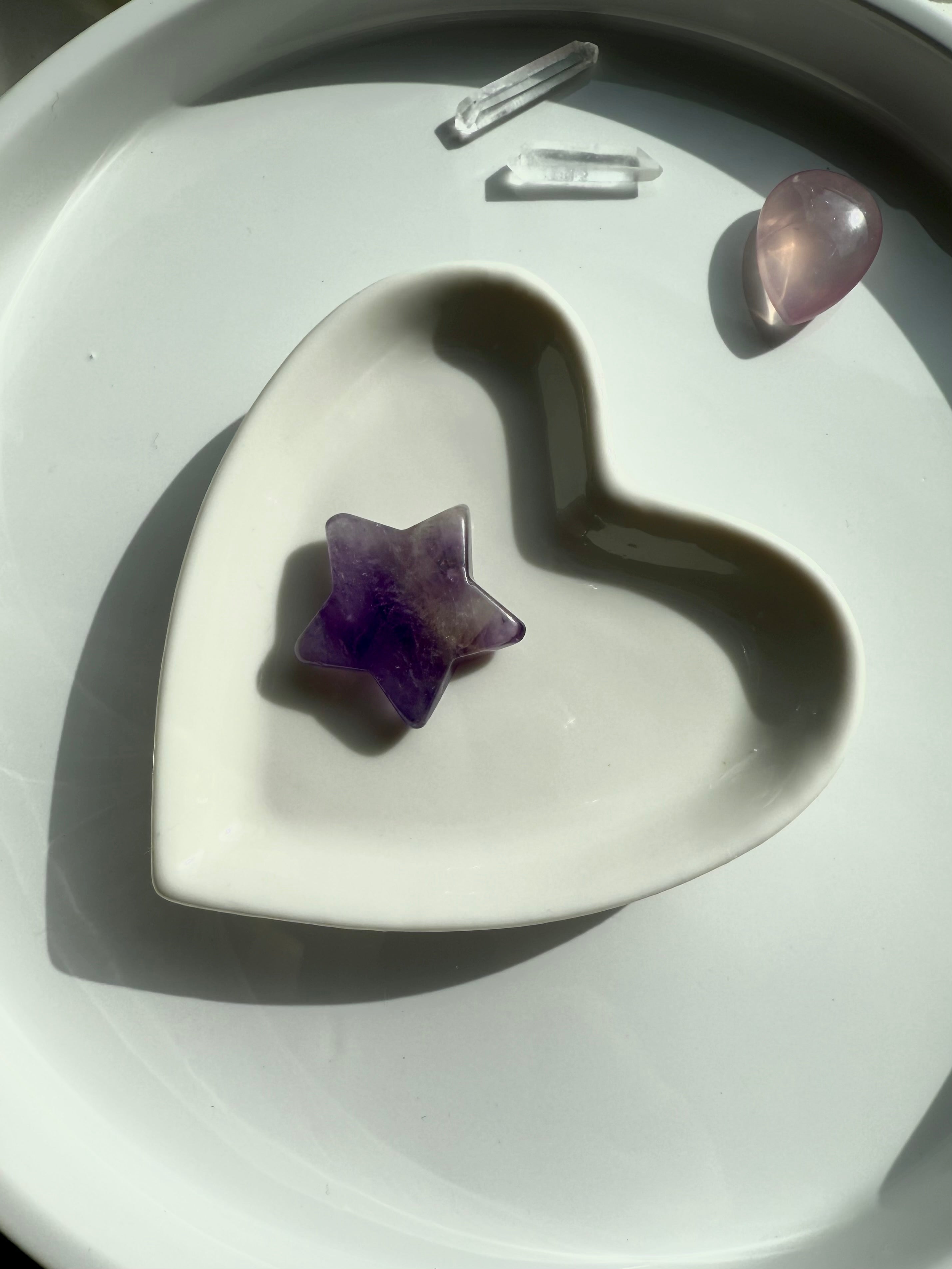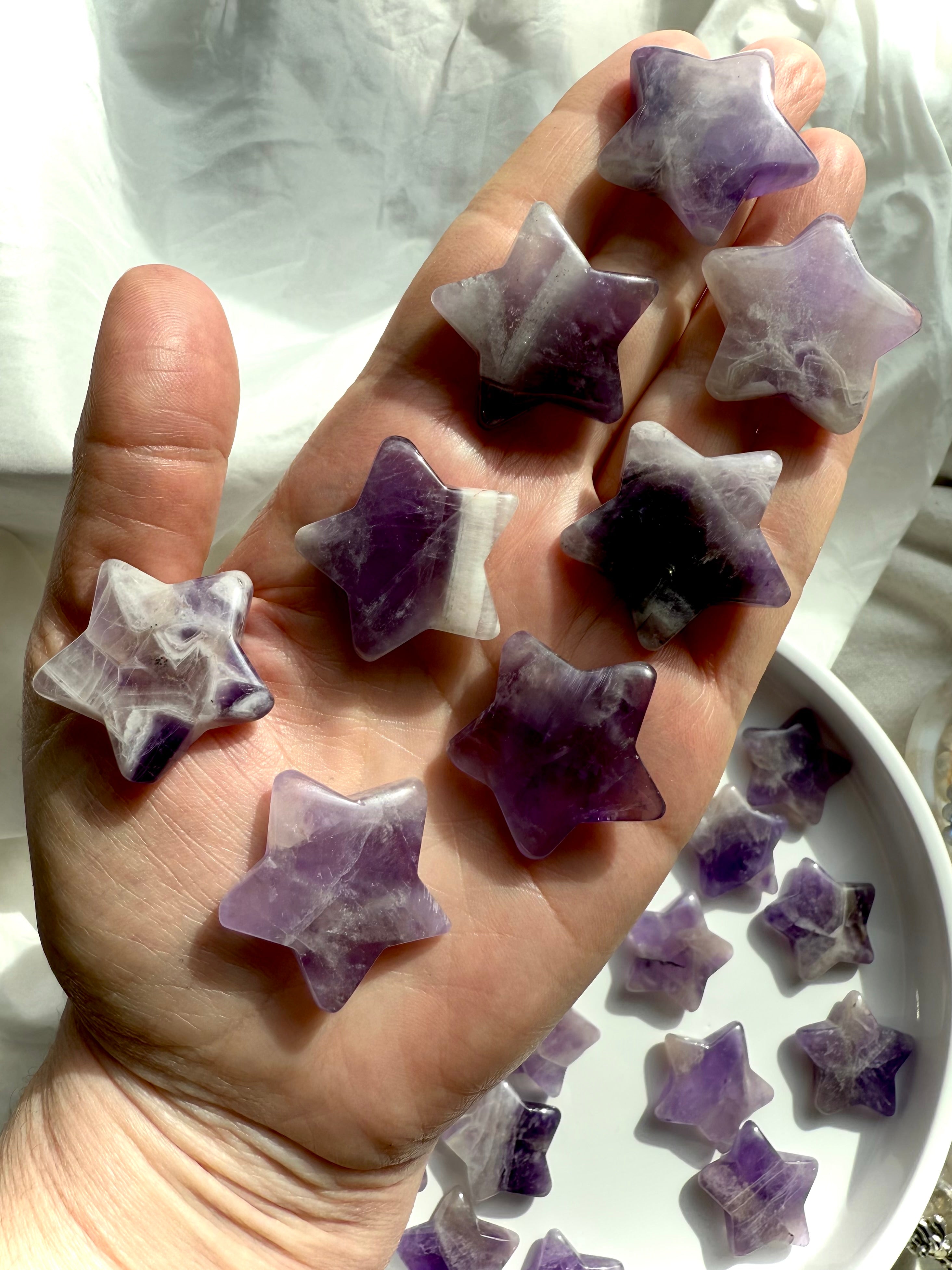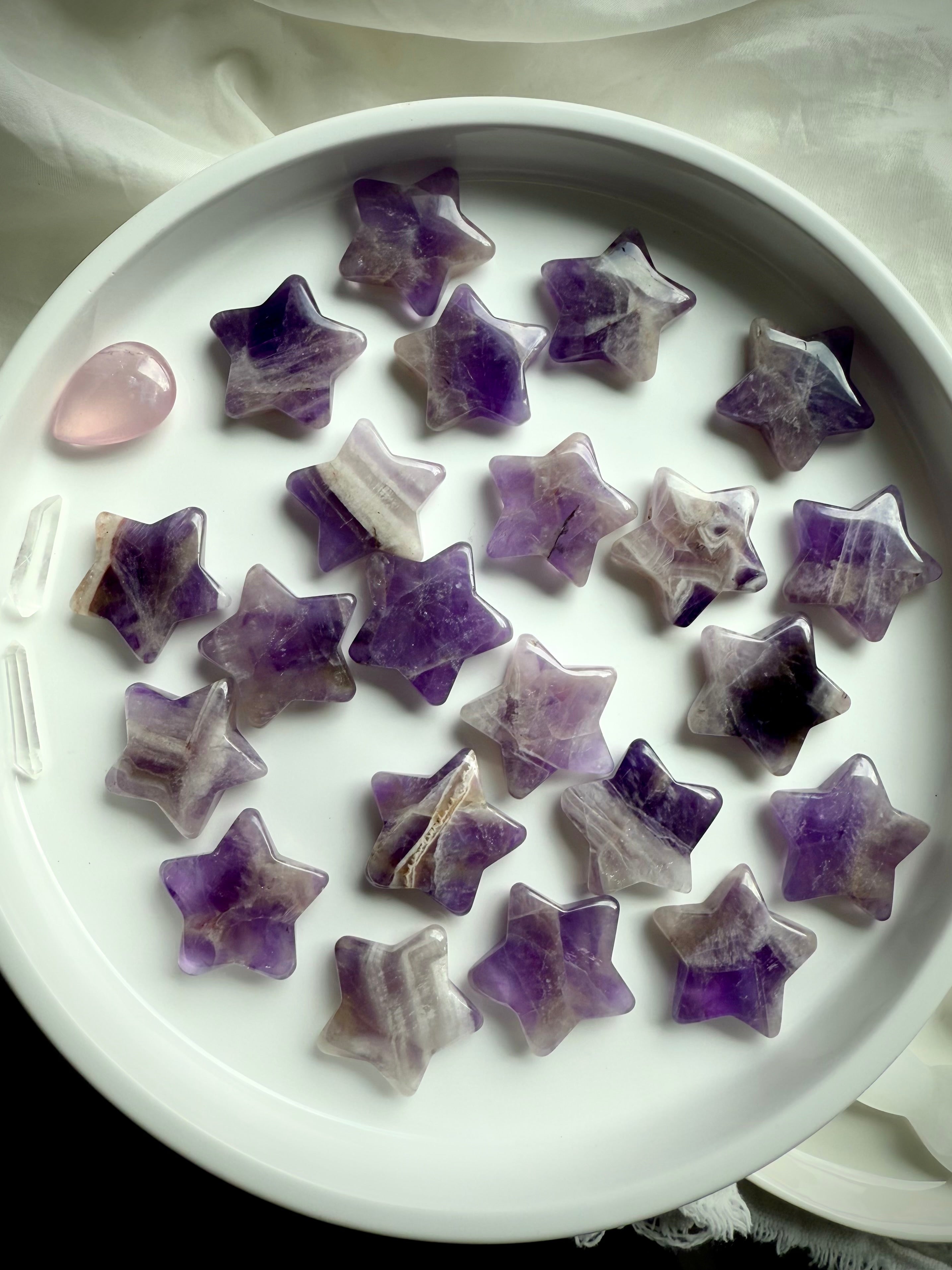 Crystal Stars are symbolic of divine guidance + protection, as well as imagination, wonder, dreams + magic. These dream amethyst crystal stars make a unique addition to your crystal collection. Use them in your crystal grids, moon rituals, or just floating in your jewelry box.