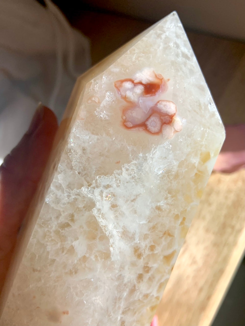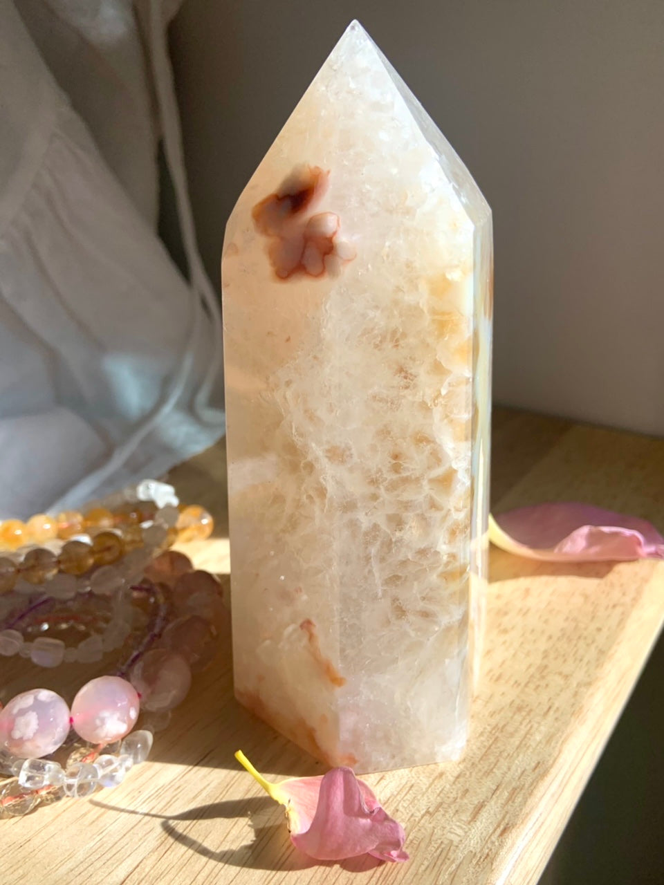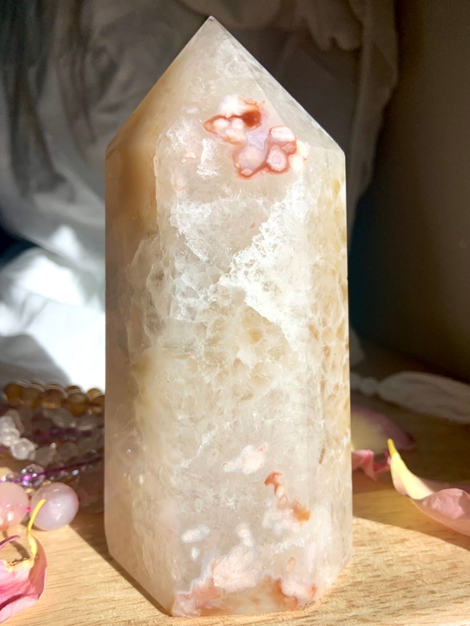 This big + chunky crystal tower is a beautiful combination of White Carnelian + Flower Agate in Quartz with a stunning Druzy Agate geode. The warm + dreamy creamy pastel colors are beautiful, subtle + rare making this a coveted collector's piece that will make a statement in your decor.