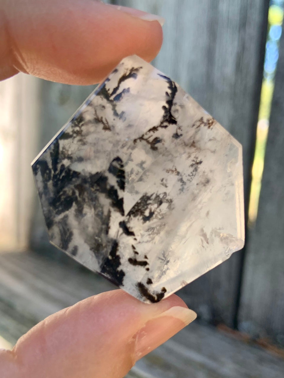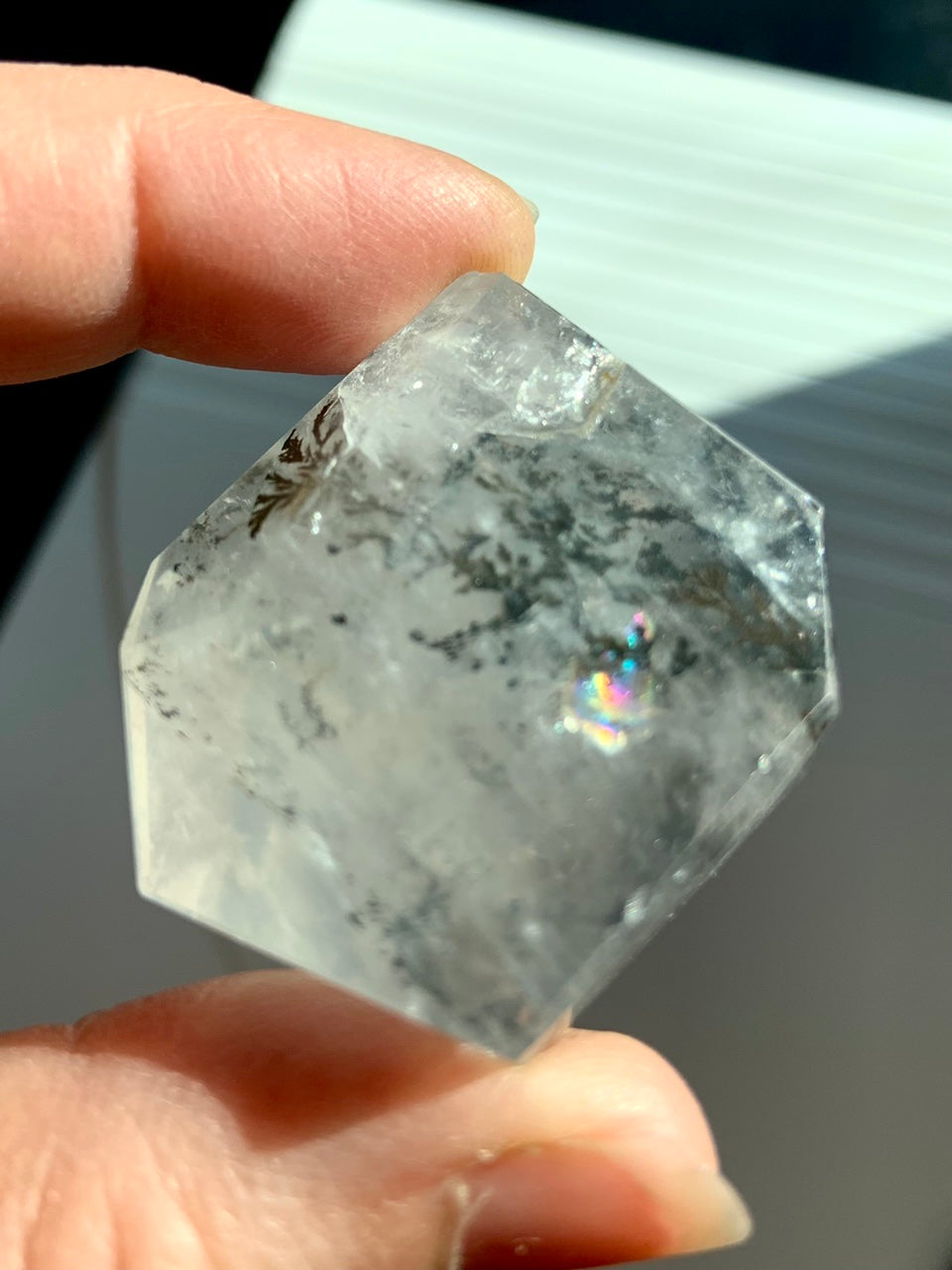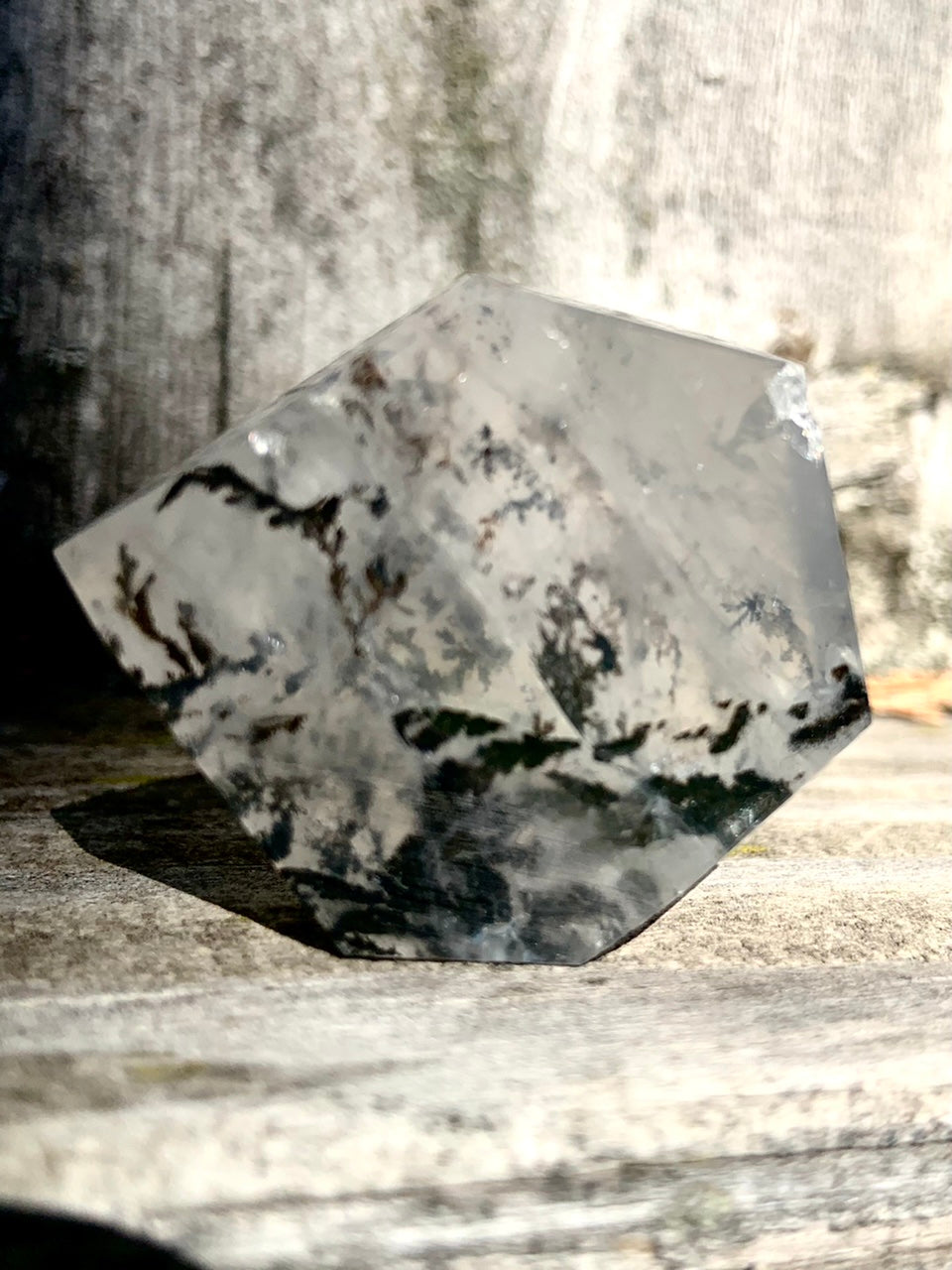 This one of a kind crystal gem is cut with some unique angular facets that amplify the prismatic effects of the crystal + highlight the stunning dendrites suspended in quartz. It looks different + magical from every angle!