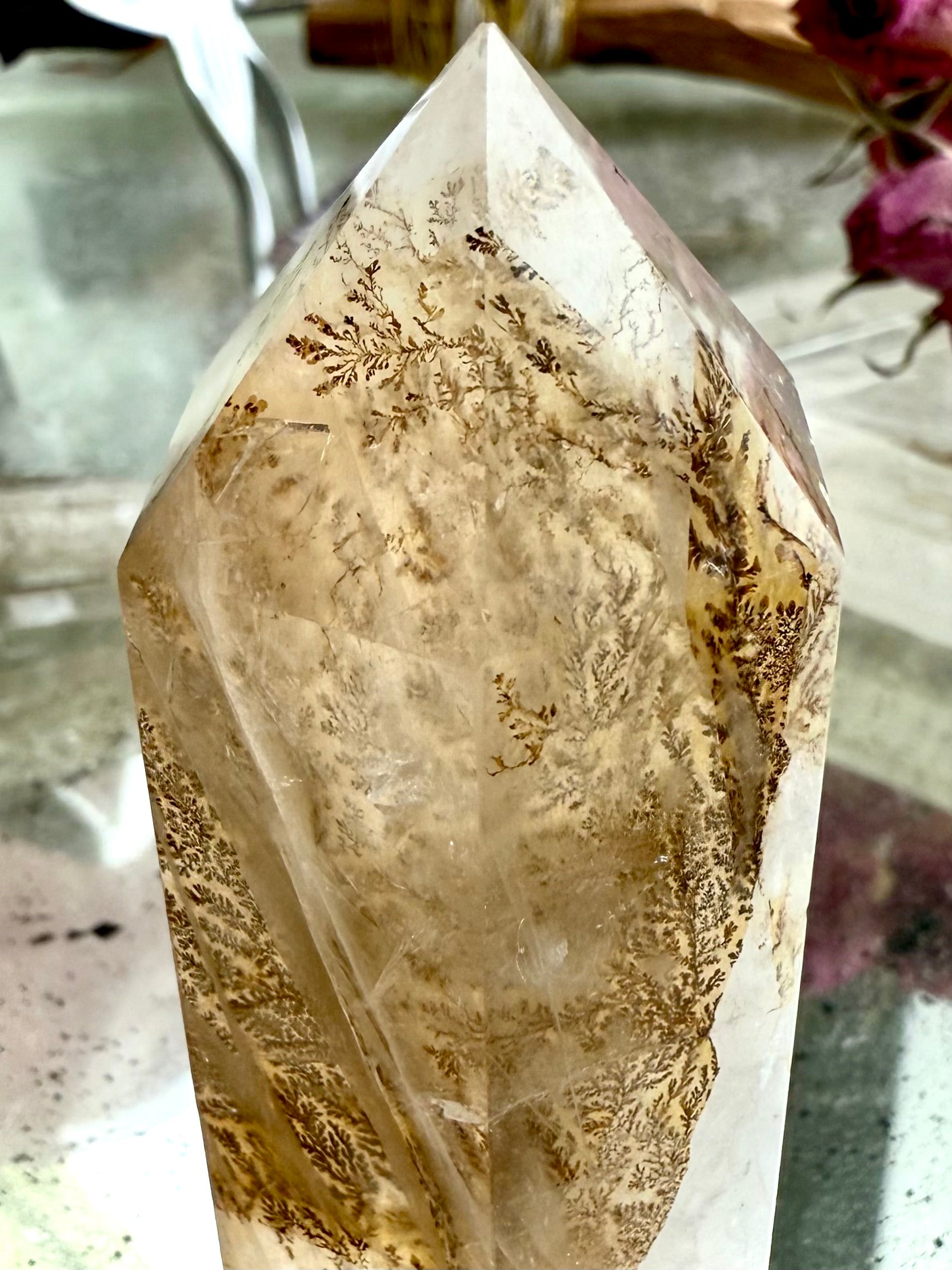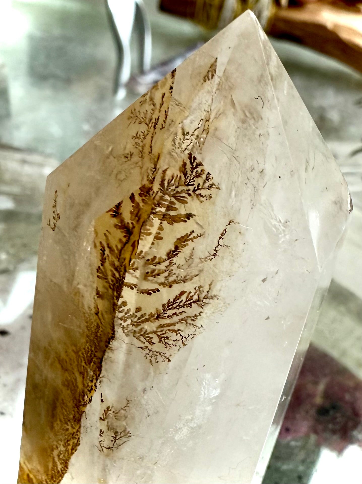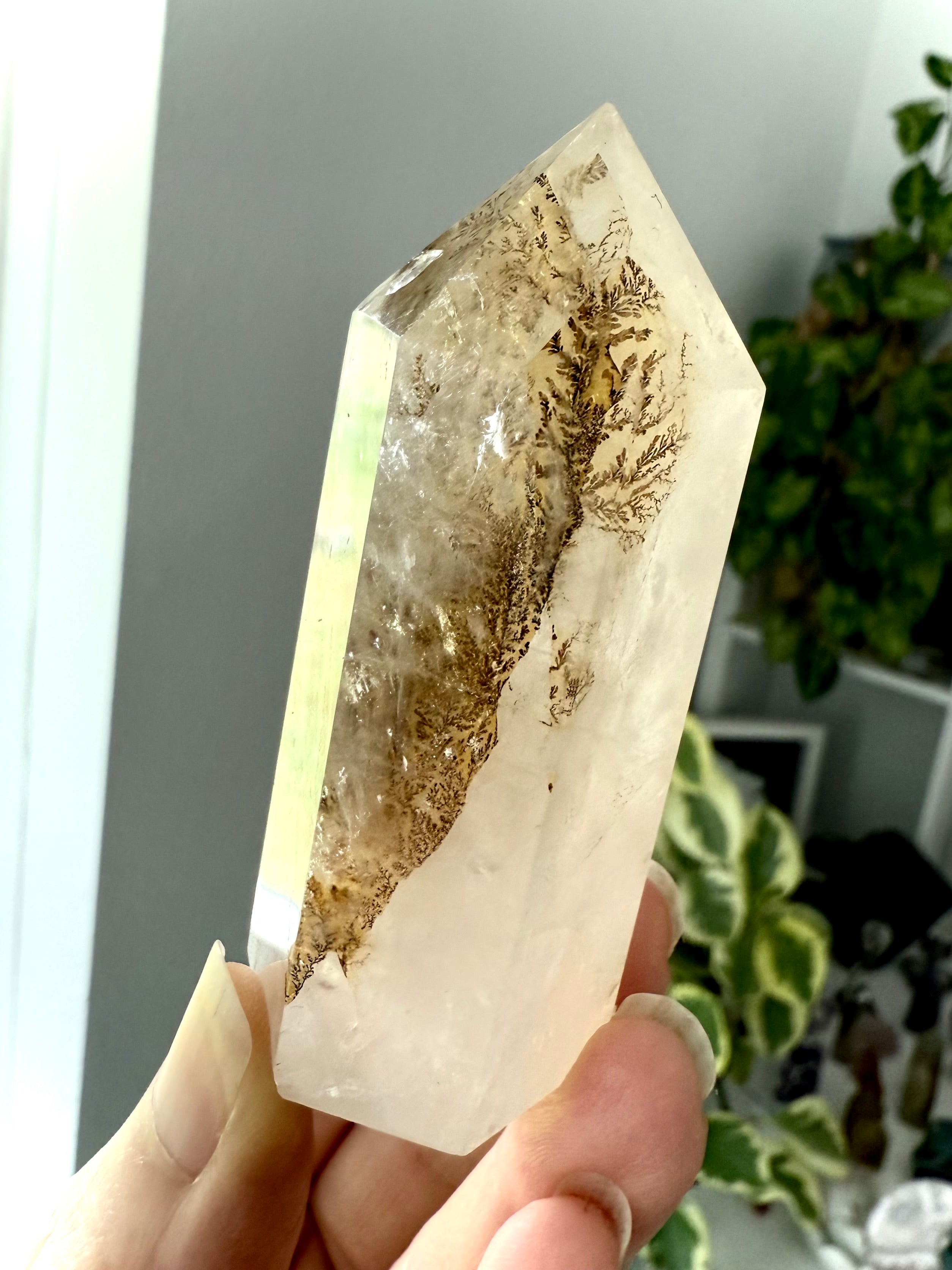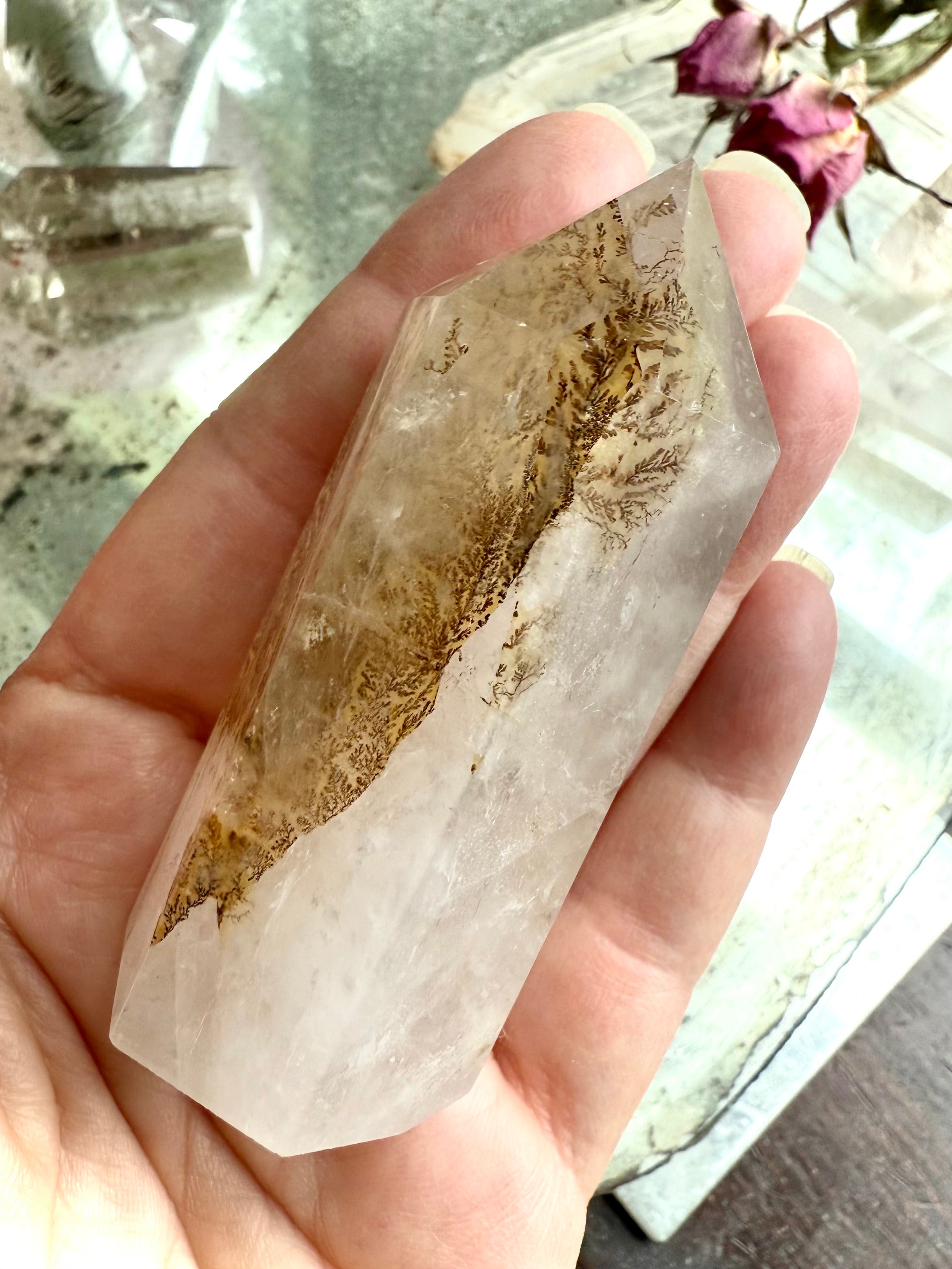 A unique + beautiful crystal from nature's garden, dendritic quartz contains inclusions of iron, manganese, hematite and/or other metallic oxides that grow in a fern-like or tree-like fractal pattern within the stone.