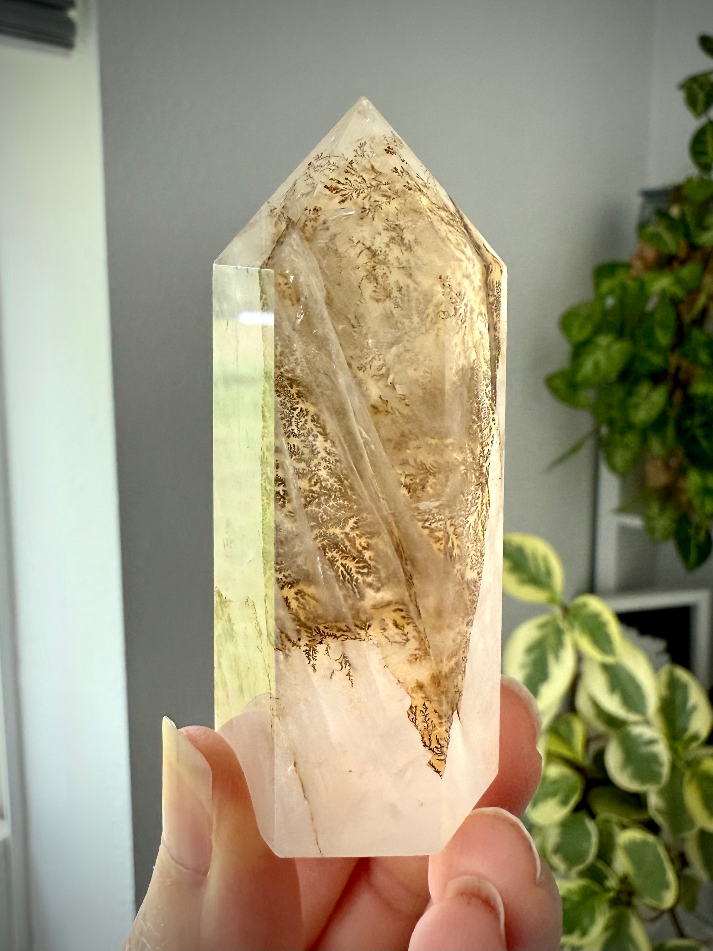 Consider adding this rare Dendritic Girasol Quartz Point with Golden Healer inclusions to your crystal collection. This one of a kind crystal specimen has lots of well-formed dendrite fractals highlighted on Golden Healer veins that are suspended in milky Girasol with opaque + translucent patterns, lots of shimmer, flash + some pretty rainbows which give gorgeous dimension to this stone.
