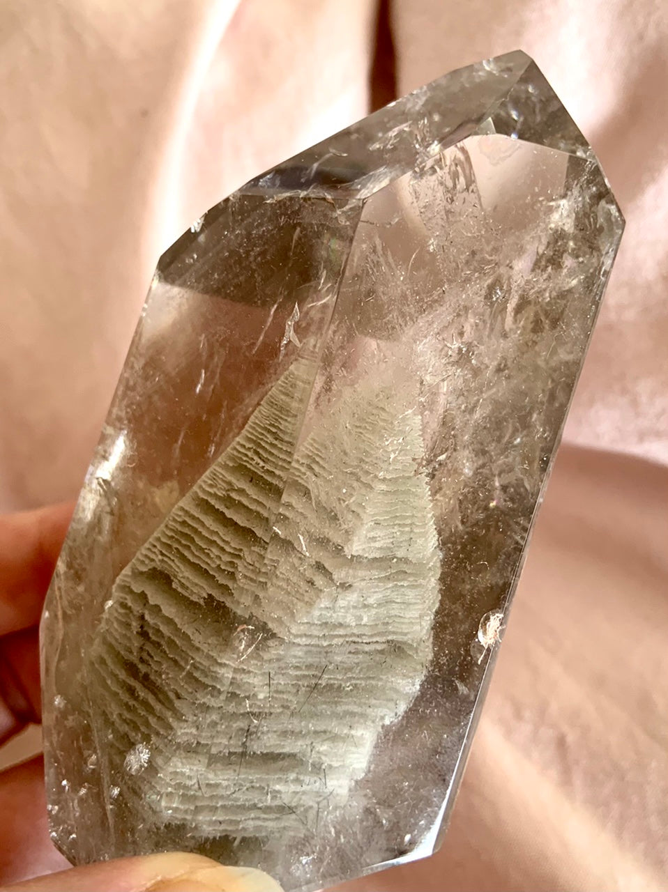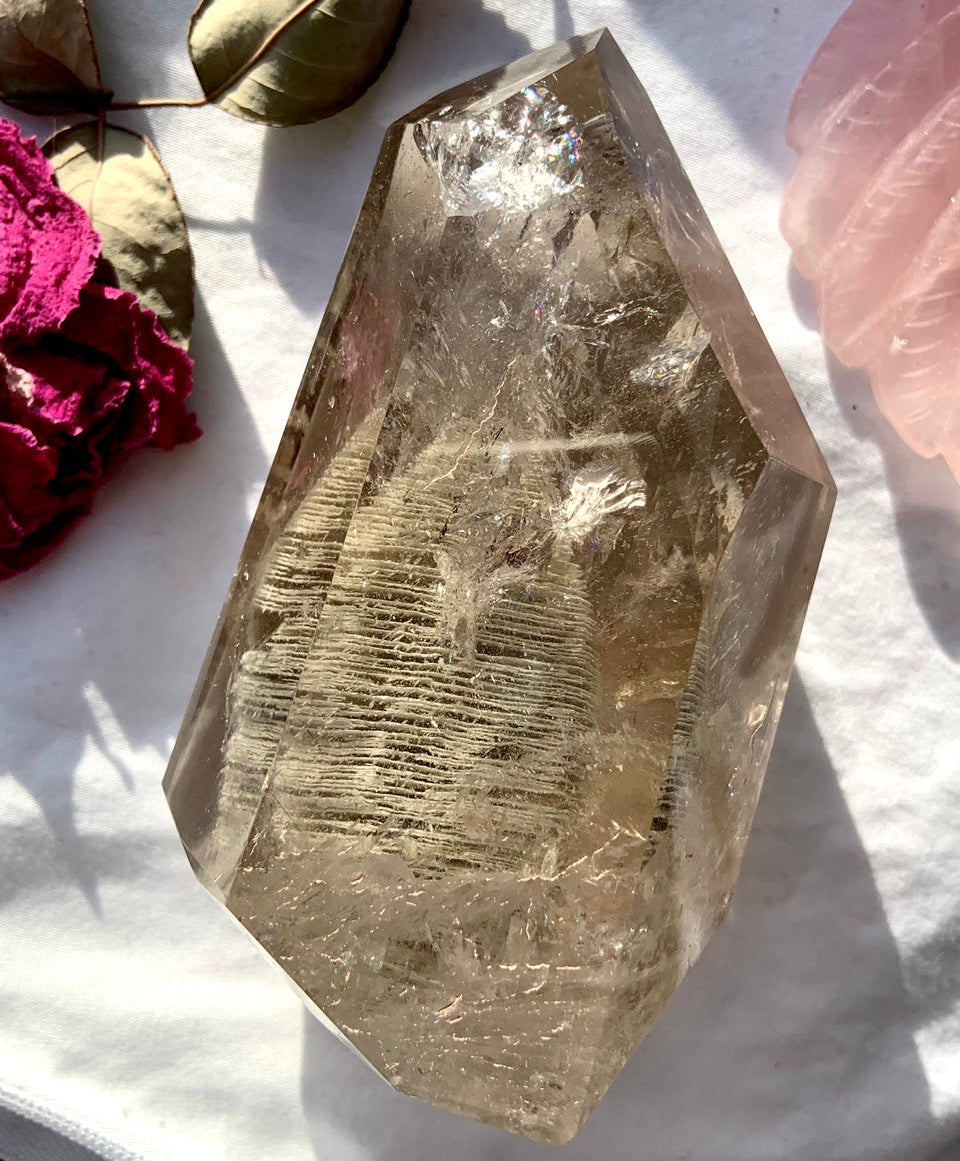 This is a clear prismatic Smokey Garden Quartz Crystal with an extraordinary Thousand Layer Phantom inclusion shaped like a pyramid + some sparkly rainbows too. Have you ever seen anything like this?