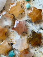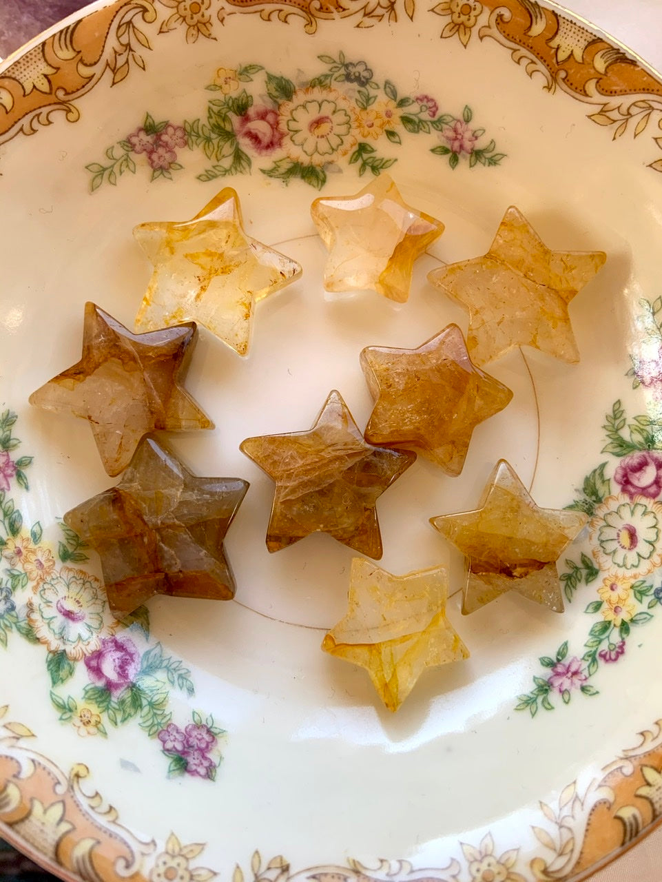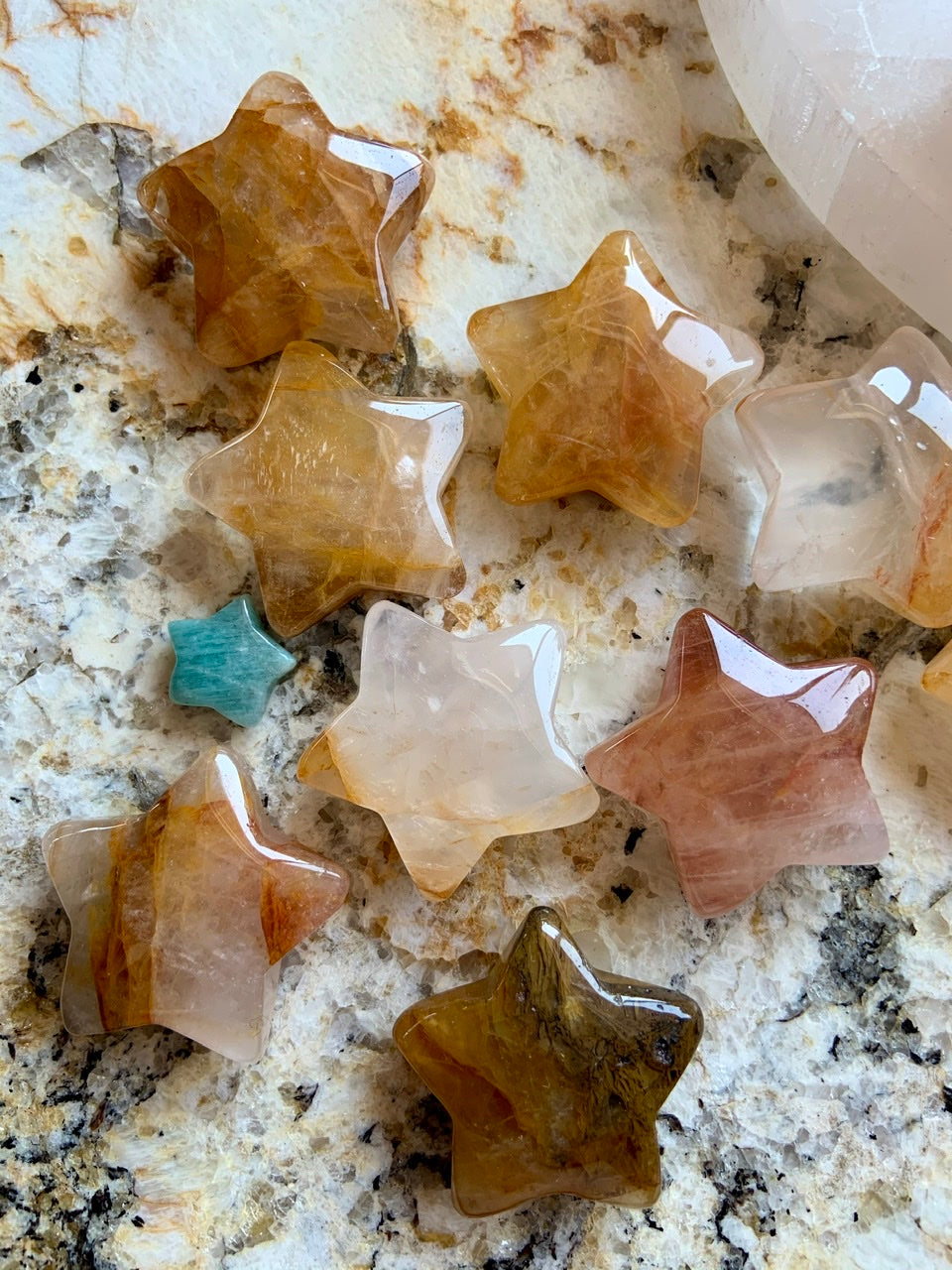These hand carved stars vary from transparent with golden inclusions to fully saturated with dramatic iron veins + will be intuitively chosen for you. Pictures show different lighting + some fun ways you can use these celestial crystal shapes in your crystal display + your crystal grids. These crystals are natural gifts from Gaia with unique variances in shape, size, interior patterns, color saturation, chatoyant flash + clarity.