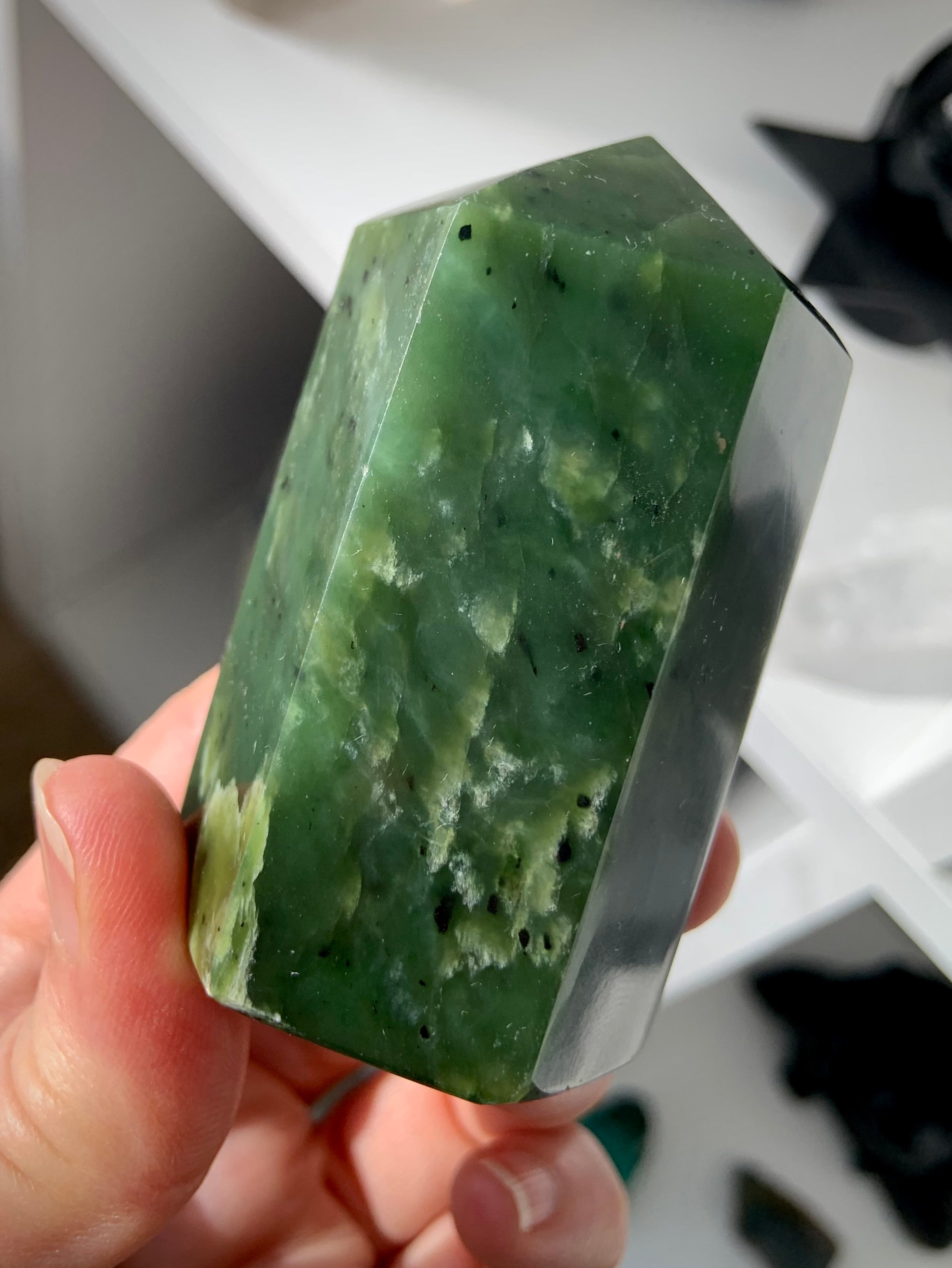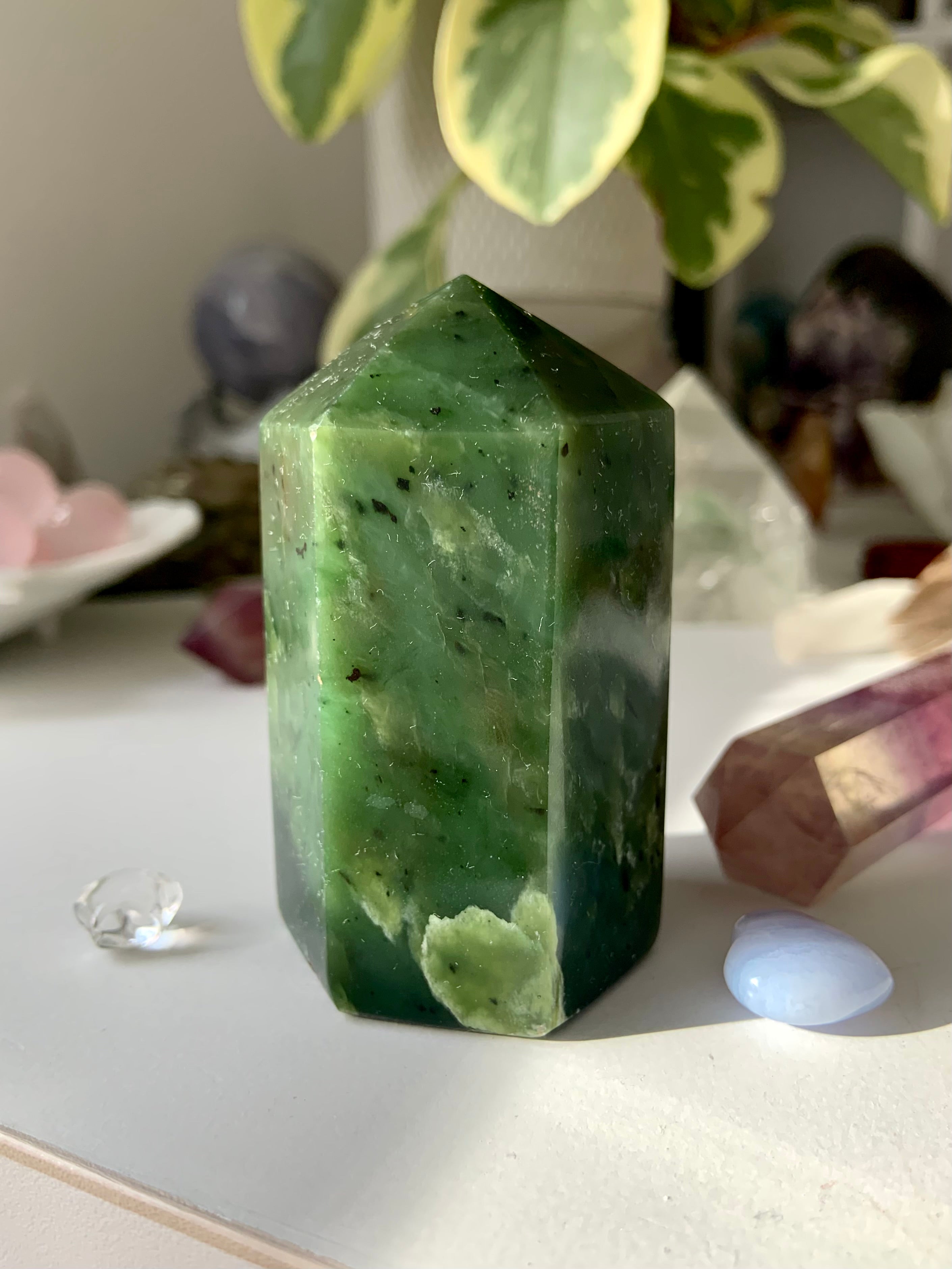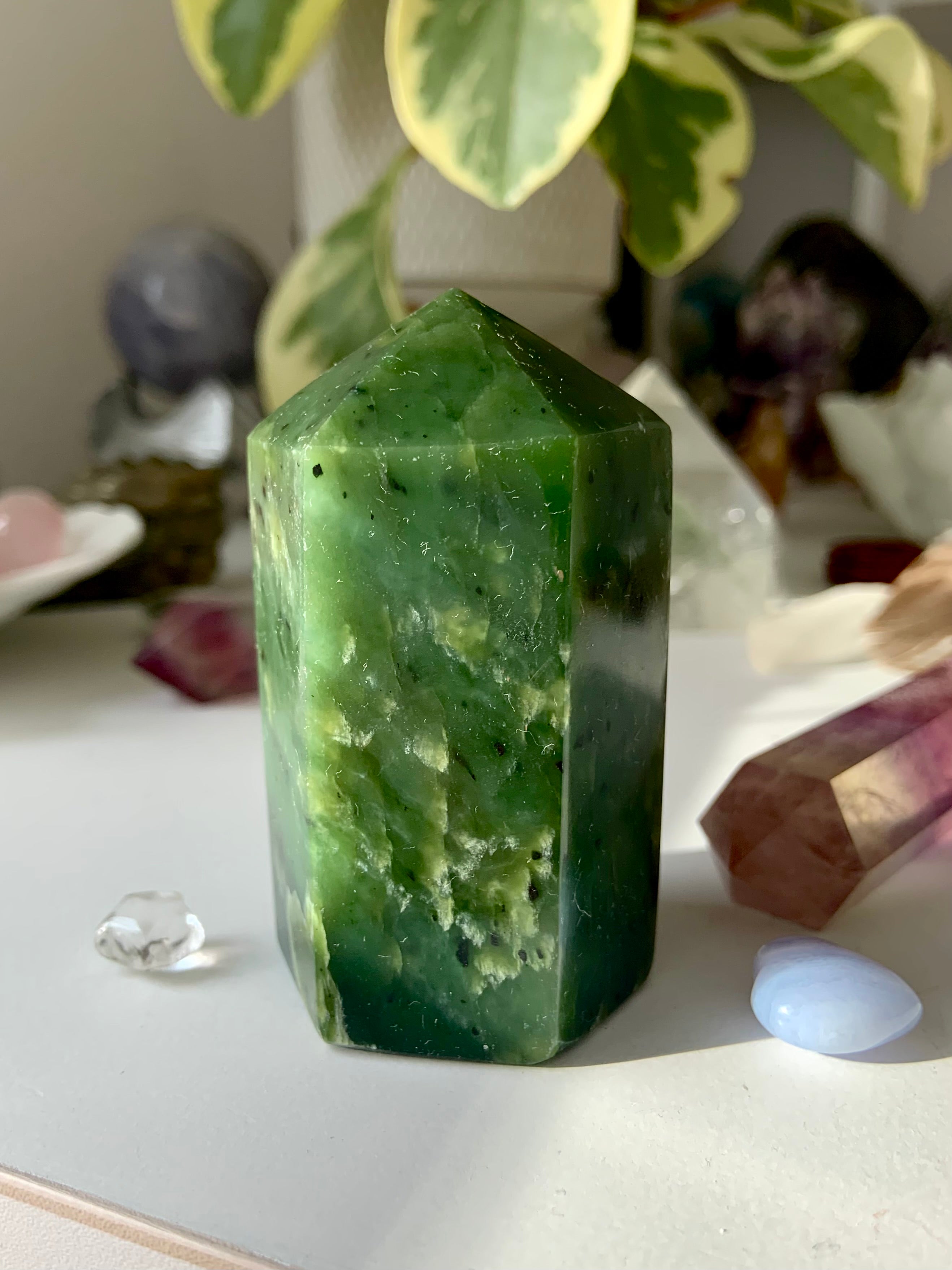 This collection includes one-of-a-kind Jade towers and carvings, white Jade Quan Yin and dragon statues, blue water Jade stars, and a rotating selection of bracelets, necklaces, and Nephrite Jade specimens. Whether you’re drawn to Jade for abundance rituals, heart-centered healing, or sacred decor, these timeless pieces bring grounding beauty to every space.