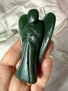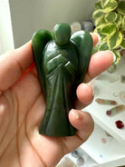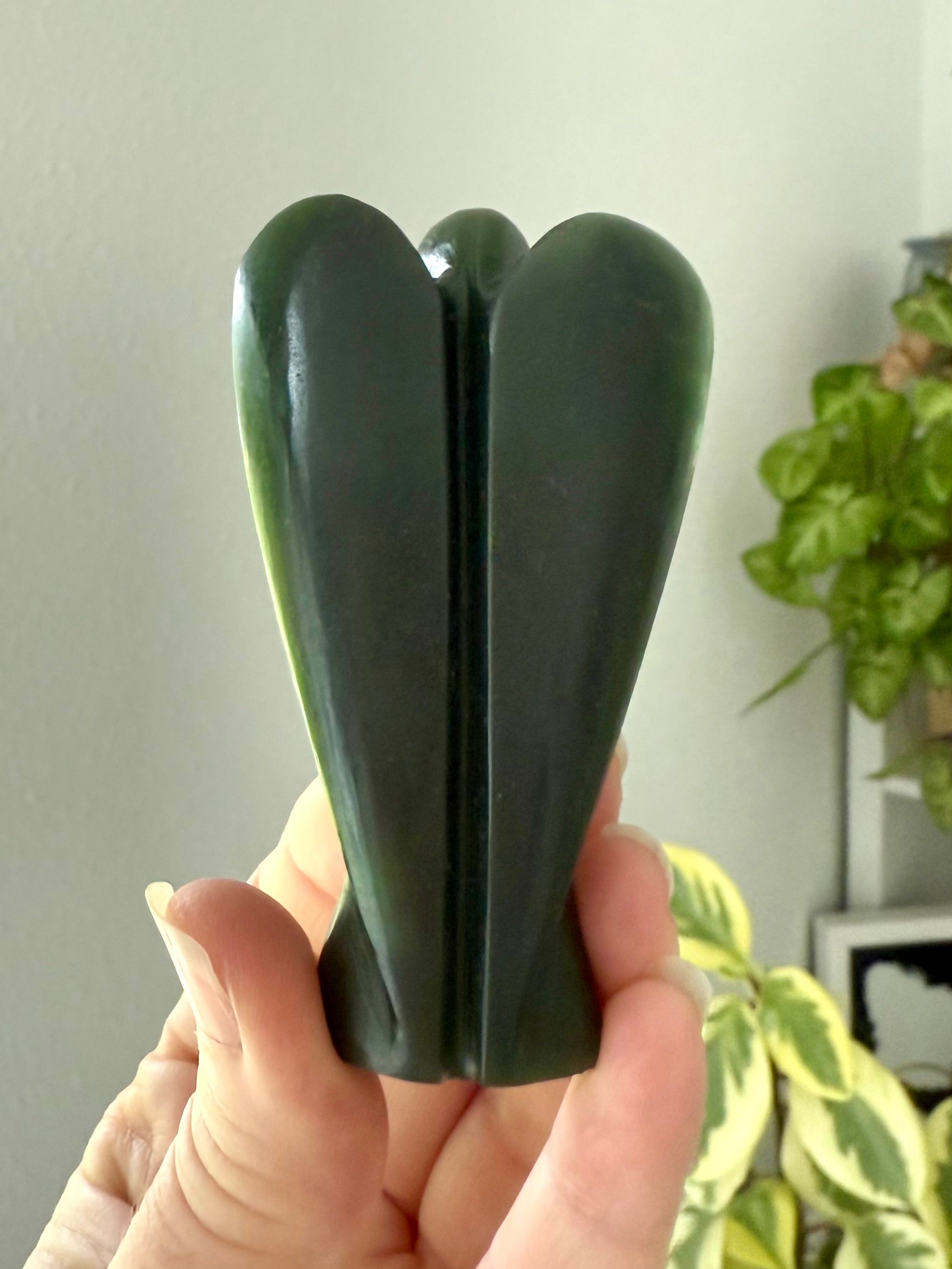 This one of a kind, Nephrite Jade Angel Figurine adds some very special heart-healing angelic energy to your crystal collection. This Jade Angel is hand carved from a deeply saturated sage green Nephrite Jade by a fair trade artisan collective in India.