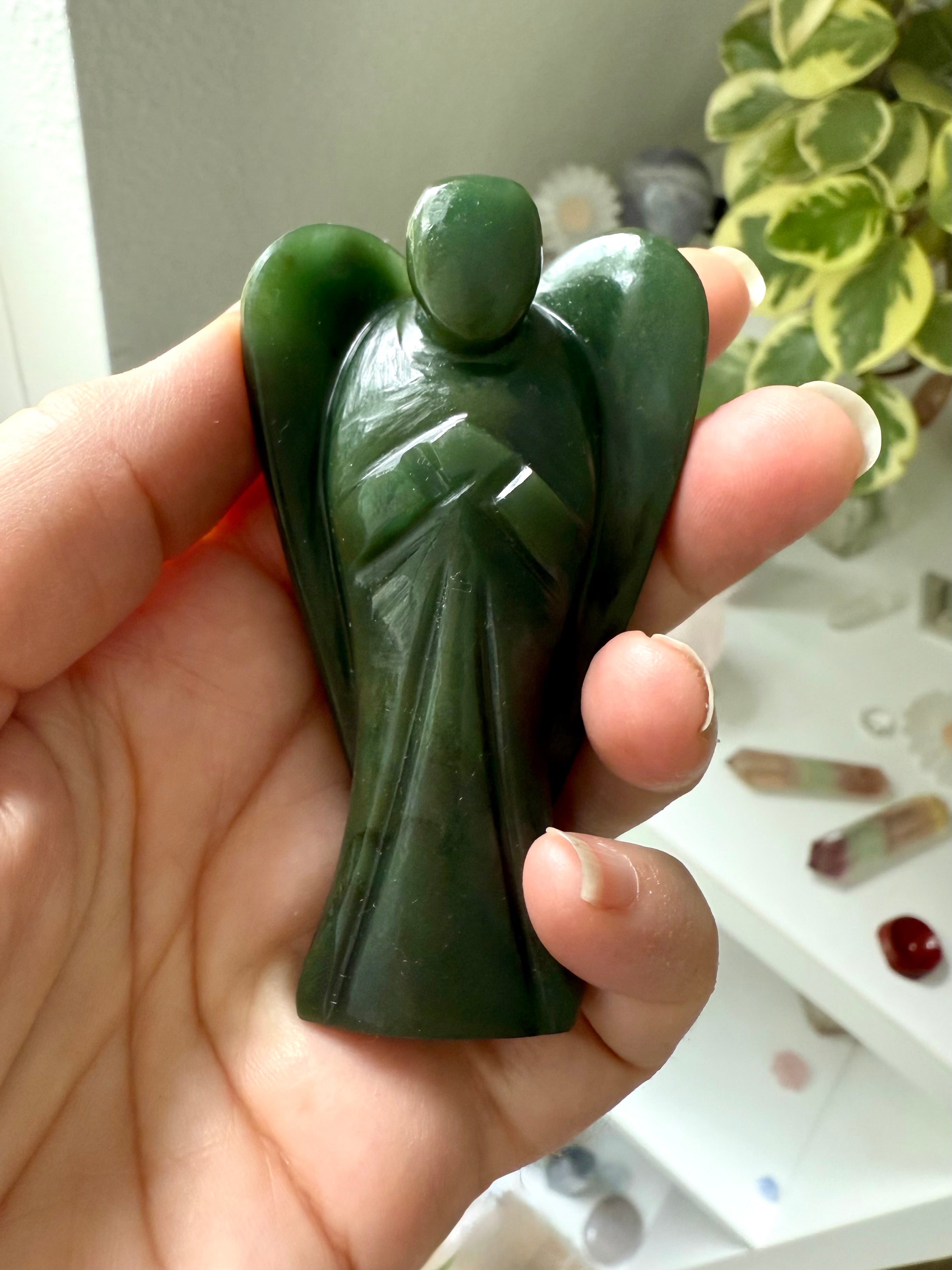 You will receive the exact stone Angel that you see in the pictures. This carved piece of jade is a natural gift from Gaia with unique variances in the stone.