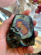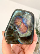 Play around with different lighting + angles to bring out the flash in this beautiful hand-shaped labradorite crystal specimen.