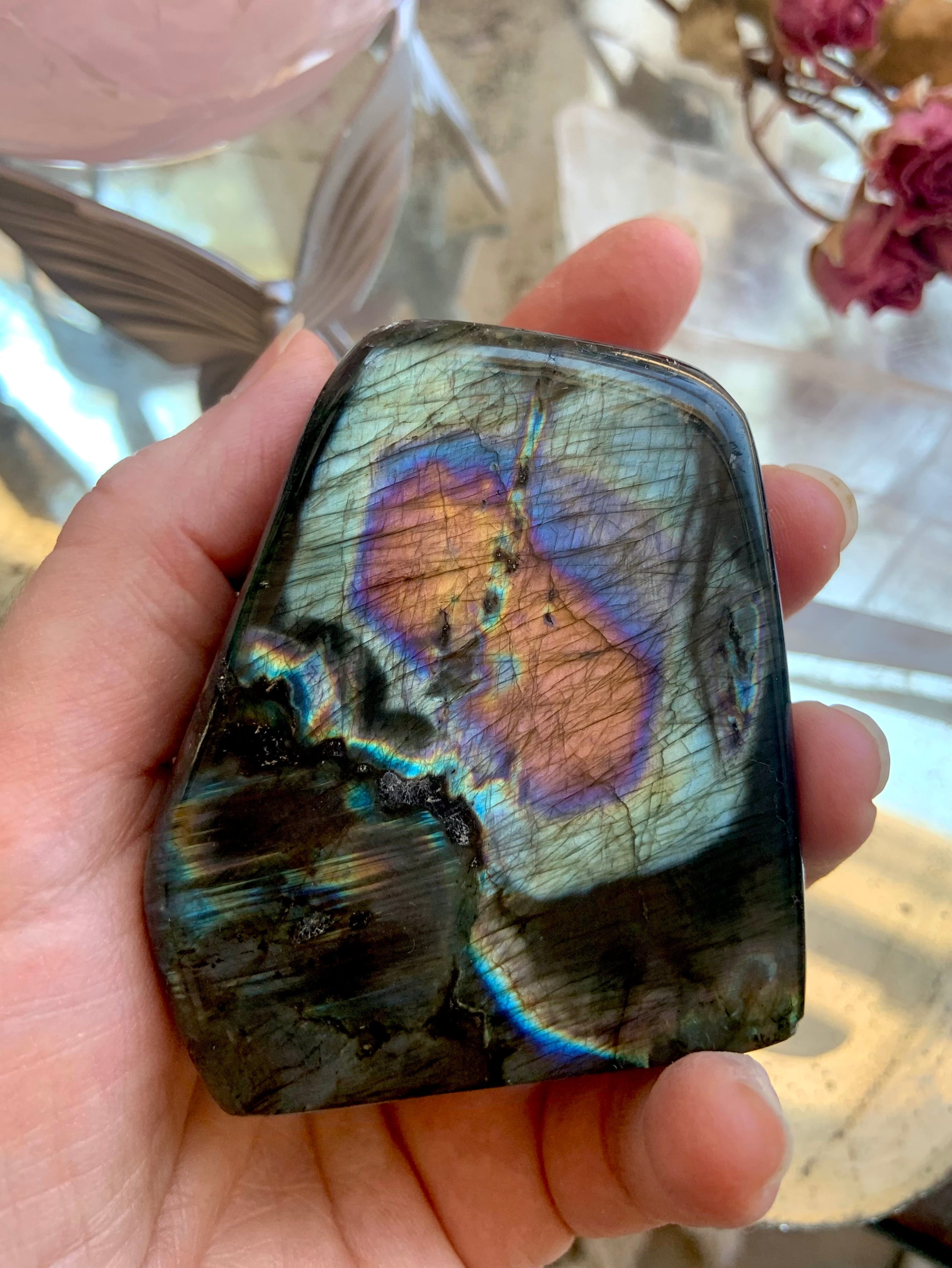 Natural crystals may have inherent marks, mineral inclusion, or slight imperfections. Weights + measures are approximate. You will receive the exact labradorite specimen that you see in the pictures.