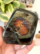 Add this super flashy freestanding polished Labradorite Freeform Crystal has a gorgeous bullseye color array of orange, pink, purple, green + blue colors with some gold + yellow highlights. It has a strong colorful flash in ambient lighting + contrasting darker slivers of silvery black + charcoal gray giving luxe dimension to the stone.