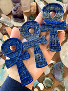 This stunning Lapis Lazuli Ankh is intricately carved with ancient Egyptian hieroglyphs in a 3D bas relief design that highlights the beauty of the natural stone.