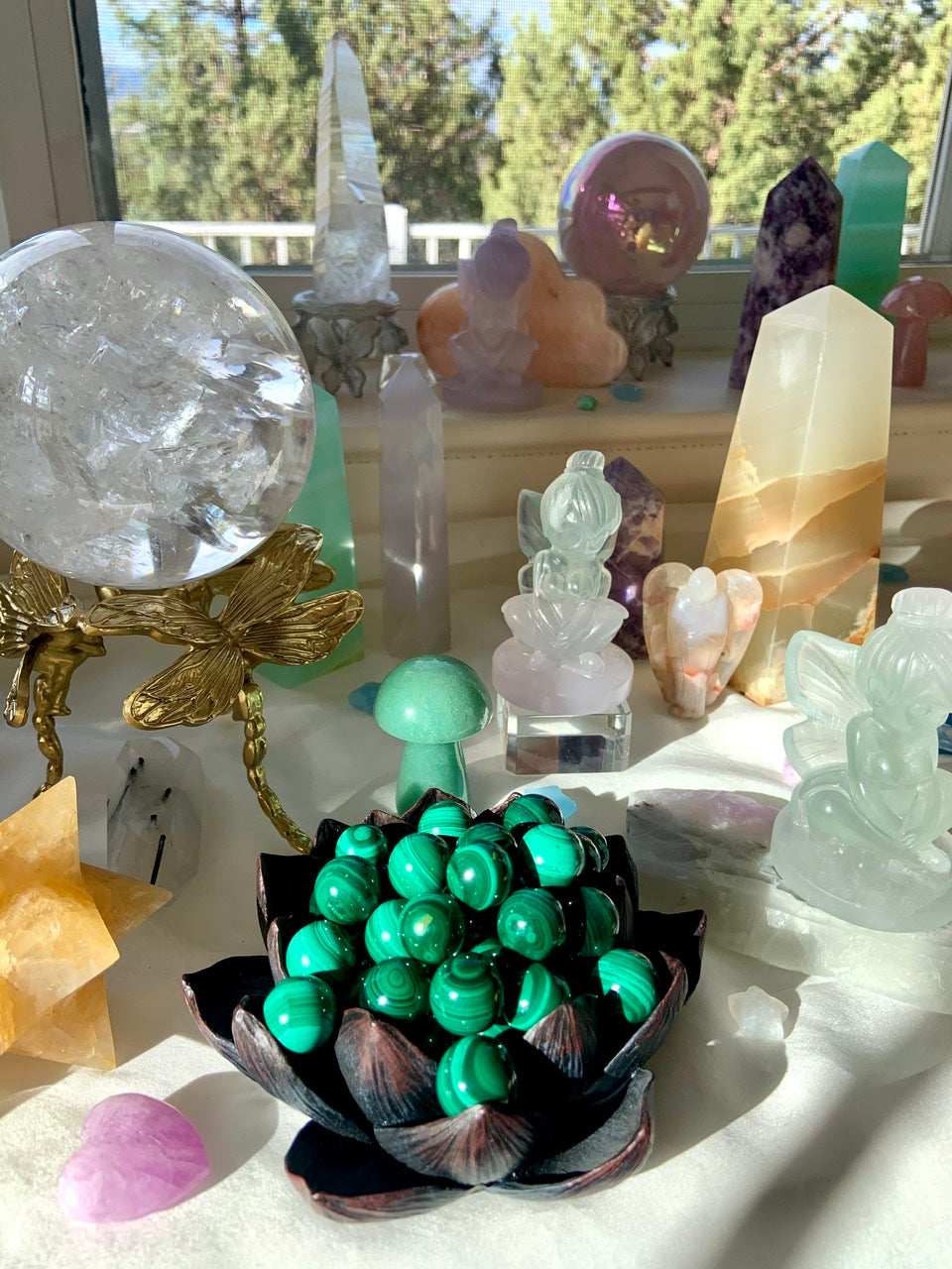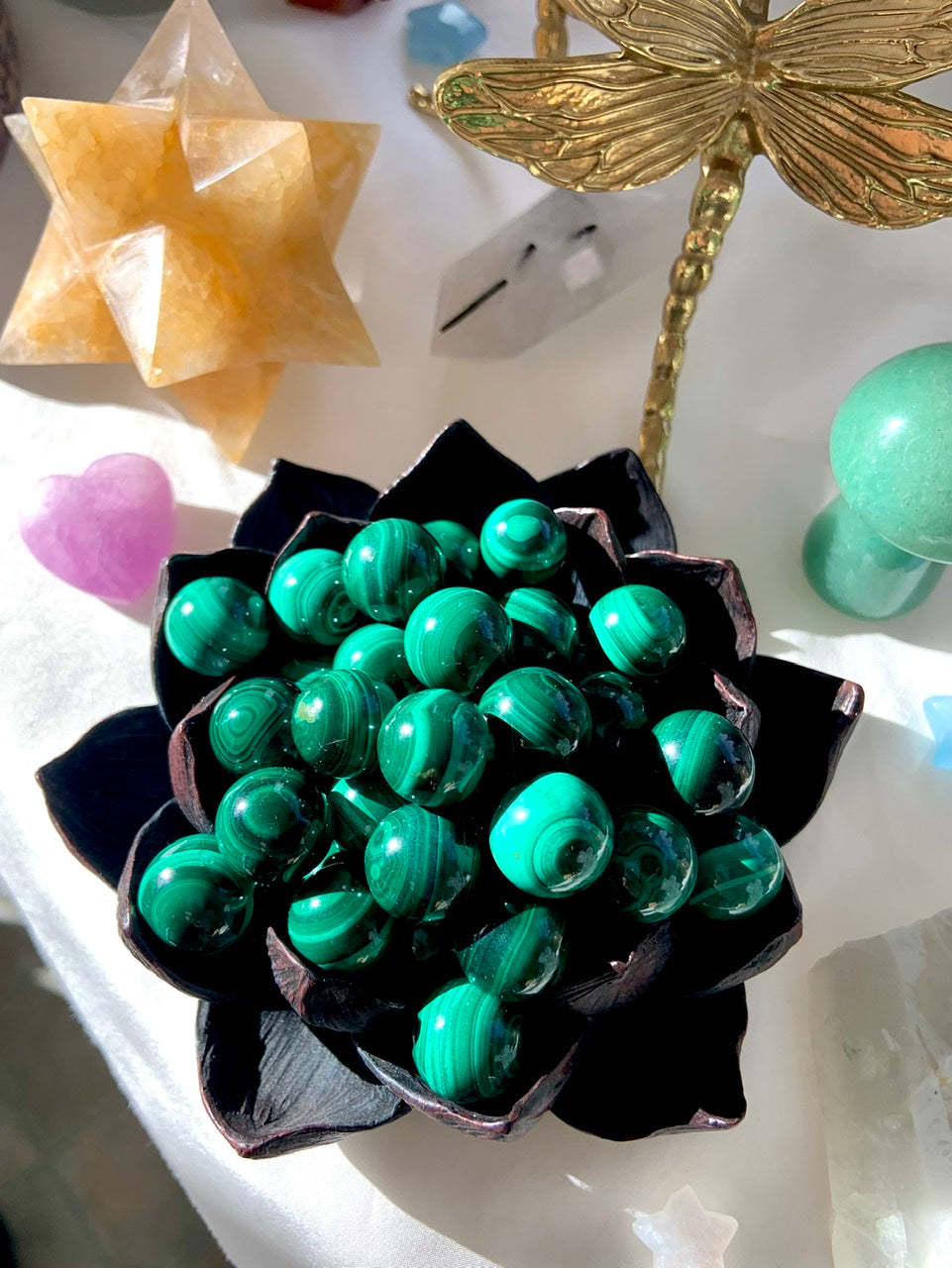 Malachite Crystals are excellent for healing the Heart, clearing the fog of confusing emotions. It stimulates your higher passions, inspires creativity + boosts one's confidence to move forward with clarity, in alignment with the frequency of joy.