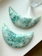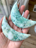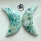 Rare Fynchenite, aka Phoenix Pine Crescent Moons are ready for their people + forever homes. These large hand carved crystal moon shapes made from a powerful green + white crystal speckled with copper ore inclusions called Phoenix Pine. Phoenix Pine is an extra special combination of Malachite, Chrysocolla + Turquoise in Quartz.