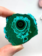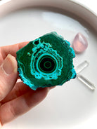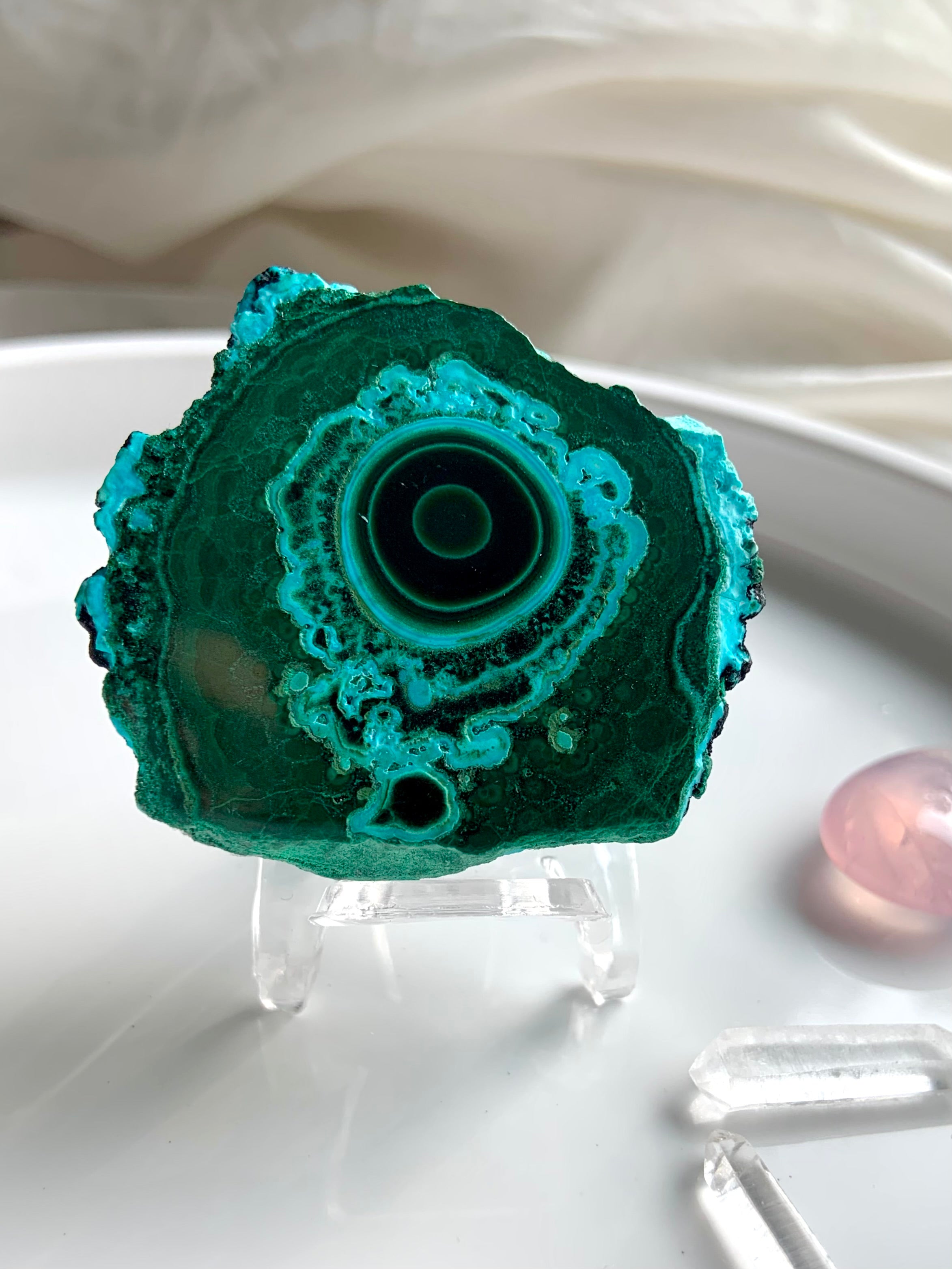 This gorgeous high quality Malachite Chrysocolla Slab with a rare, true bullseye, evil eye formation is stunning with vibrant green + blue swirling patterns + a glossy, reflective polish on the front + a bubbly natural botryoidal formation on the back.