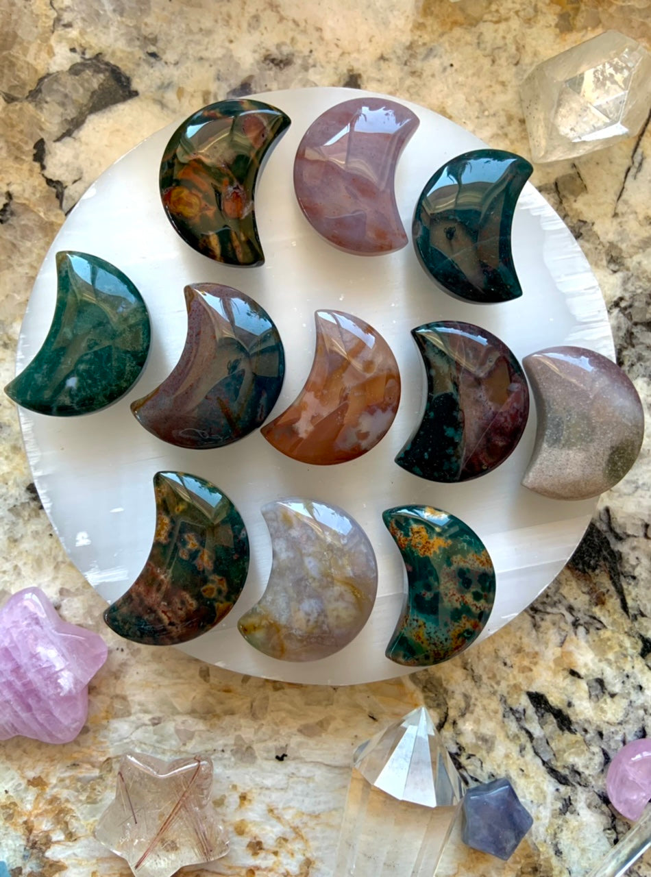 Ocean Jasper is a stone with a tremendous amount of variation in color, pattern, inclusions, transparency + opacity. Listing is for 1 ocean jasper moon intuitively chosen for you that could have any combination of traits that you see in these pictures. They look different on both sides.