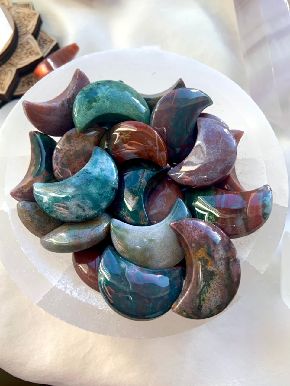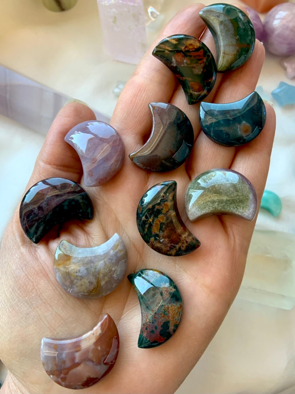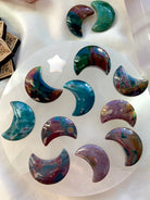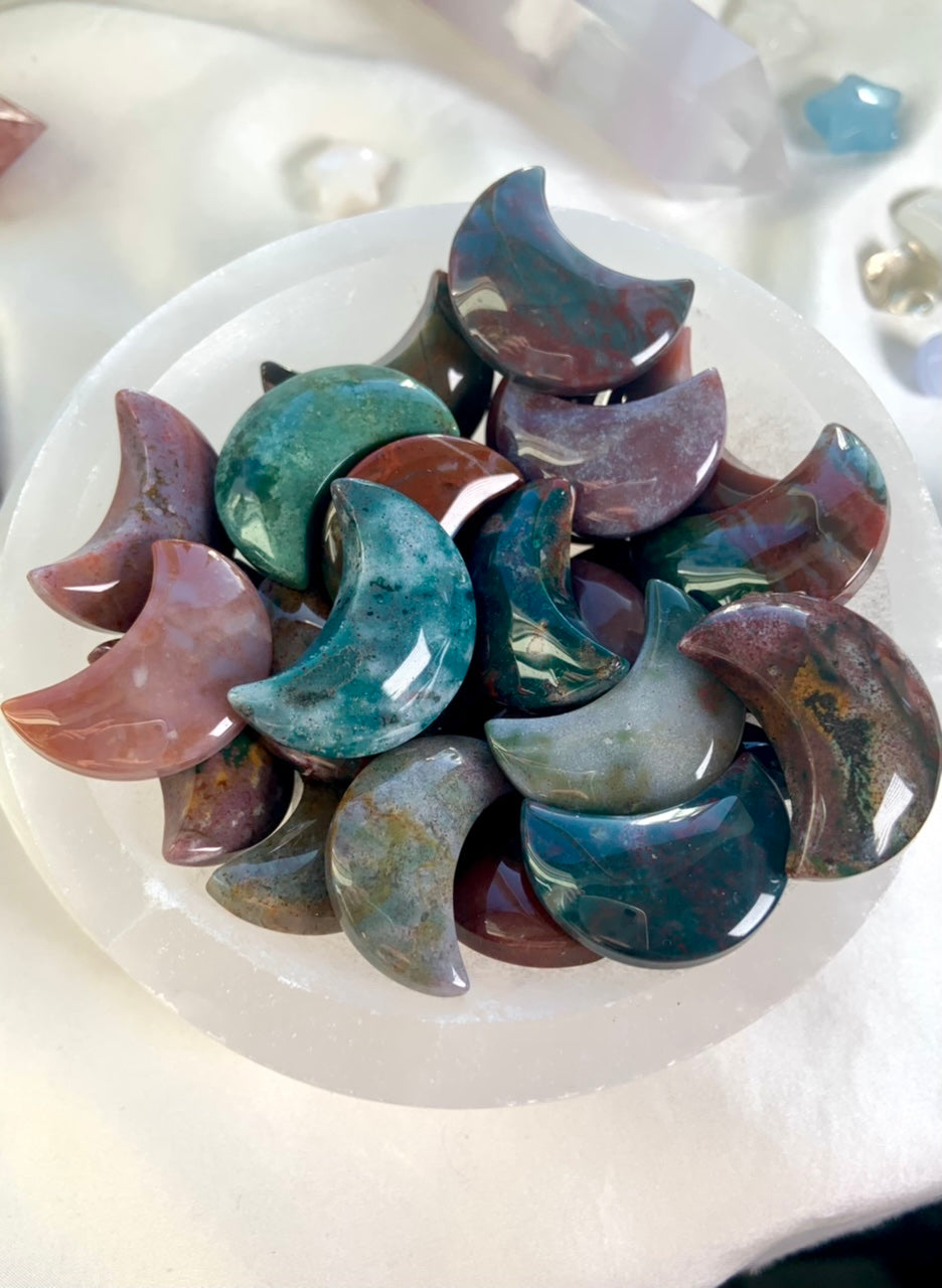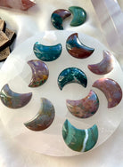 Use the pretty little Ocean Jasper Moon shapes in your crystal grids, to decorate your tarot spreads, inspire your journaling or meditation practice, moon rituals, to adorn your altar space, to accent your crystal collection, or floating in your jewelry box.