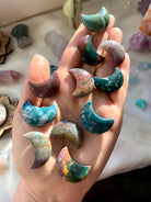 Pictures show the sizes mixed together, in different lighting. Some of the moons are sharper/thinner crescents, others are more full crescent shape. These crystals are natural gifts from Gaia with unique variances in shape, size, orbs or banding patterns, druzy, inclusions, color hue + saturation, and some are imperfect. Weights + measures are approximate.