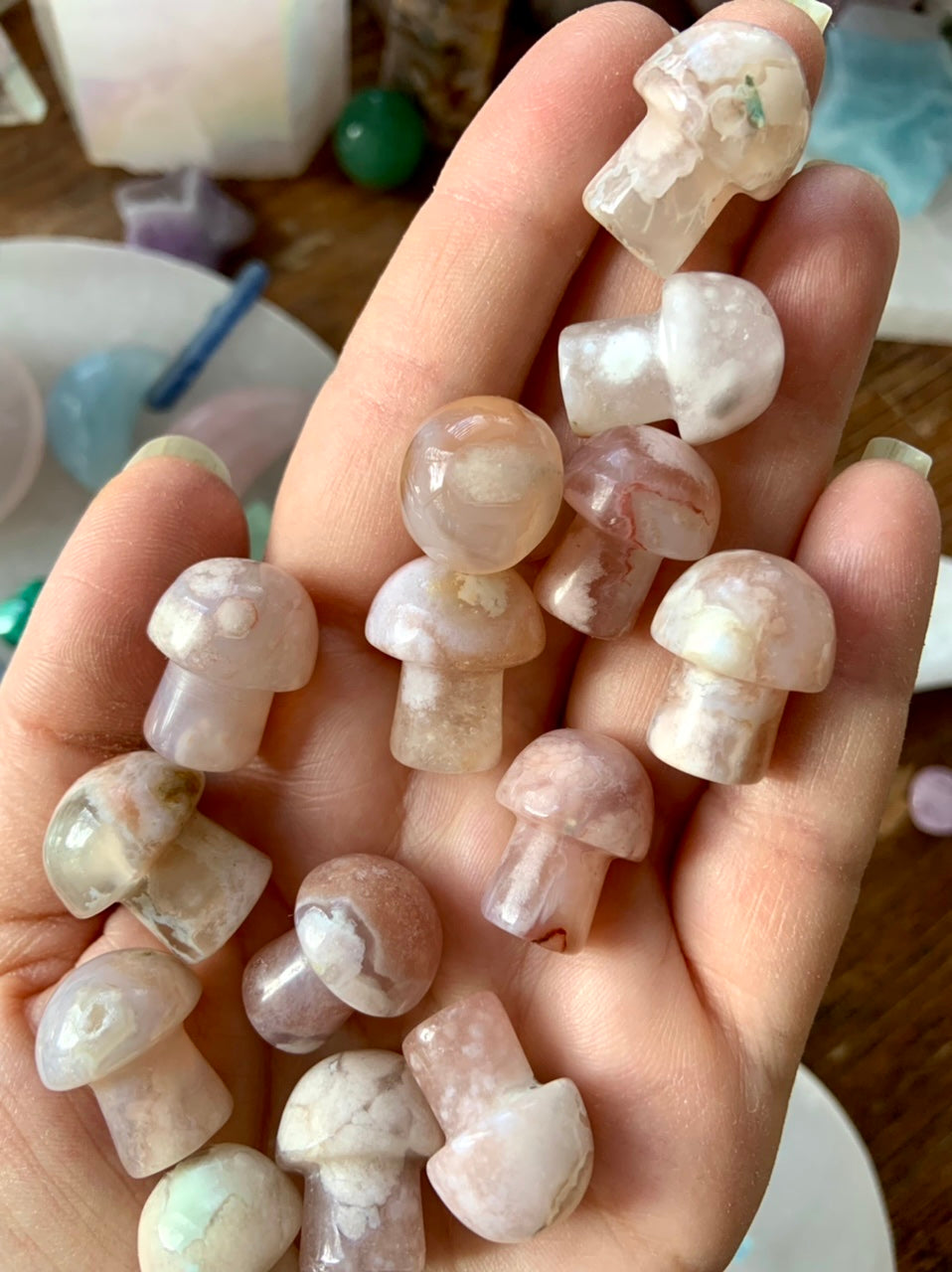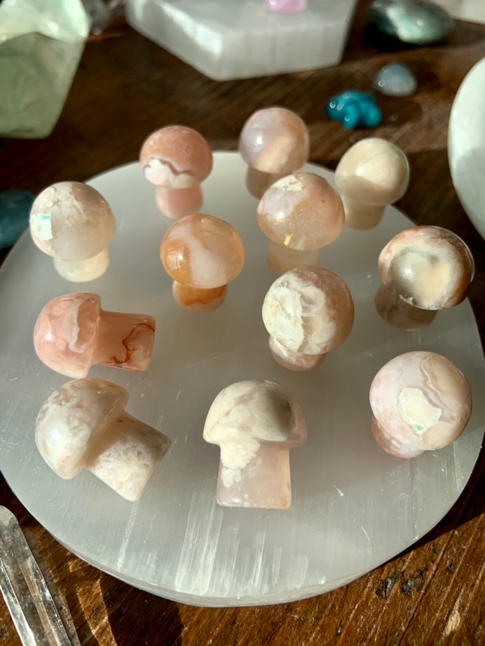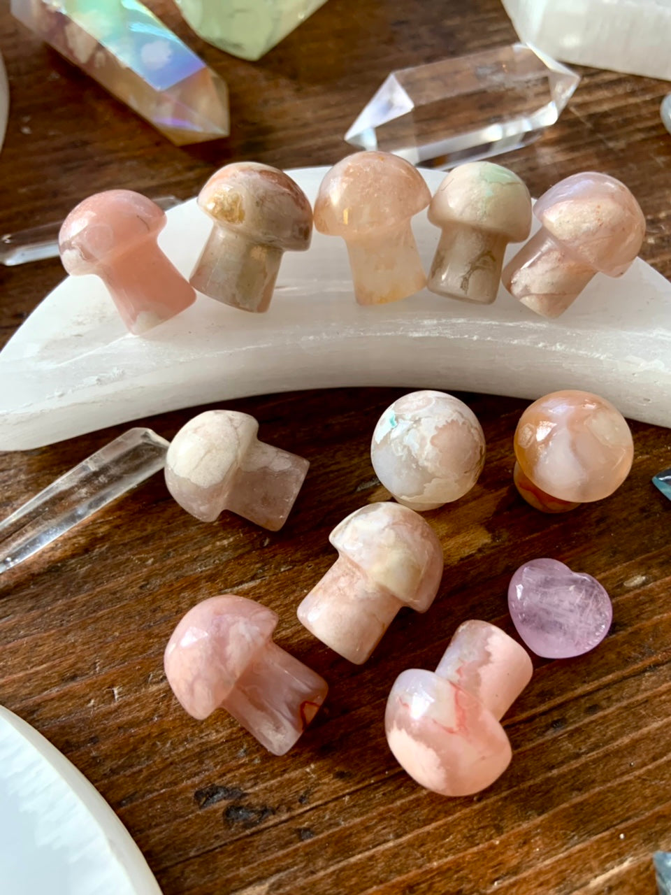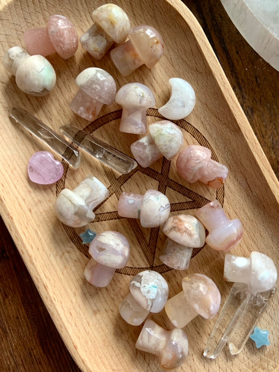 These mini flower agate mushrooms are so magical + special!! Mushrooms are symbols of longevity + good luck in many different cultures. Mushrooms have a long history in magic, fae + folklore. Mushrooms represent the unseen realms. Use your crystal mushroom carvings in your woodland theme or fairy decor, crystal grids, candle making, jewelry making projects, or as a sweet little gift for someone special.