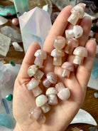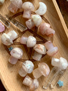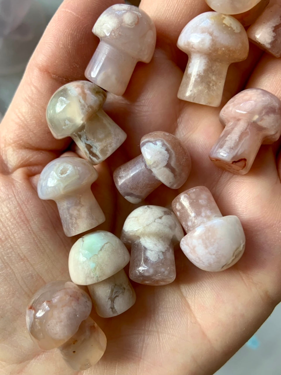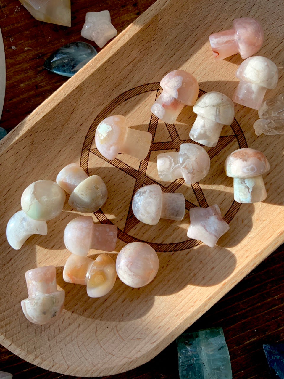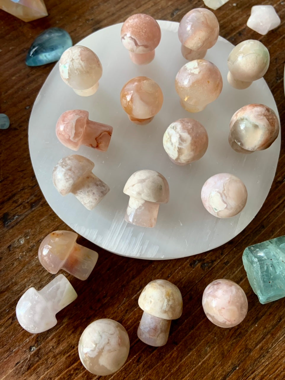 These mini flower agate mushrooms are so magical + special!! Mushrooms are symbols of longevity + good luck in many different cultures. Mushrooms have a long history in magic, fae + folklore. Mushrooms represent the unseen realms. Use your crystal mushroom carvings in your woodland theme or fairy decor, crystal grids, candle making, jewelry making projects, or as a sweet little gift for someone special.