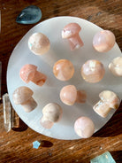 Flower Agate is a stone with a tremendous amount of variation in color, pattern, inclusions, transparency + opacity. Yours will be chosen at random + could have any combination of traits that you see in these pictures. Your mini mushie will be intuitively chosen for you.