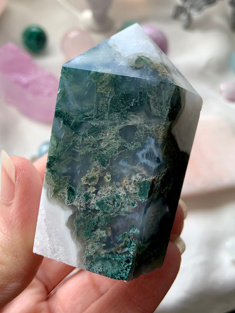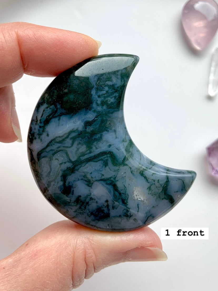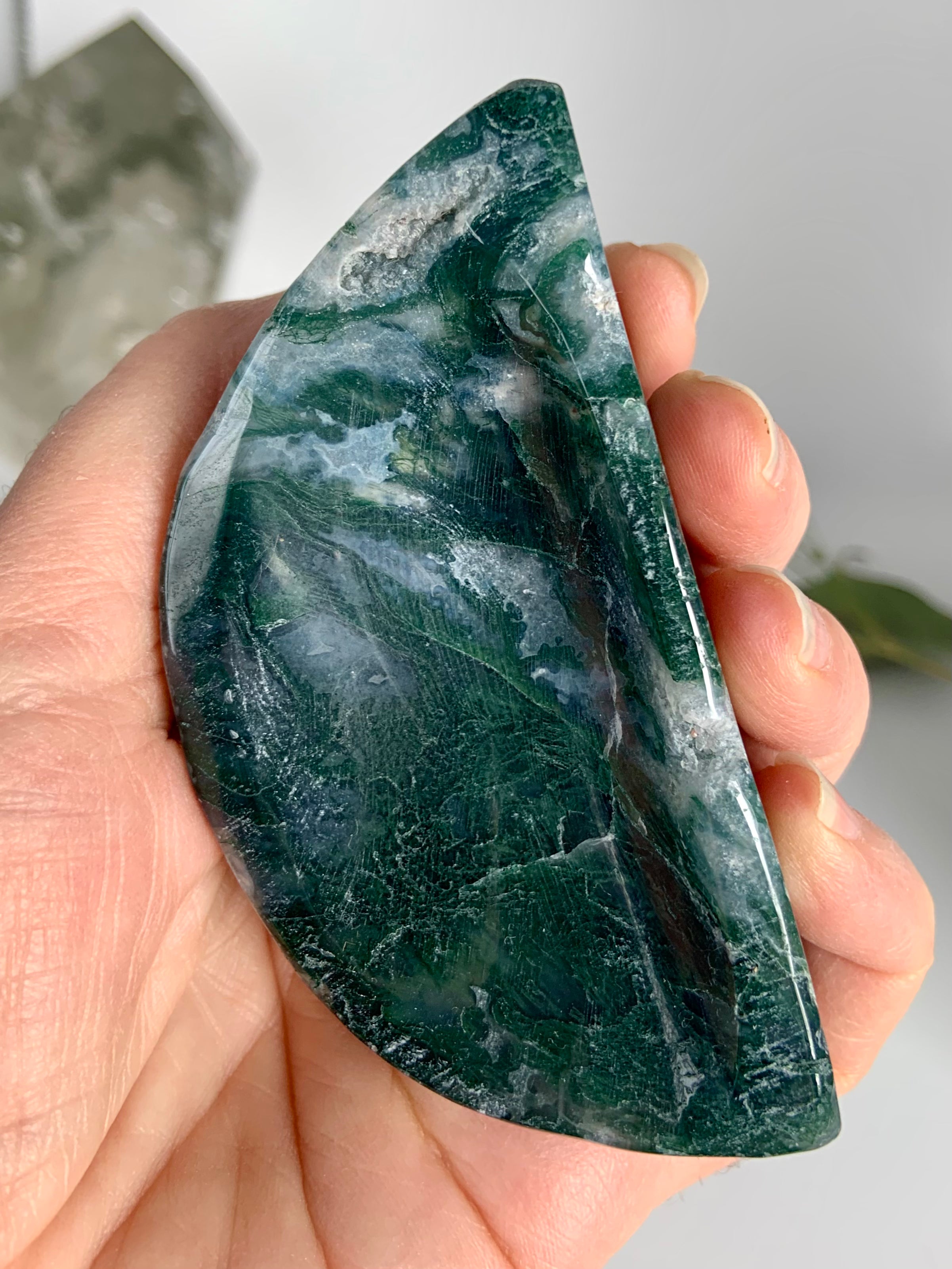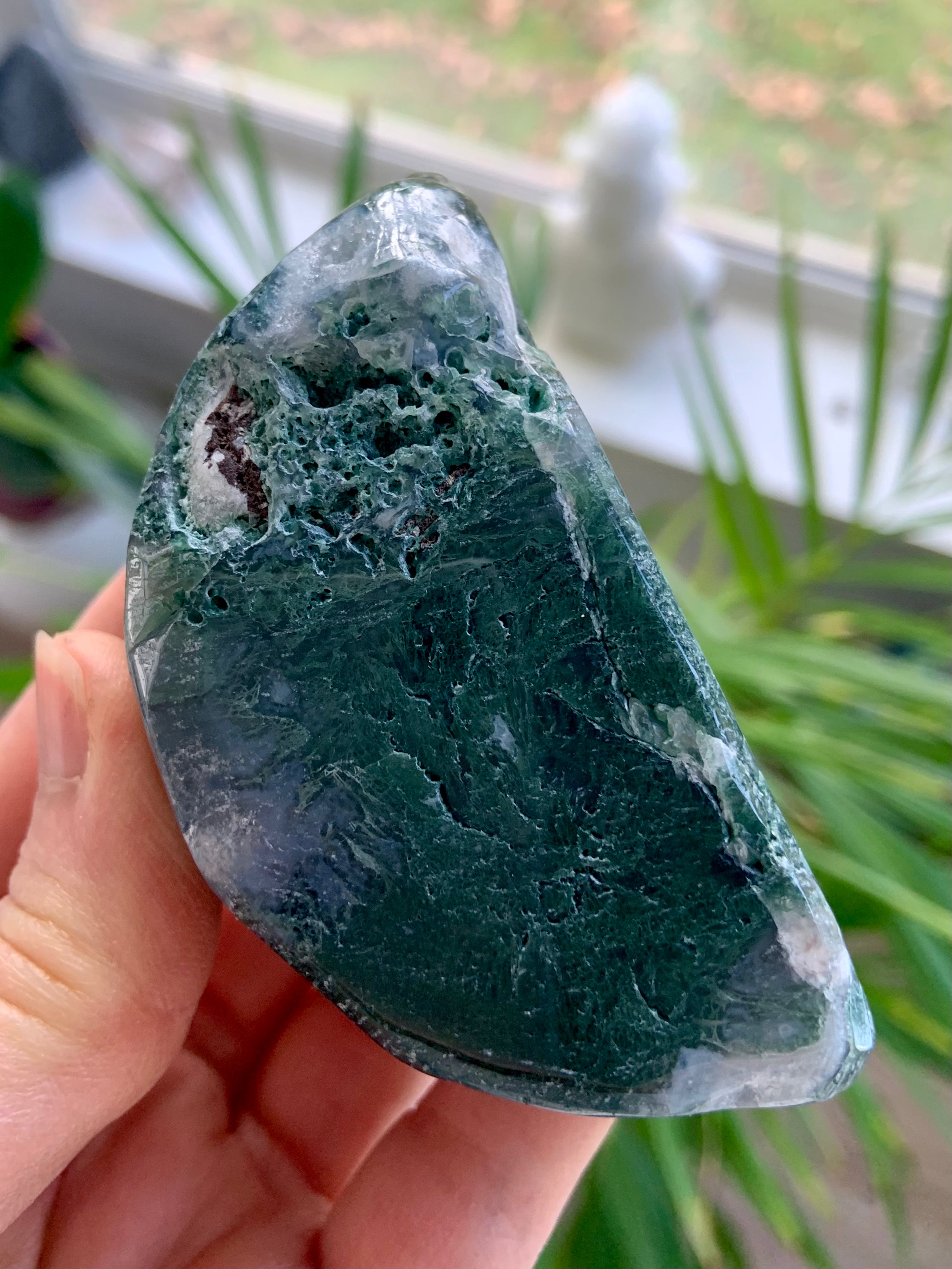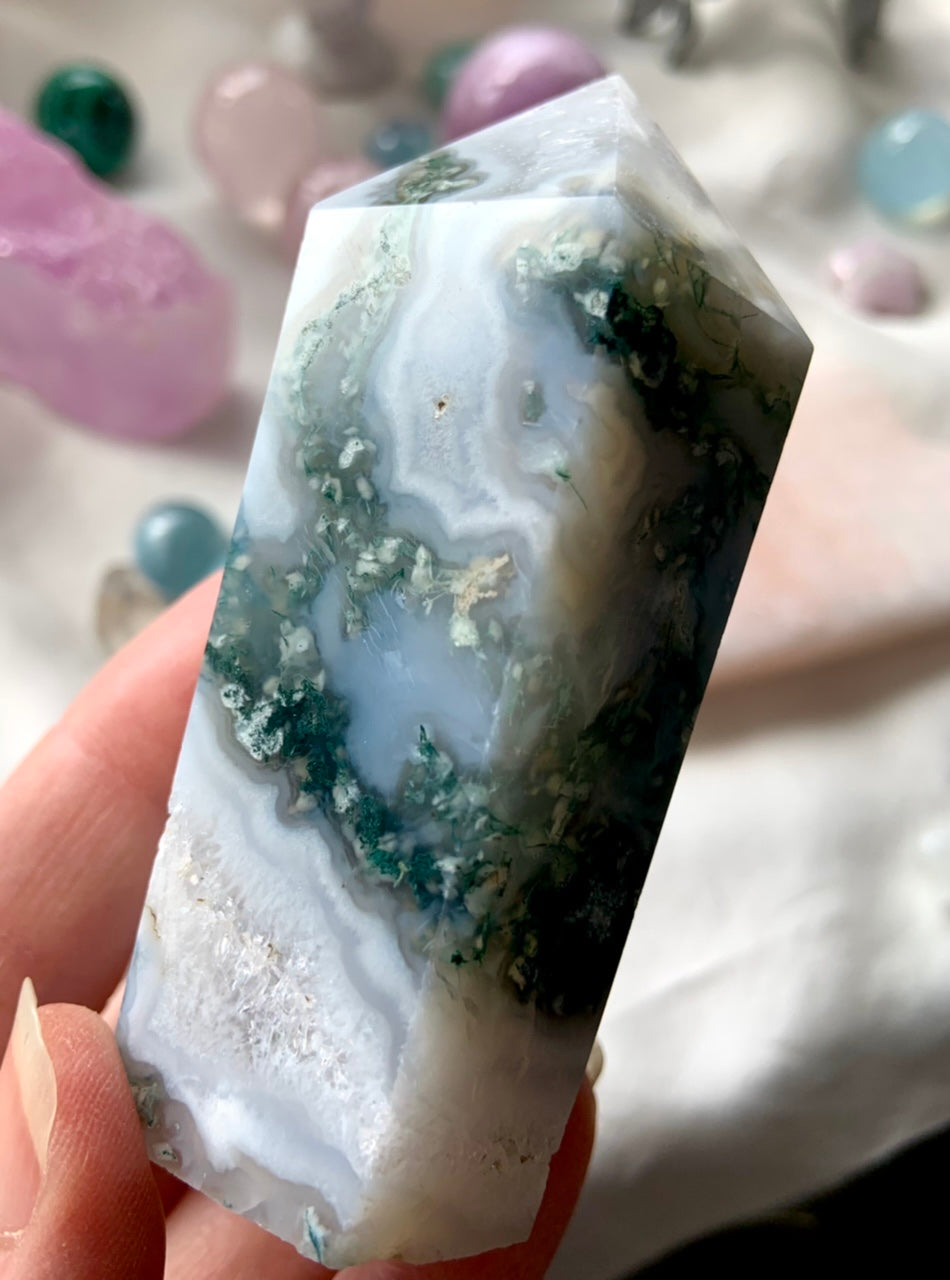 Moss Agate is a soothing Heart and Root Chakra crystal known for its connection to nature, spiritual renewal, and emotional grounding. Its lush green inclusions resemble moss, trees, and ancient forest landscapes—each stone a miniature world that invites stillness and presence.