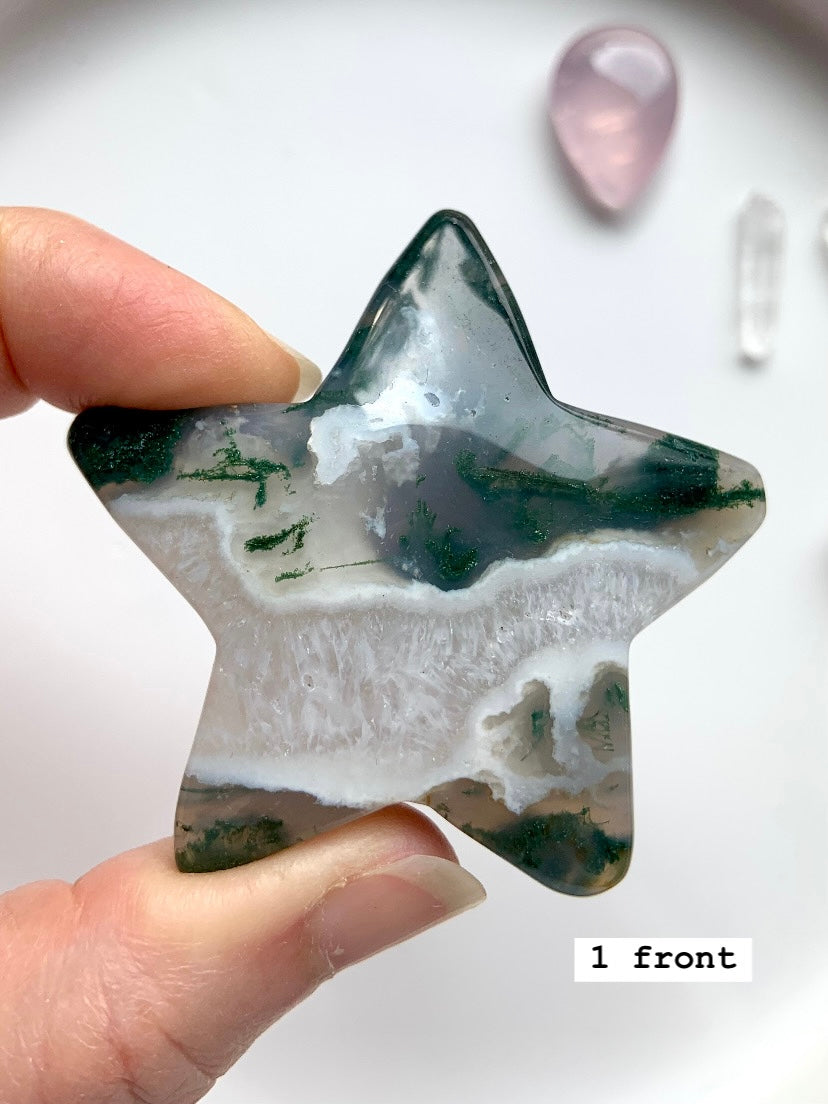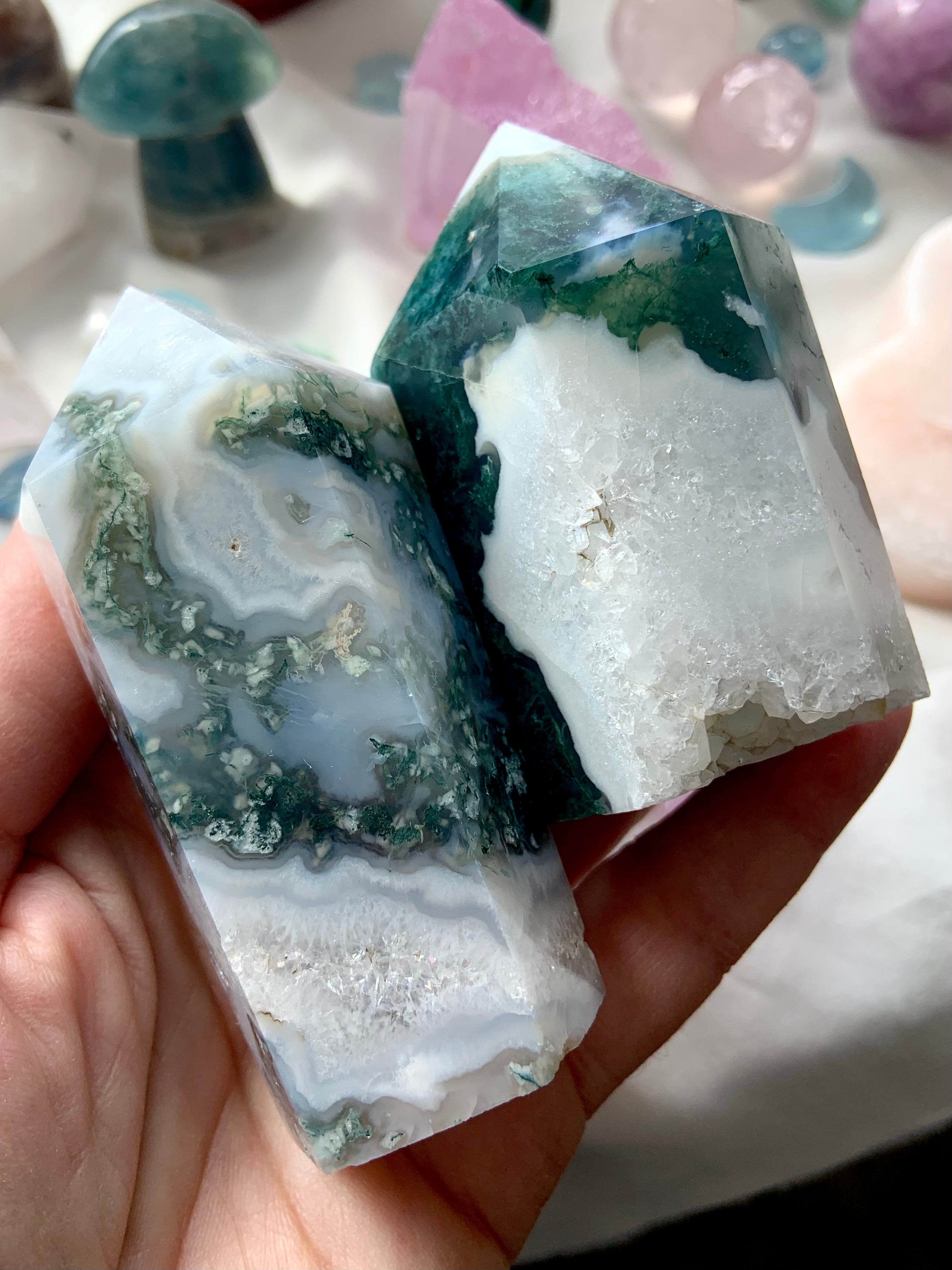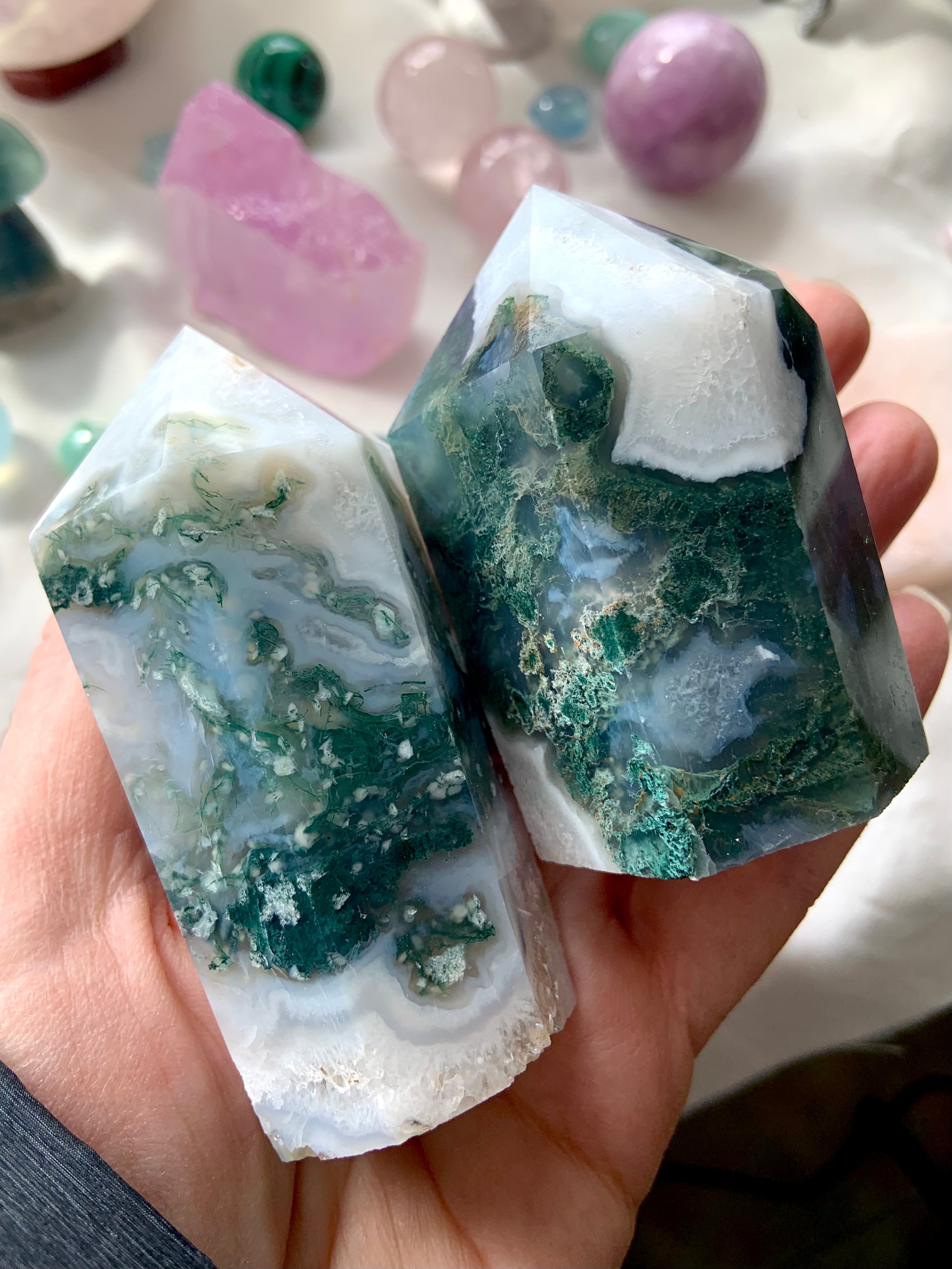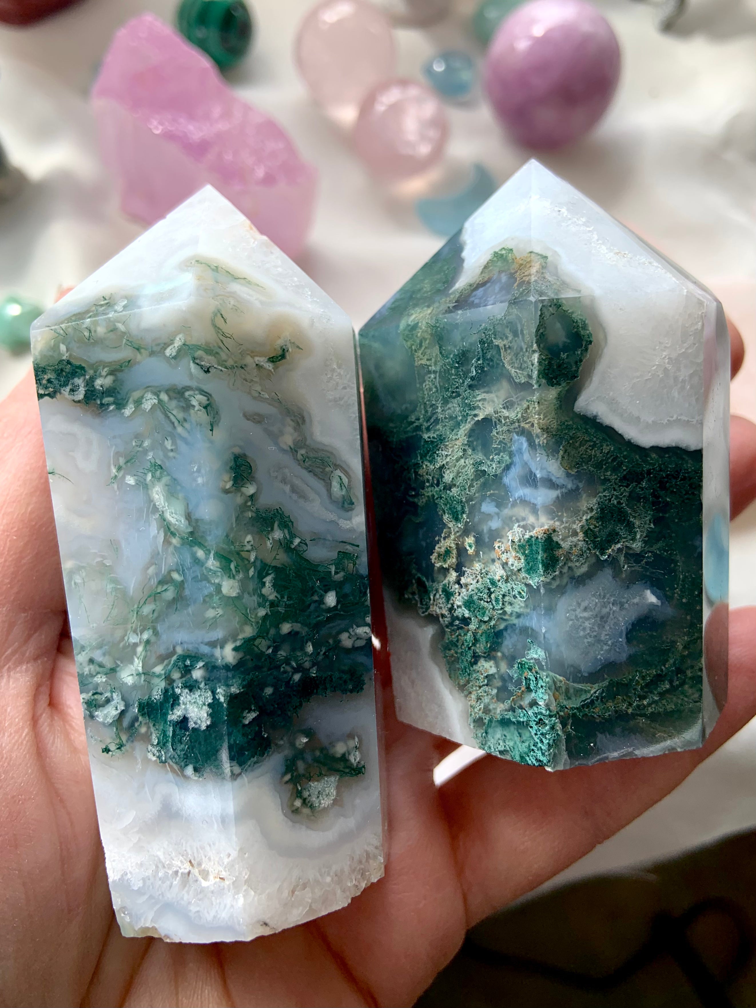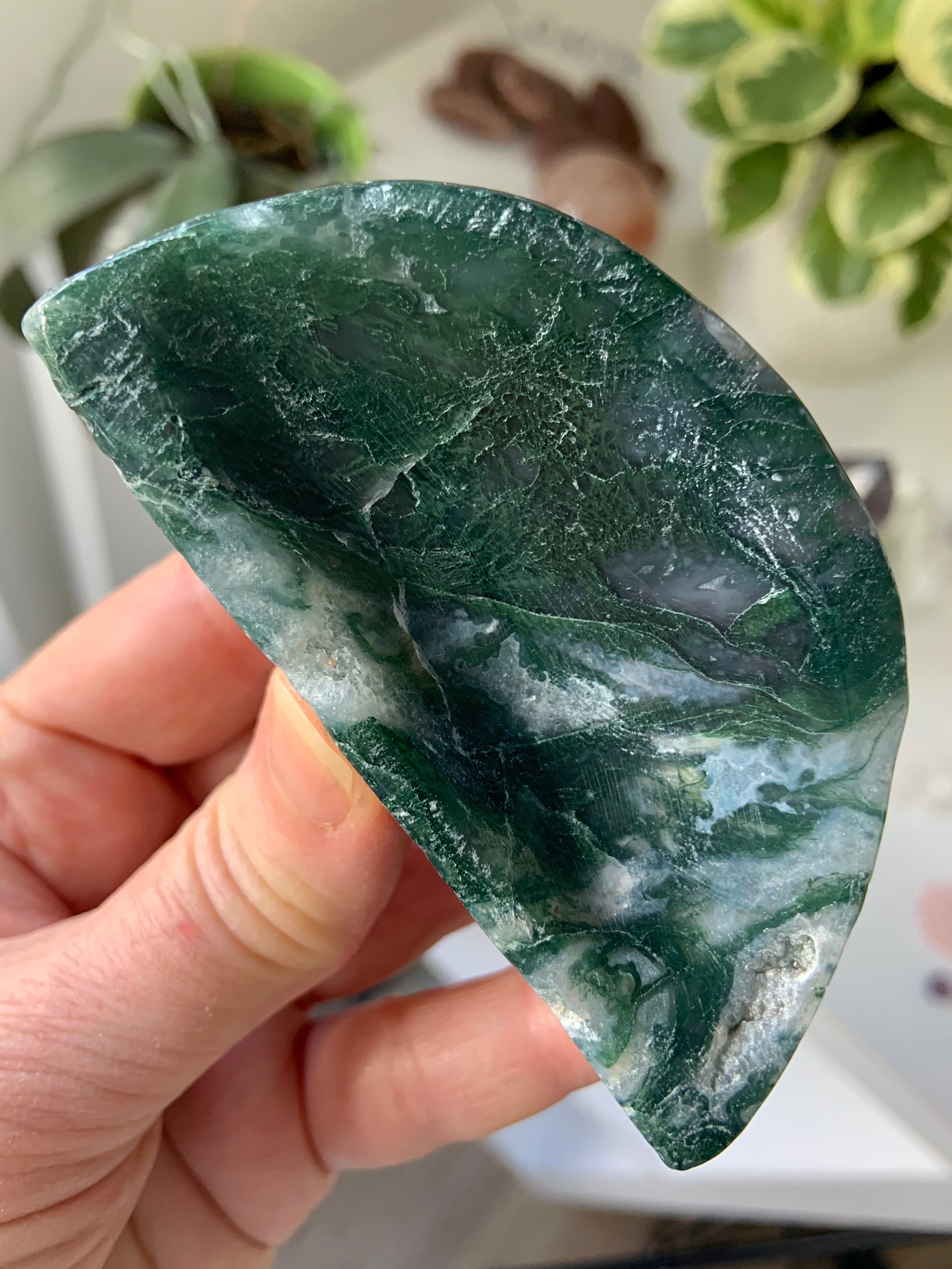 Moss Agate is a soothing Heart and Root Chakra crystal known for its connection to nature, spiritual renewal, and emotional grounding. Its lush green inclusions resemble moss, trees, and ancient forest landscapes—each stone a miniature world that invites stillness and presence.