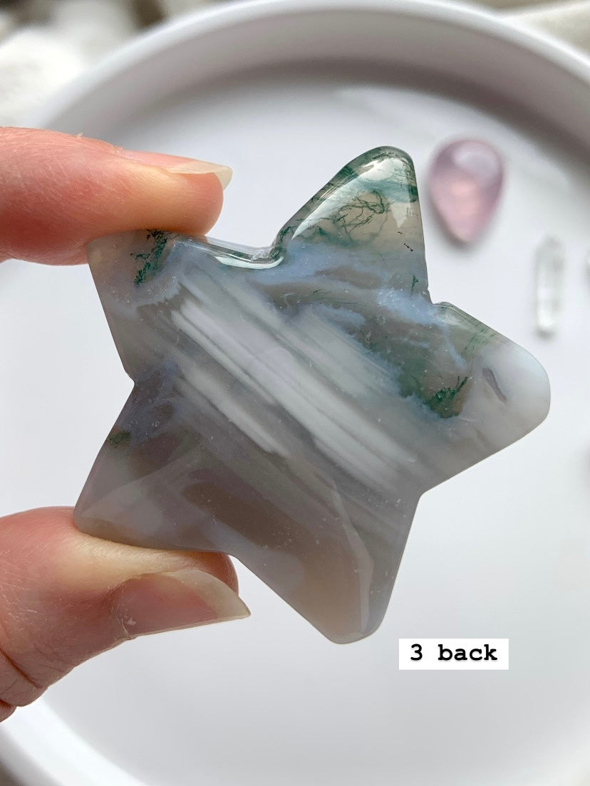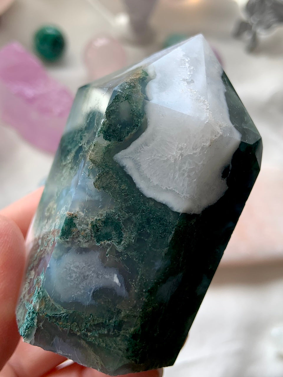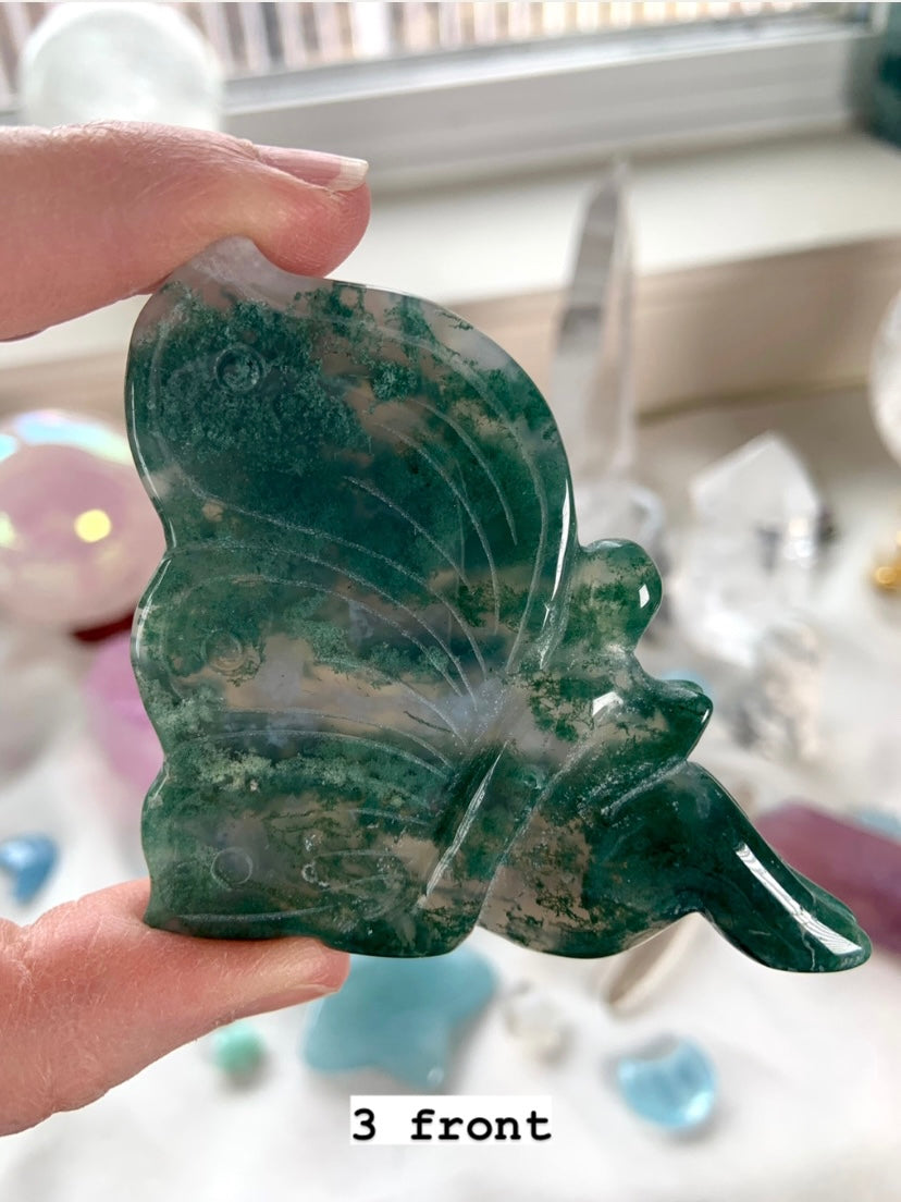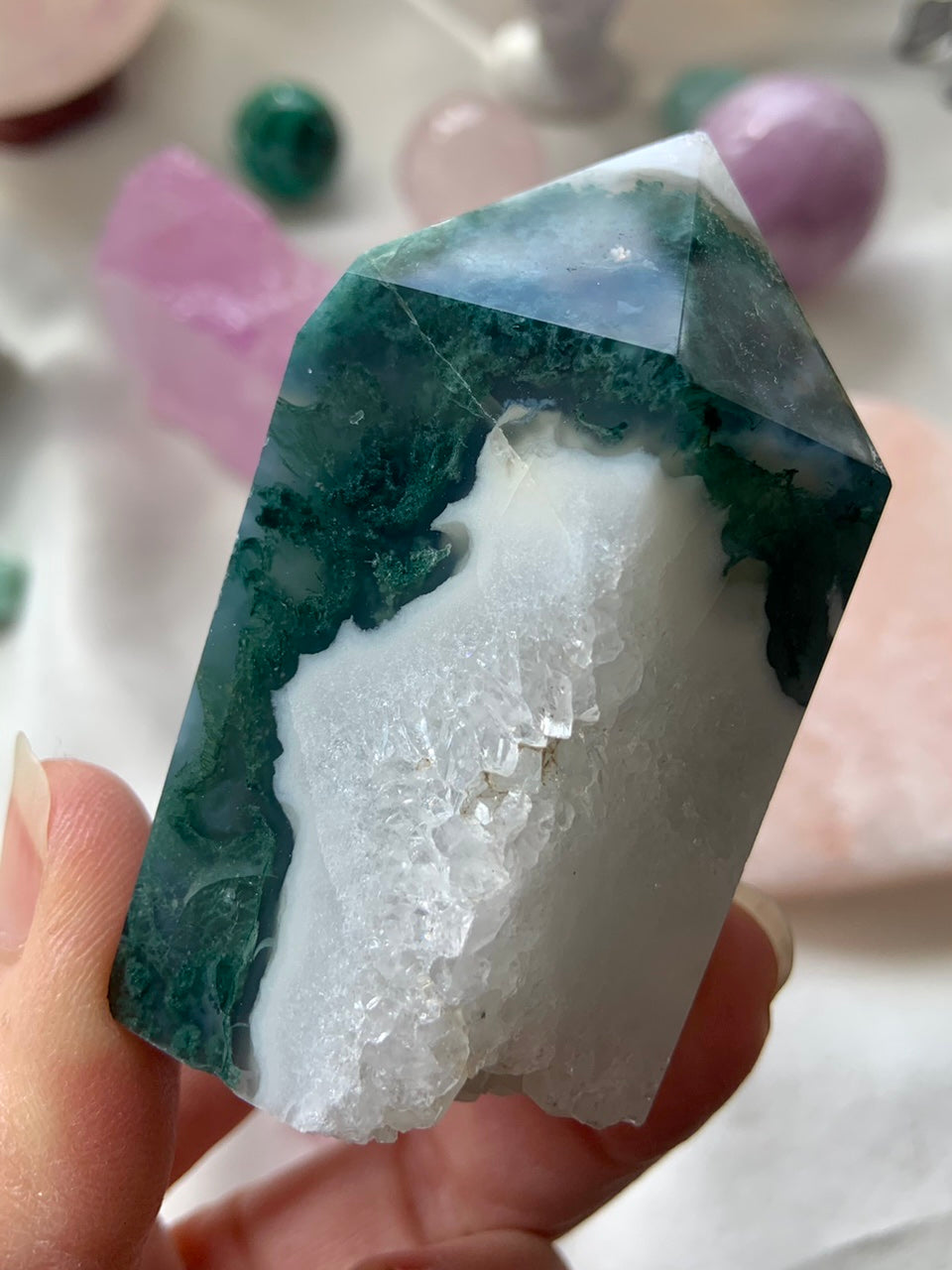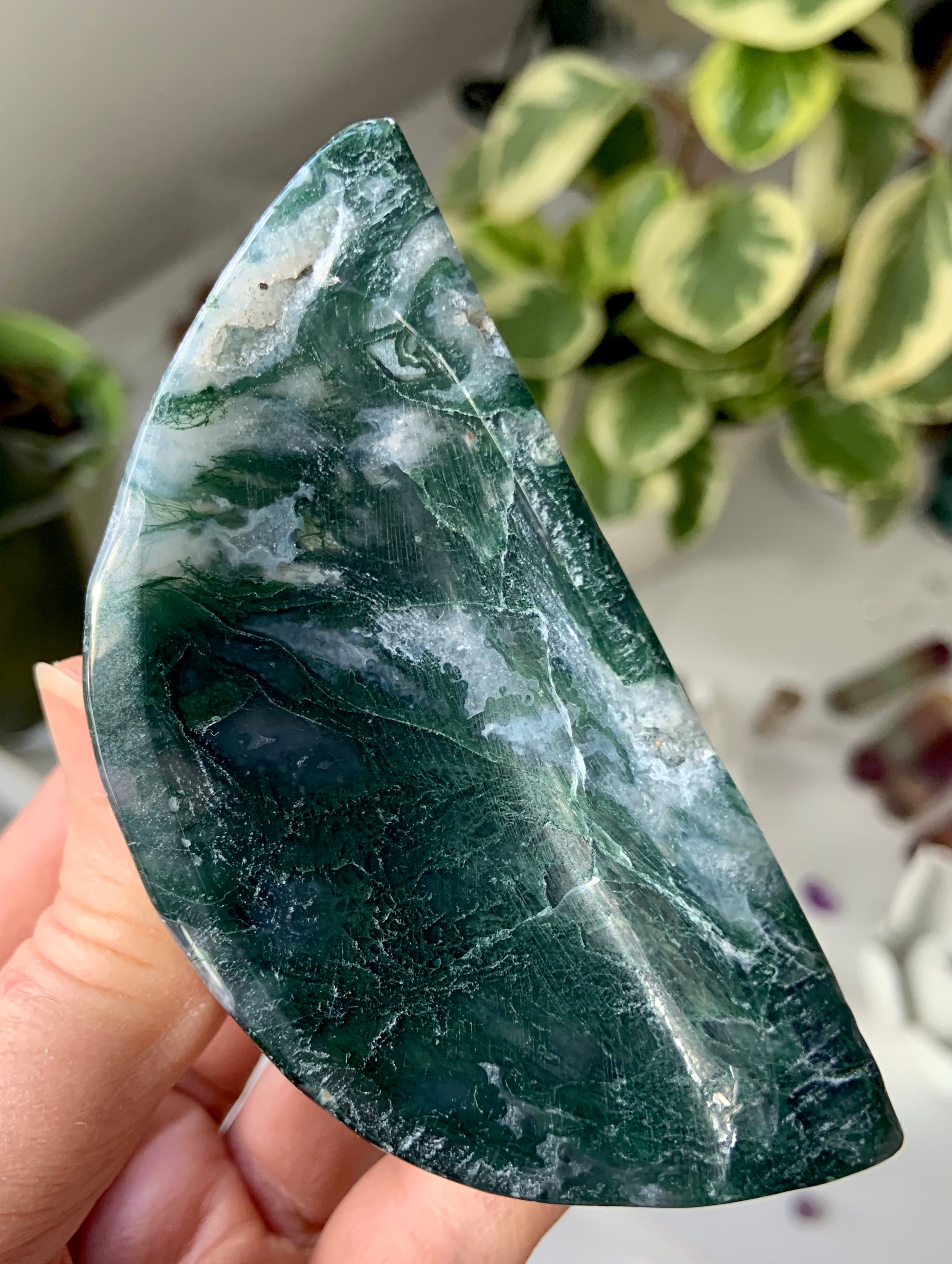 Moss Agate is a soothing Heart and Root Chakra crystal known for its connection to nature, spiritual renewal, and emotional grounding. Its lush green inclusions resemble moss, trees, and ancient forest landscapes—each stone a miniature world that invites stillness and presence.