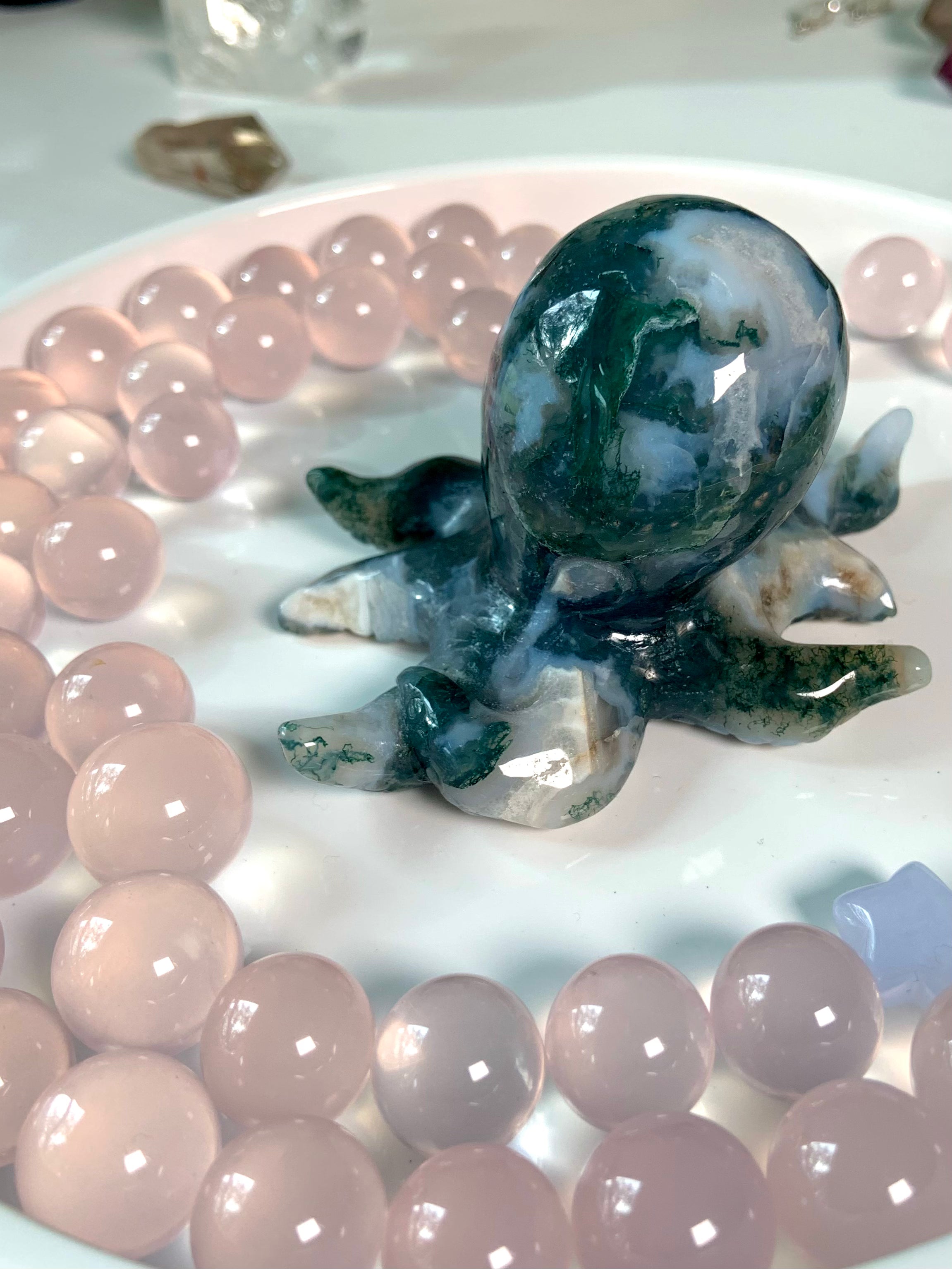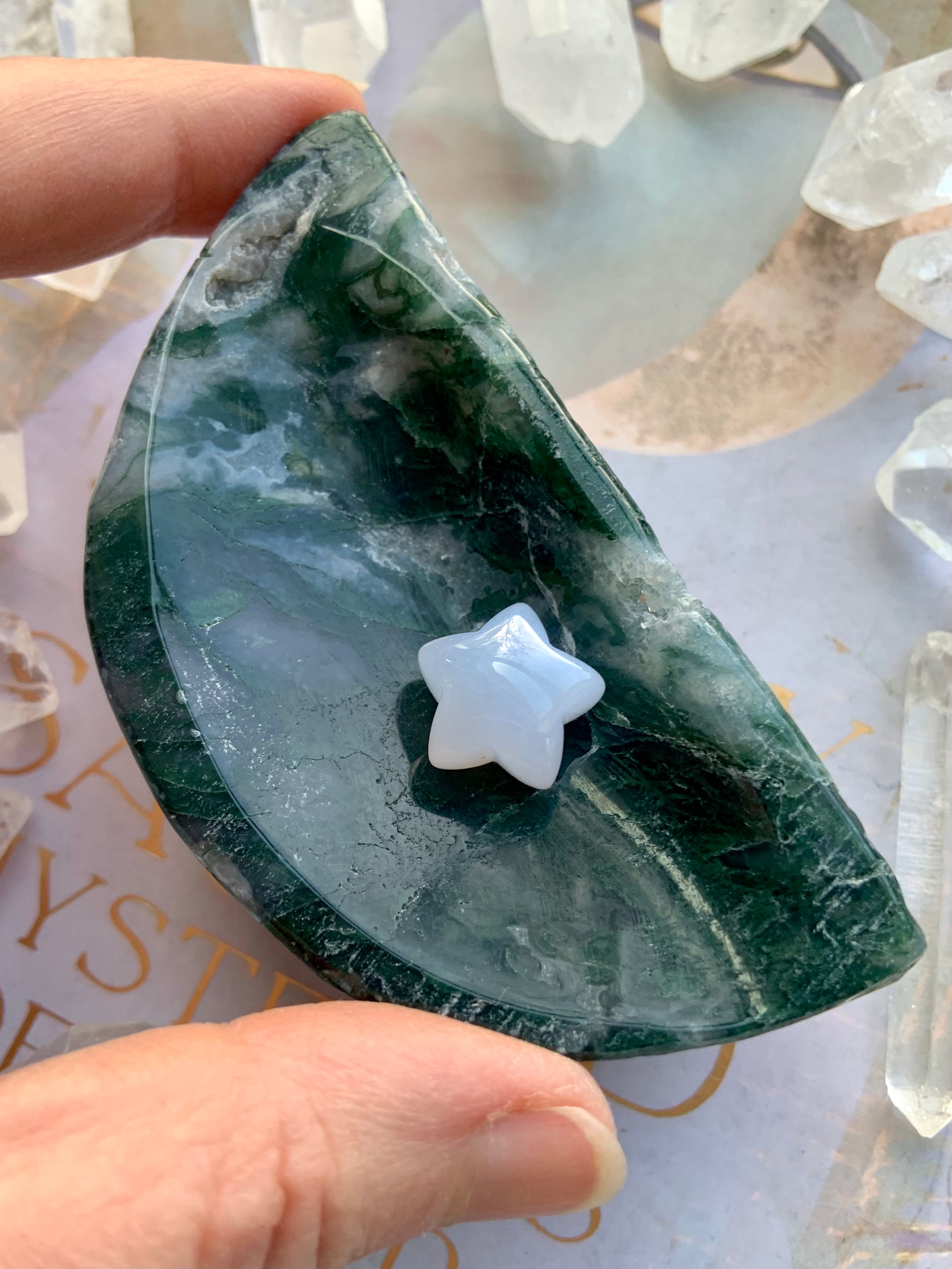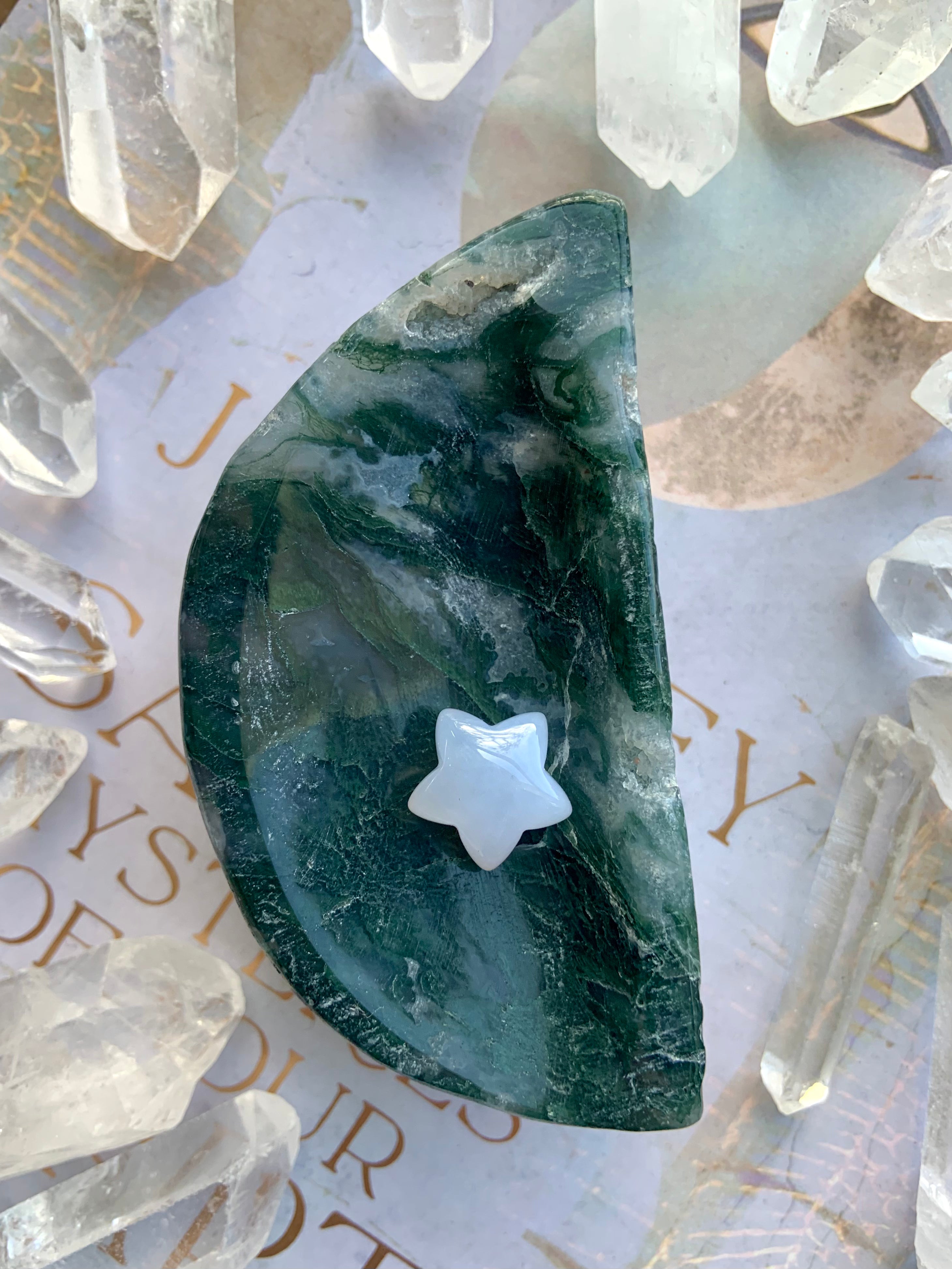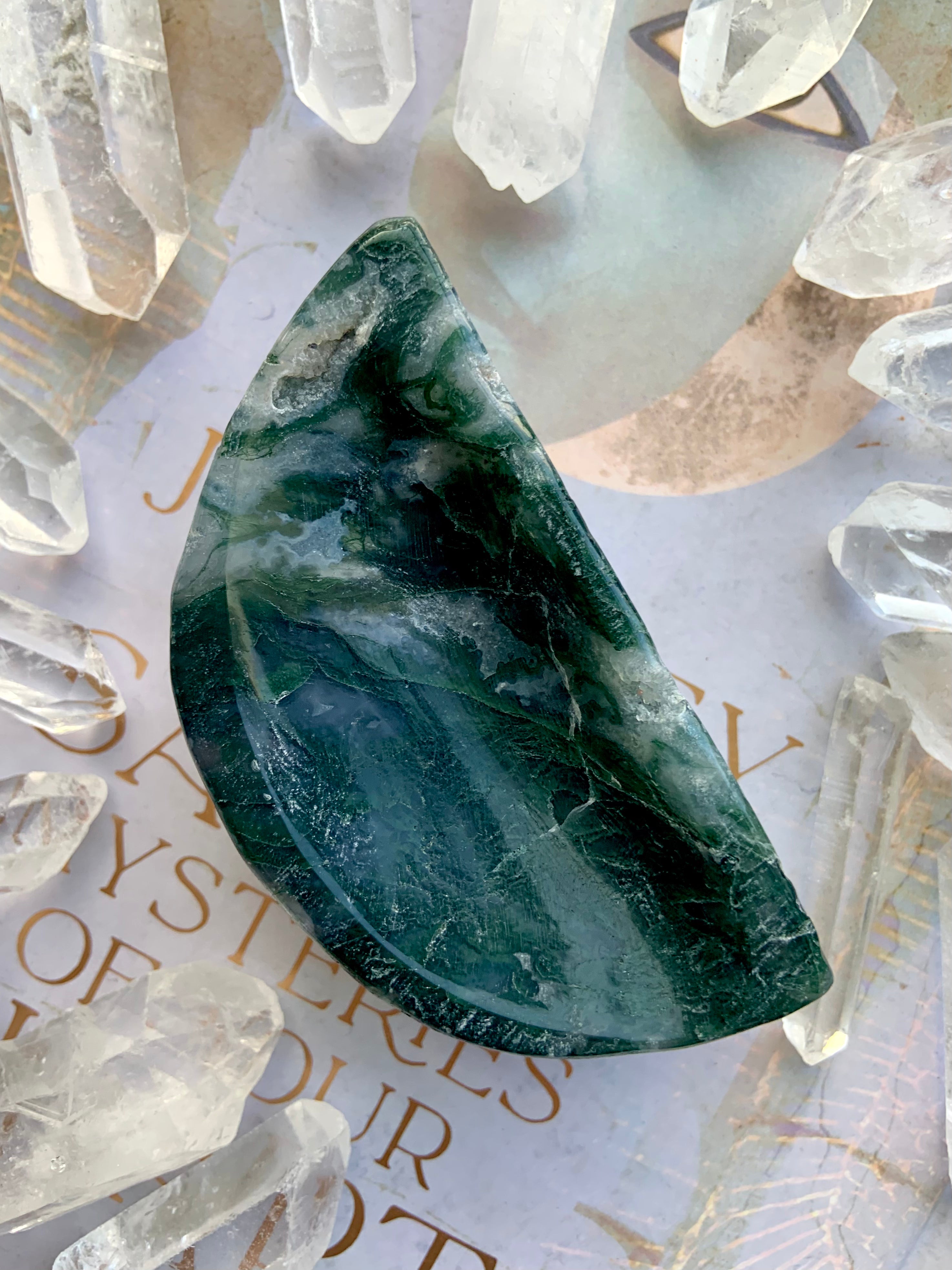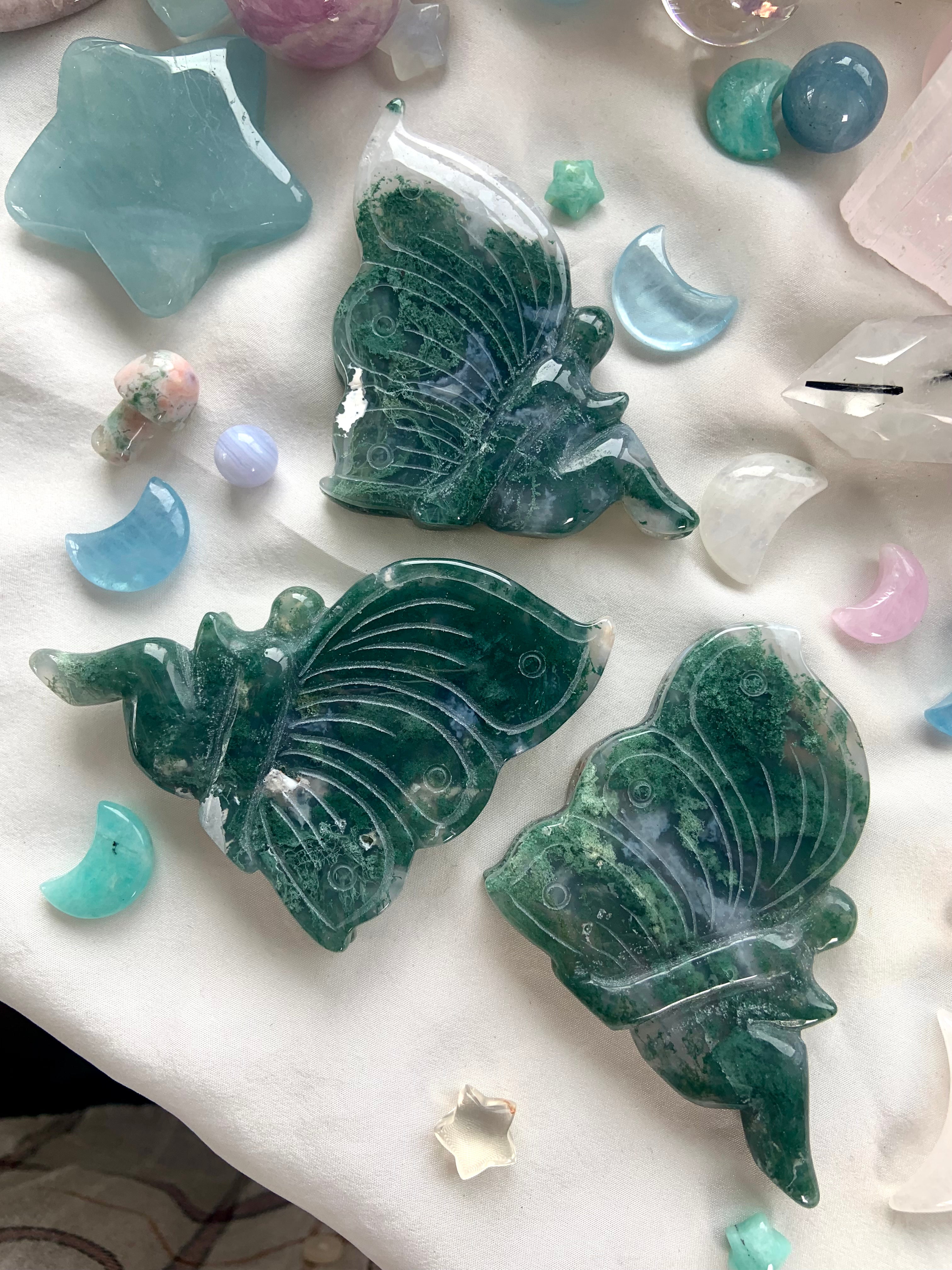 This collection includes moss agate moons, gemstone bowls, bracelets, healing sets, and polished spheres, along with a rotating selection of towers, carved dragons, and one-of-a-kind nature-inspired treasures. Whether you’re seeking spiritual growth, emotional balance, or a deeper relationship with Earth energy, these tranquil green stones support grounding rituals and heart-centered healing.