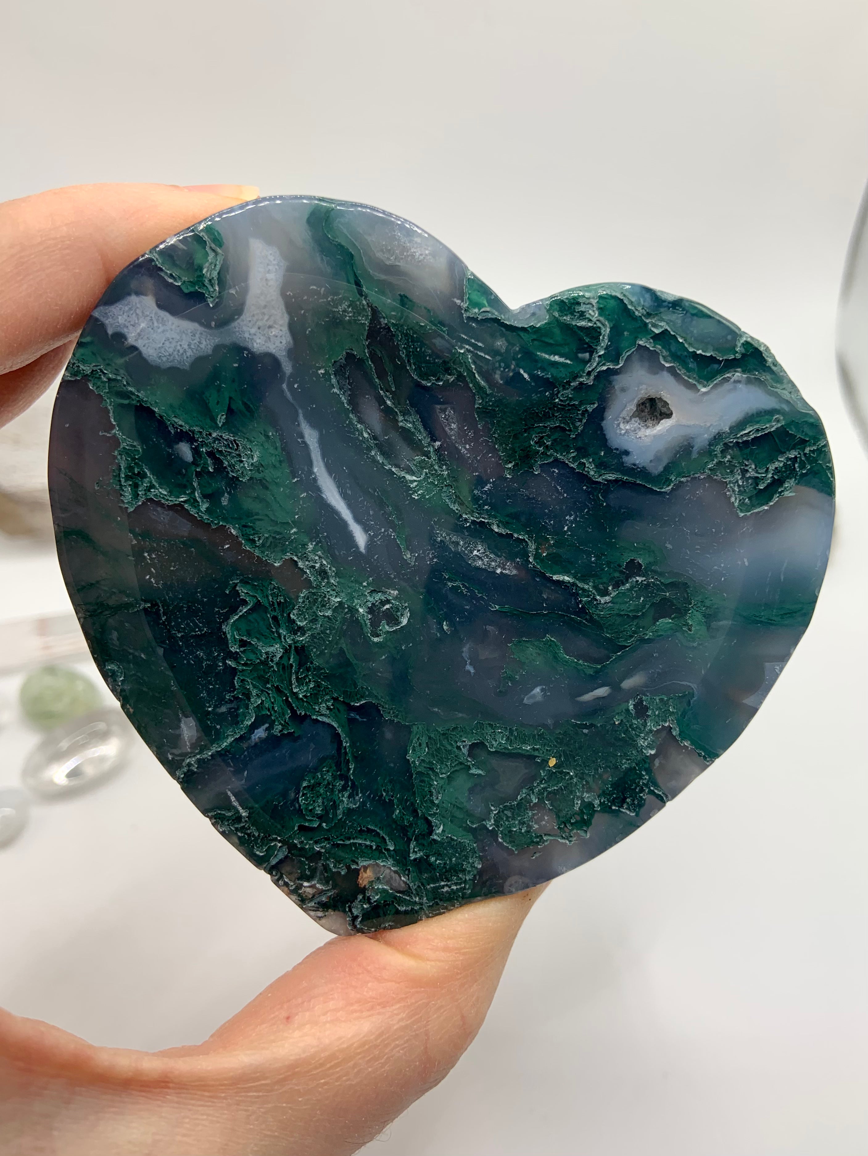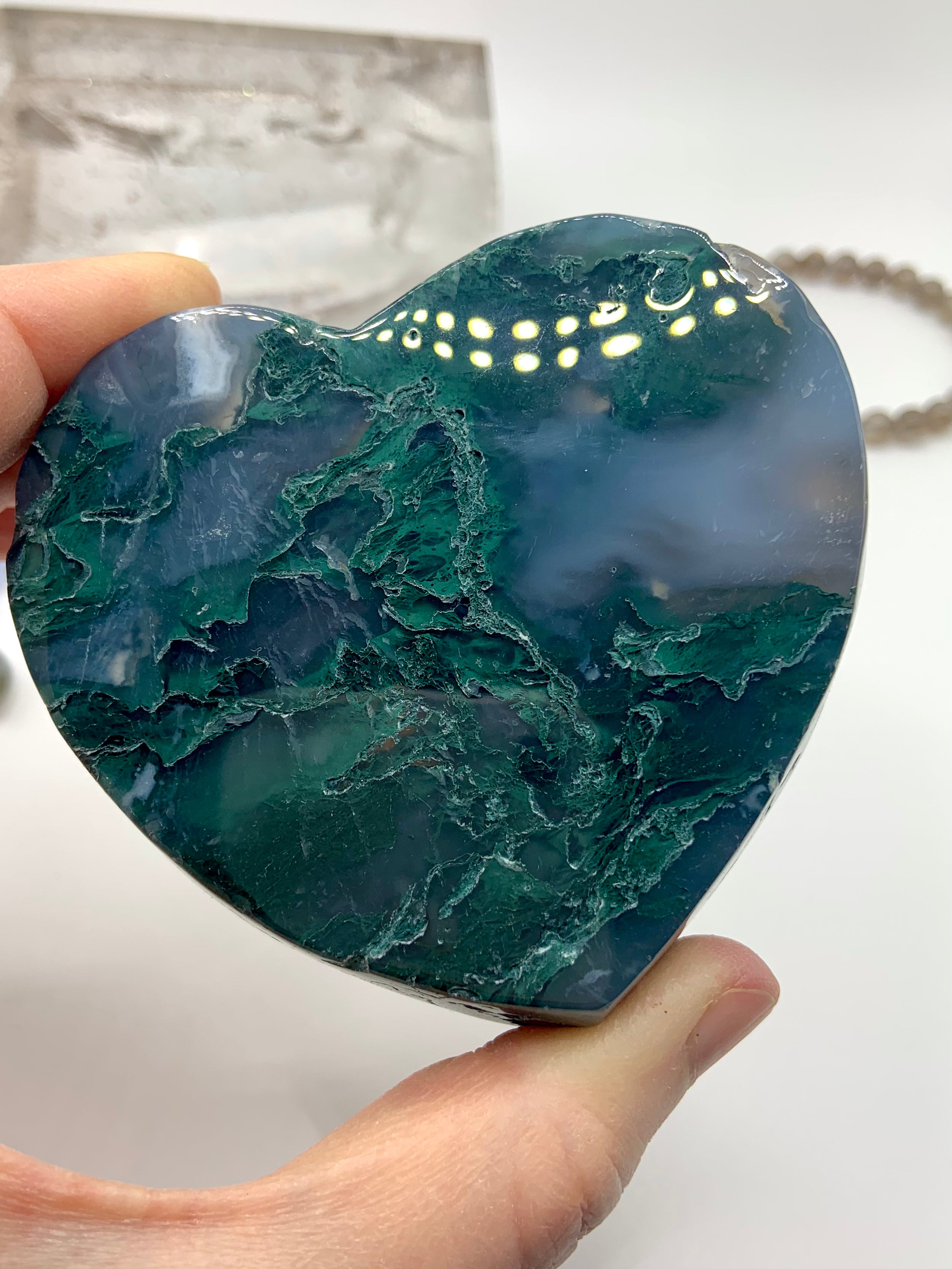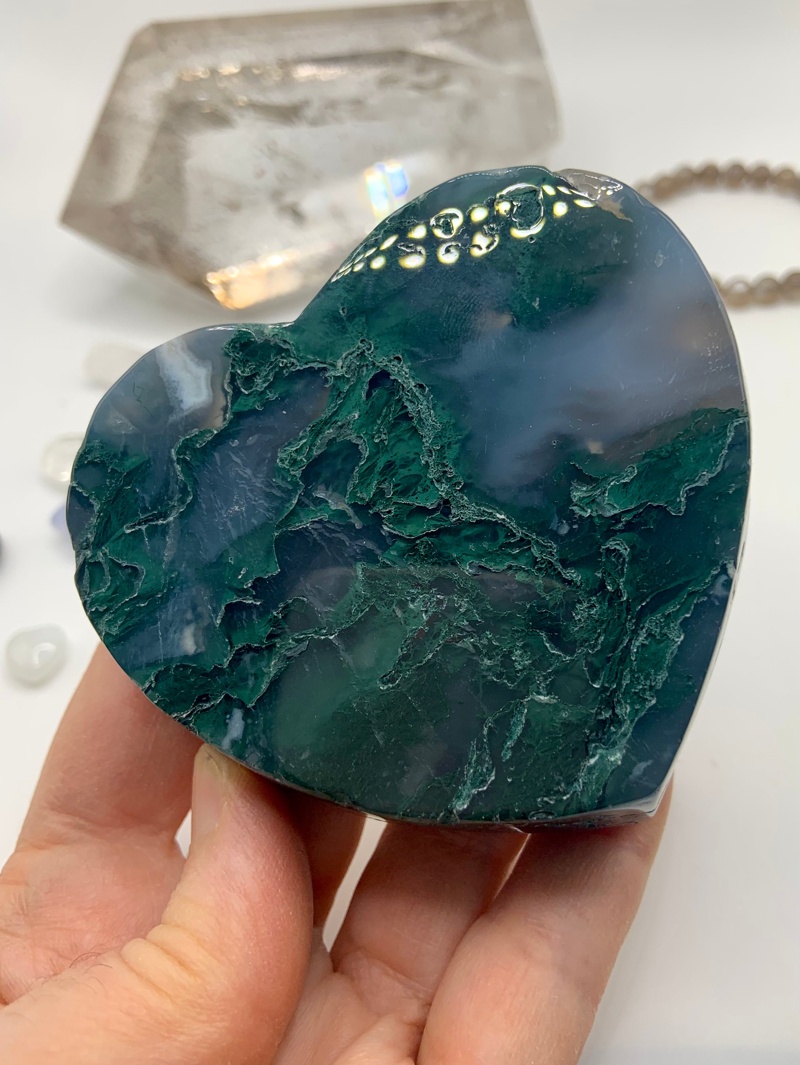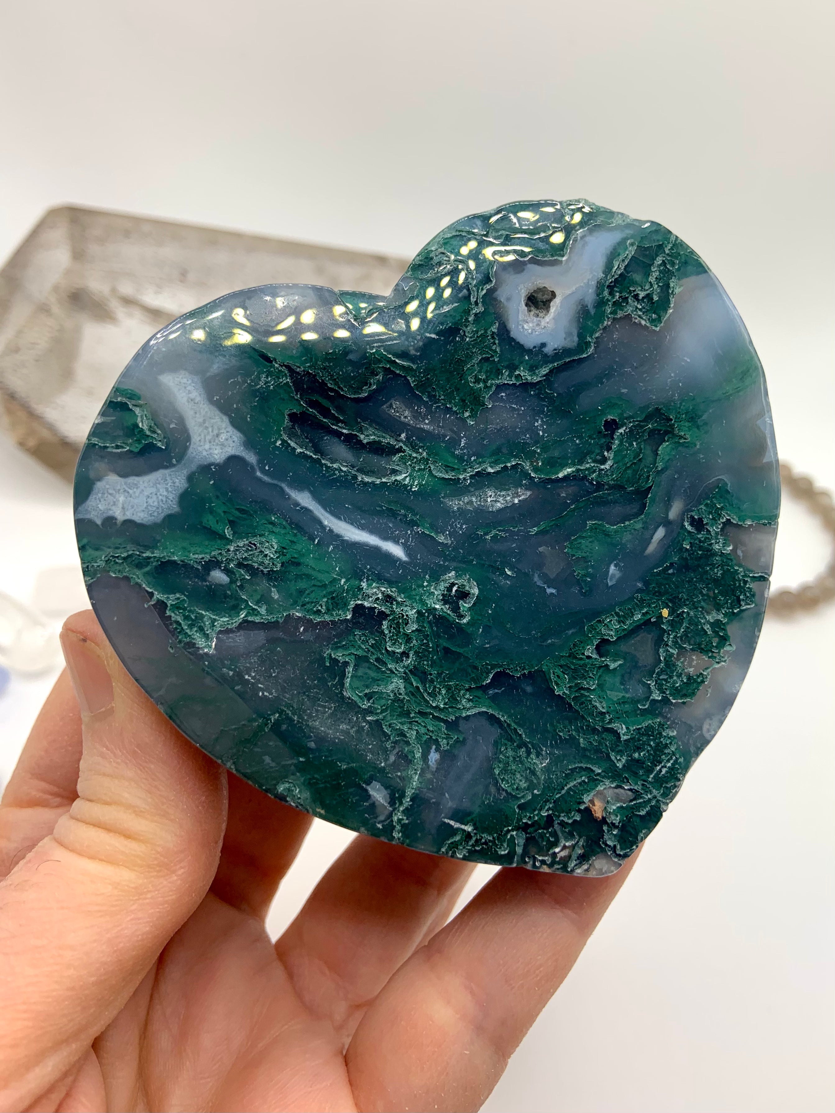 Moss agate crystals look like a piece of art, created by Mama Nature herself, reminiscent of mossy landscapes, foggy mountains + swirling forest springs. Moss agate is a root chakra crystal + a heart chakra crystal, emitting a grounding, heart-centered energy.