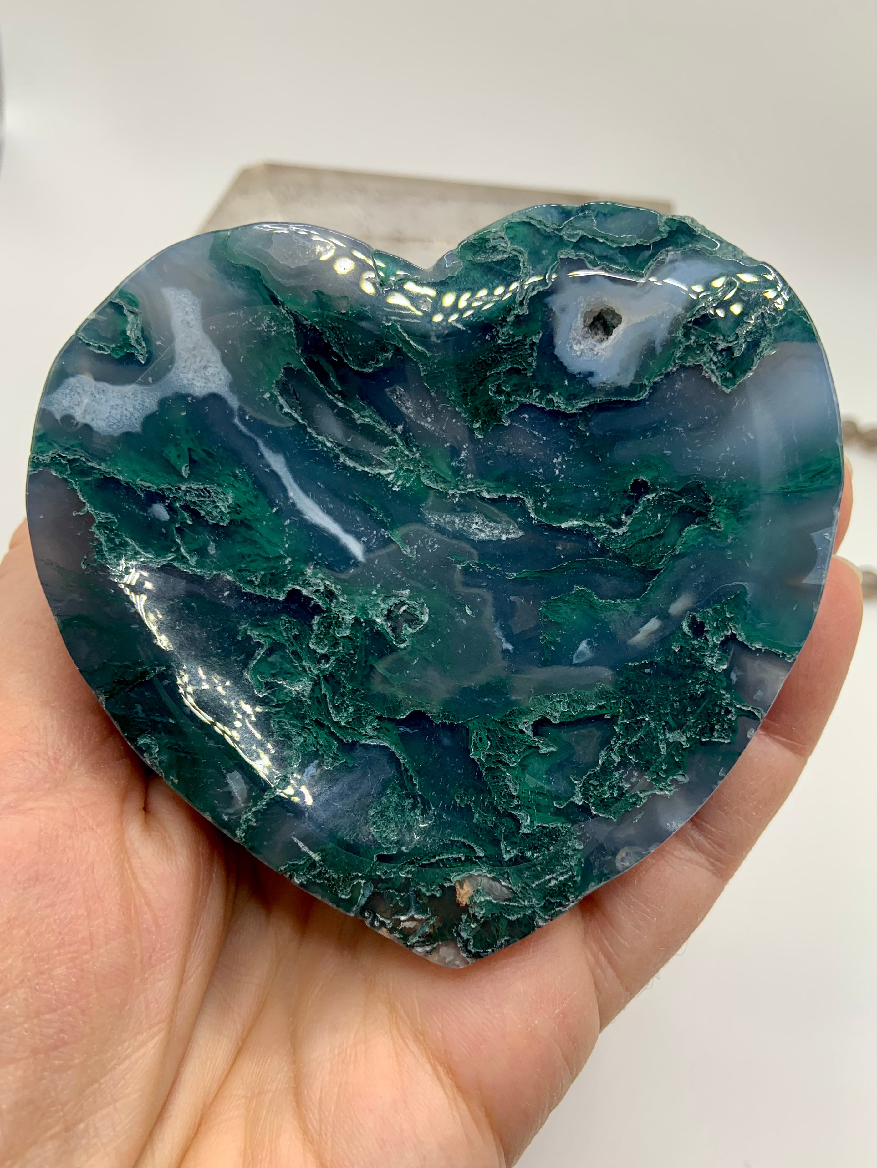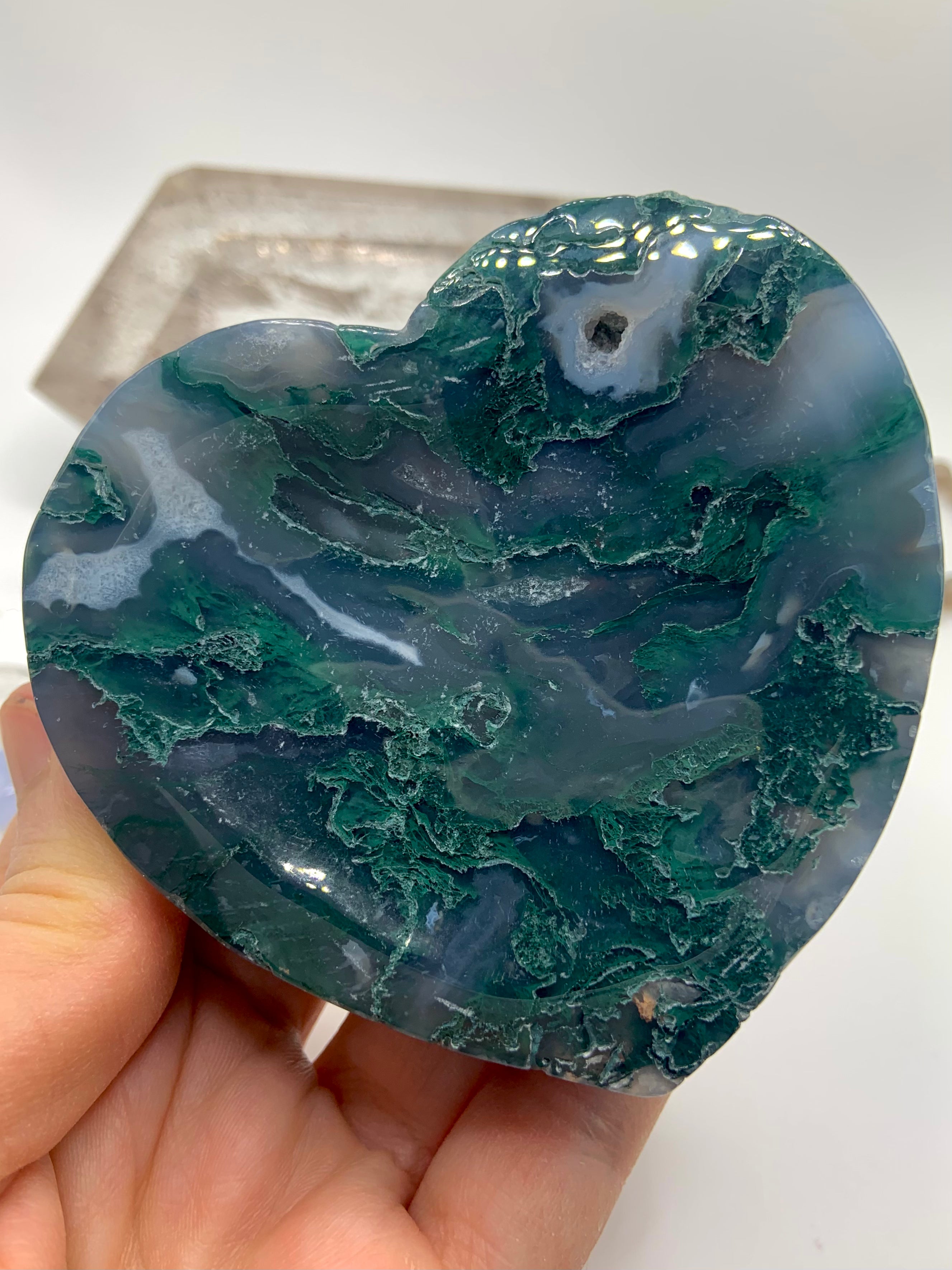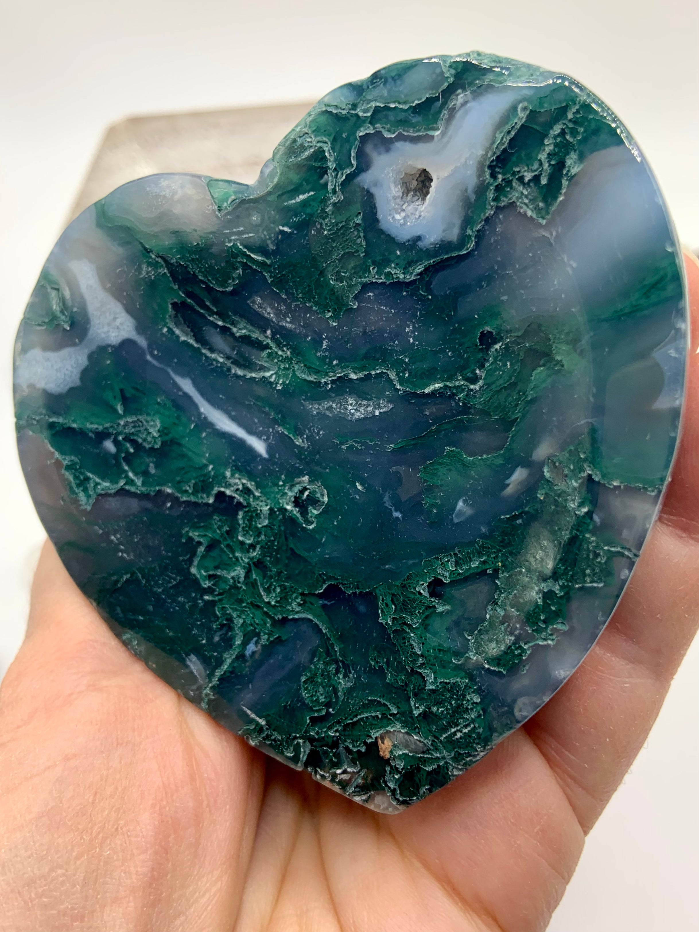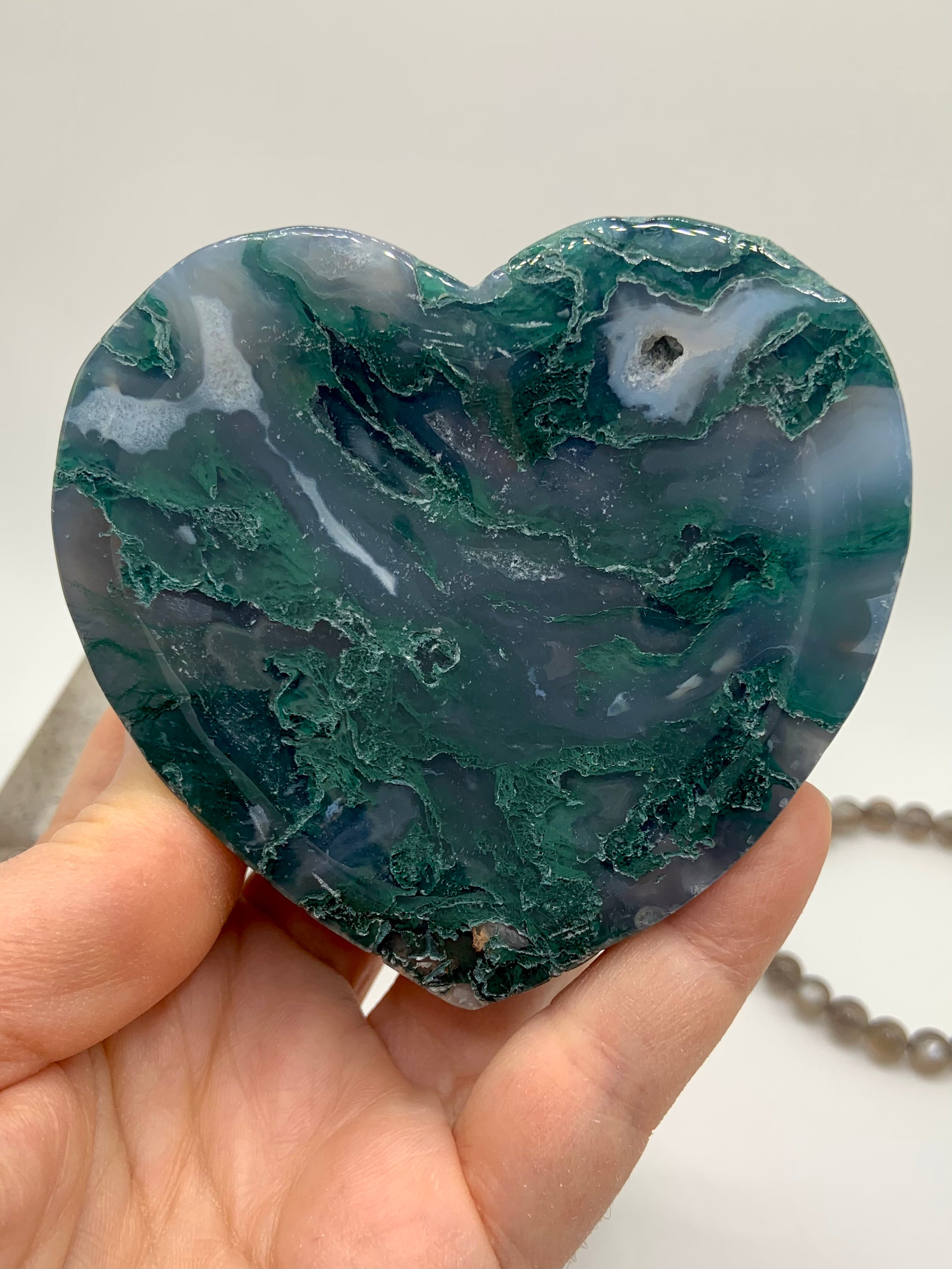 Moss agate crystals look like a piece of art, created by Mama Nature herself, reminiscent of mossy landscapes, foggy mountains + swirling forest springs. Moss agate is a root chakra crystal + a heart chakra crystal, emitting a grounding, heart-centered energy.