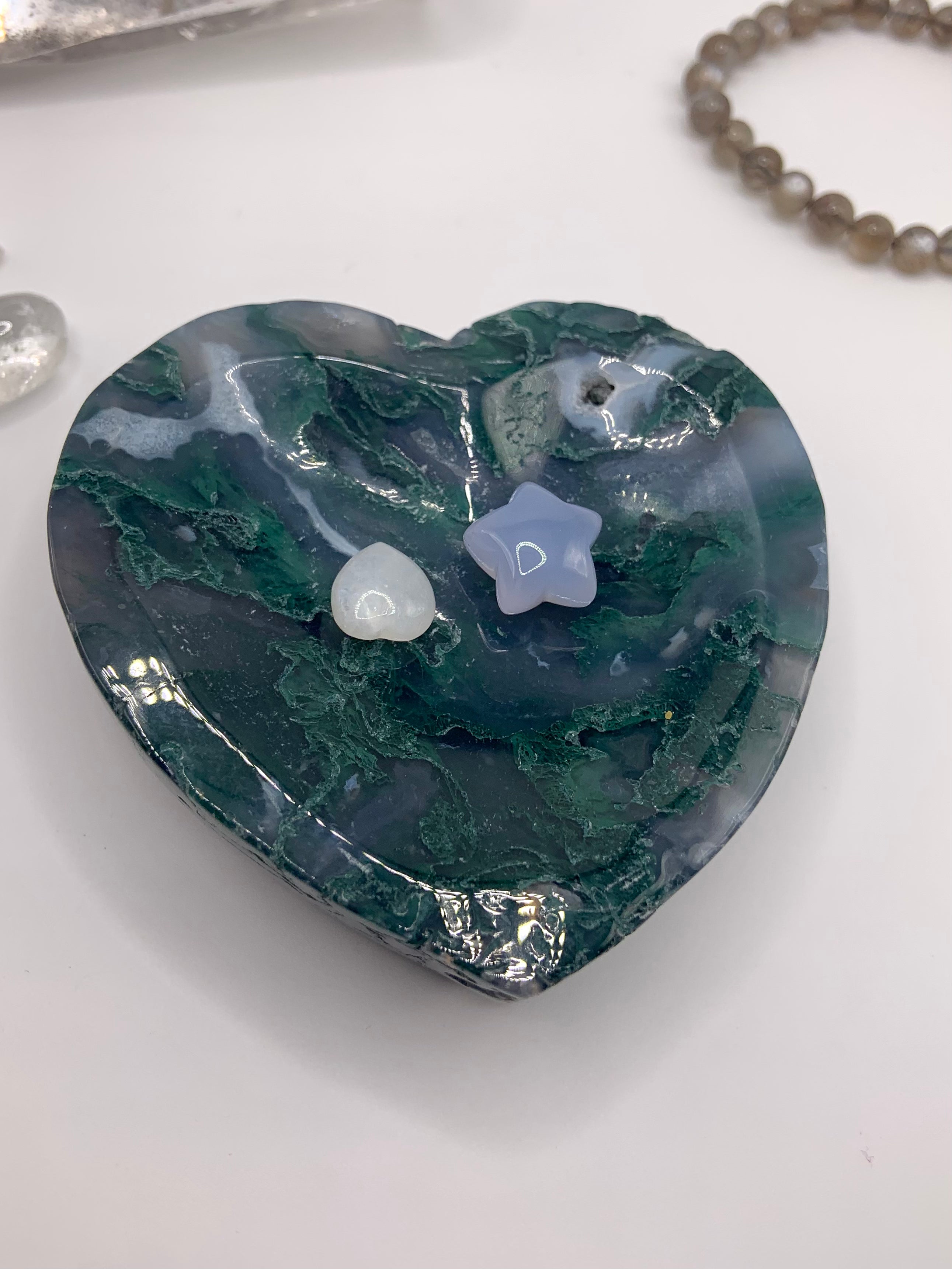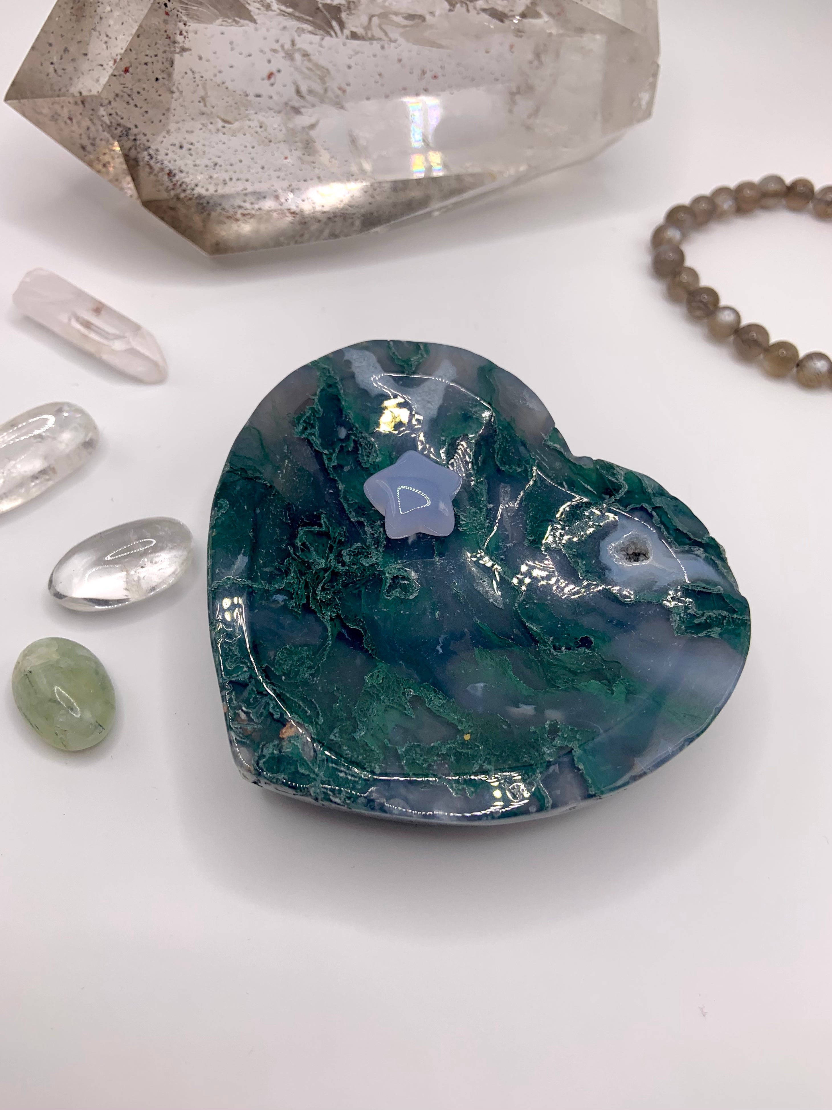 Beautifully carved + one of a kind your moss agate crystal bowl has a stunning green color with swirls of translucent chalcedony with lots of Earthy dimension + mossy tendrils within the stone. There is a gorgeous crystal bowl hand shaped from high quality moss agate stone - sooo, so beautiful + unique!