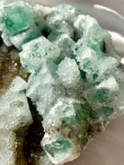 This Sugar Fluorite specimen has several well-formed cubic fluorite crystals covered in frosty crystallized druzy, reminiscent of snow capped mountains. This blue green fluorite cluster is a super sparkly, eye-catching display piece to elevate your sacred space, a beautiful specimen + a highlight in your Crystal Decor.