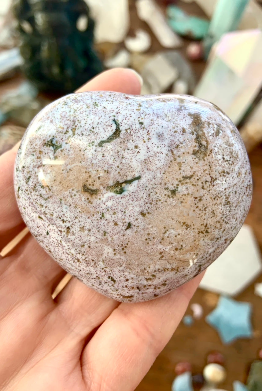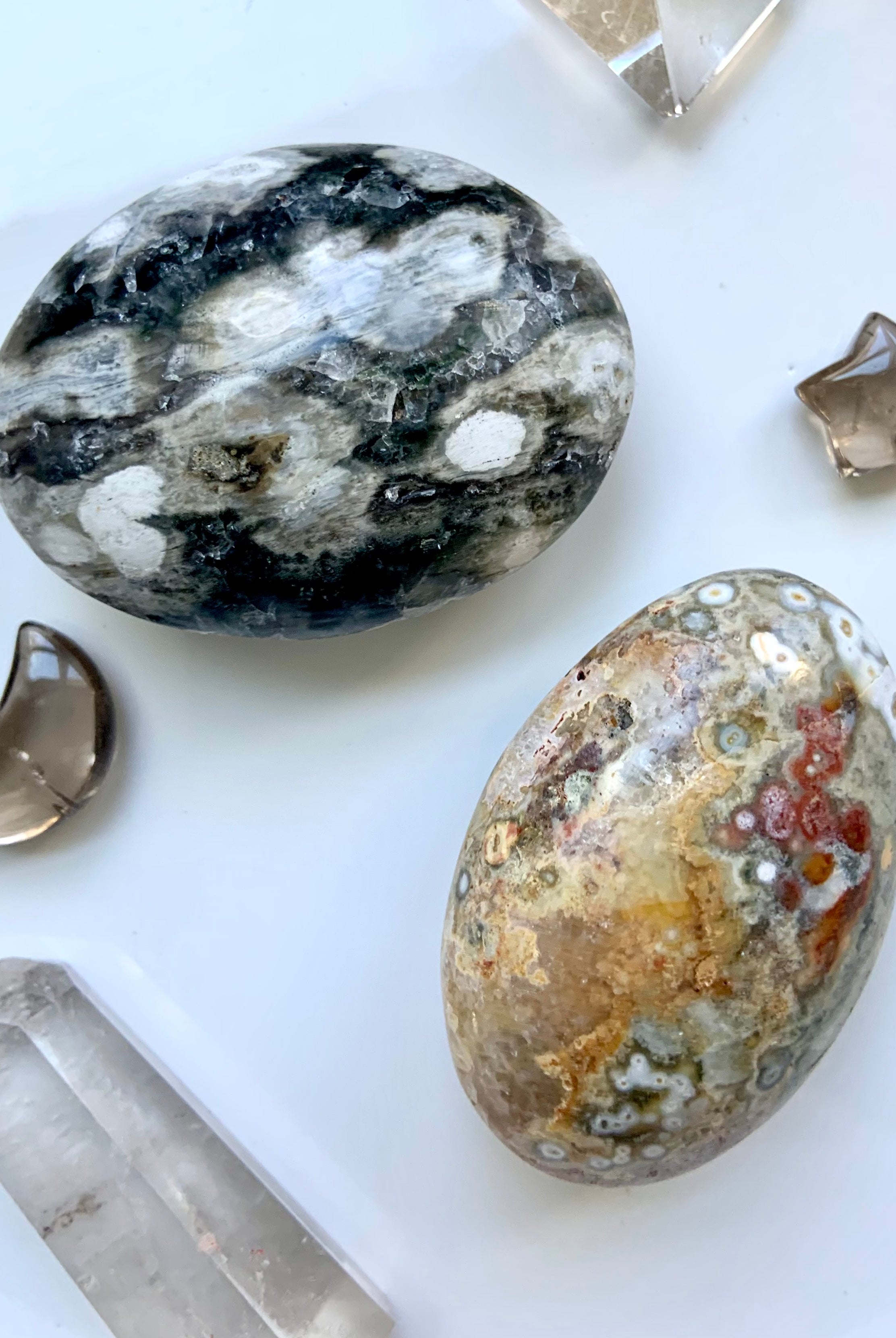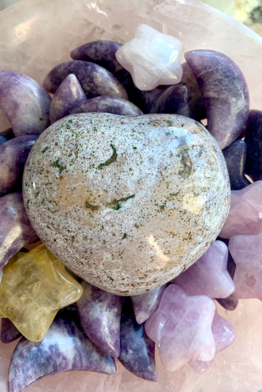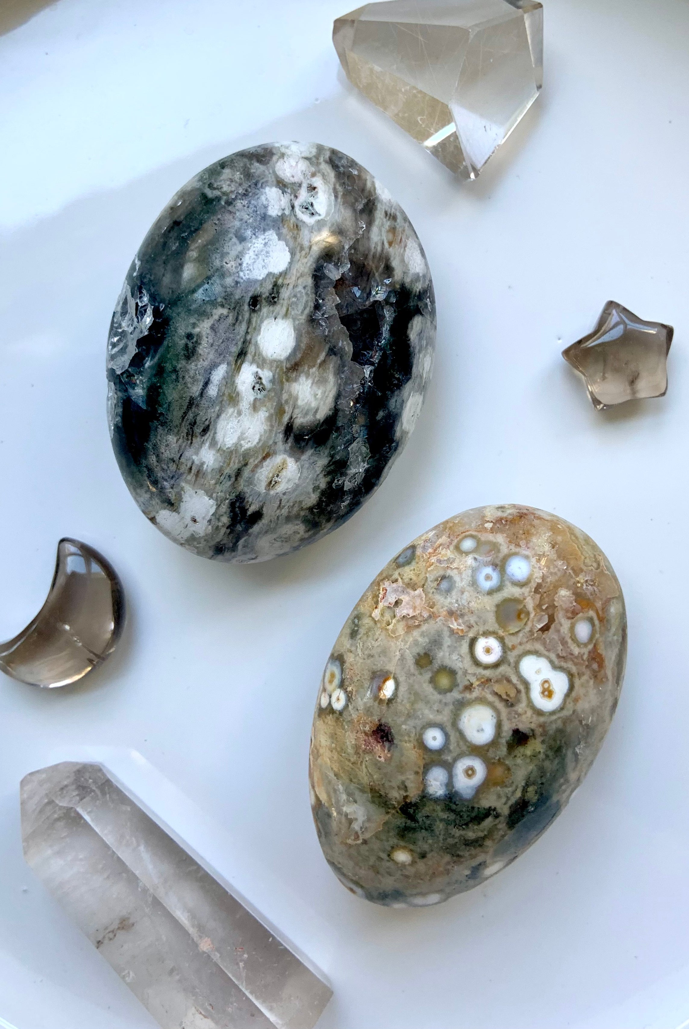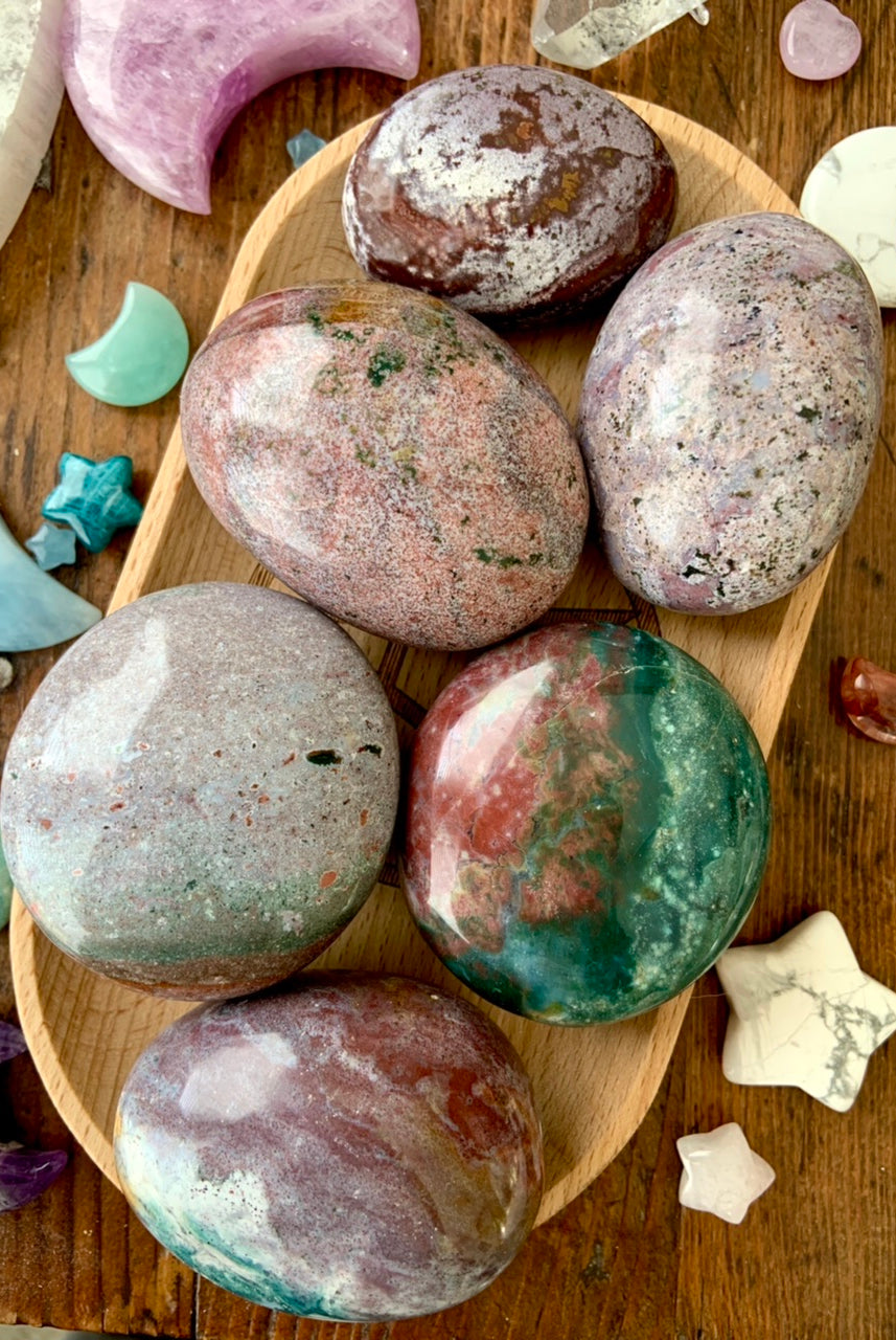 This collection features one-of-a-kind bowls, statement freeforms, hearts, moons, stars, palm stones, mushroom carvings, and bracelets—alongside a rotating selection of dragons, angels, spheres, towers, and unique carved treasures. Ocean Jasper supports Root and Heart Chakra healing, bringing balance, introspection, and grounded compassion to your journey of healing and remembrance.