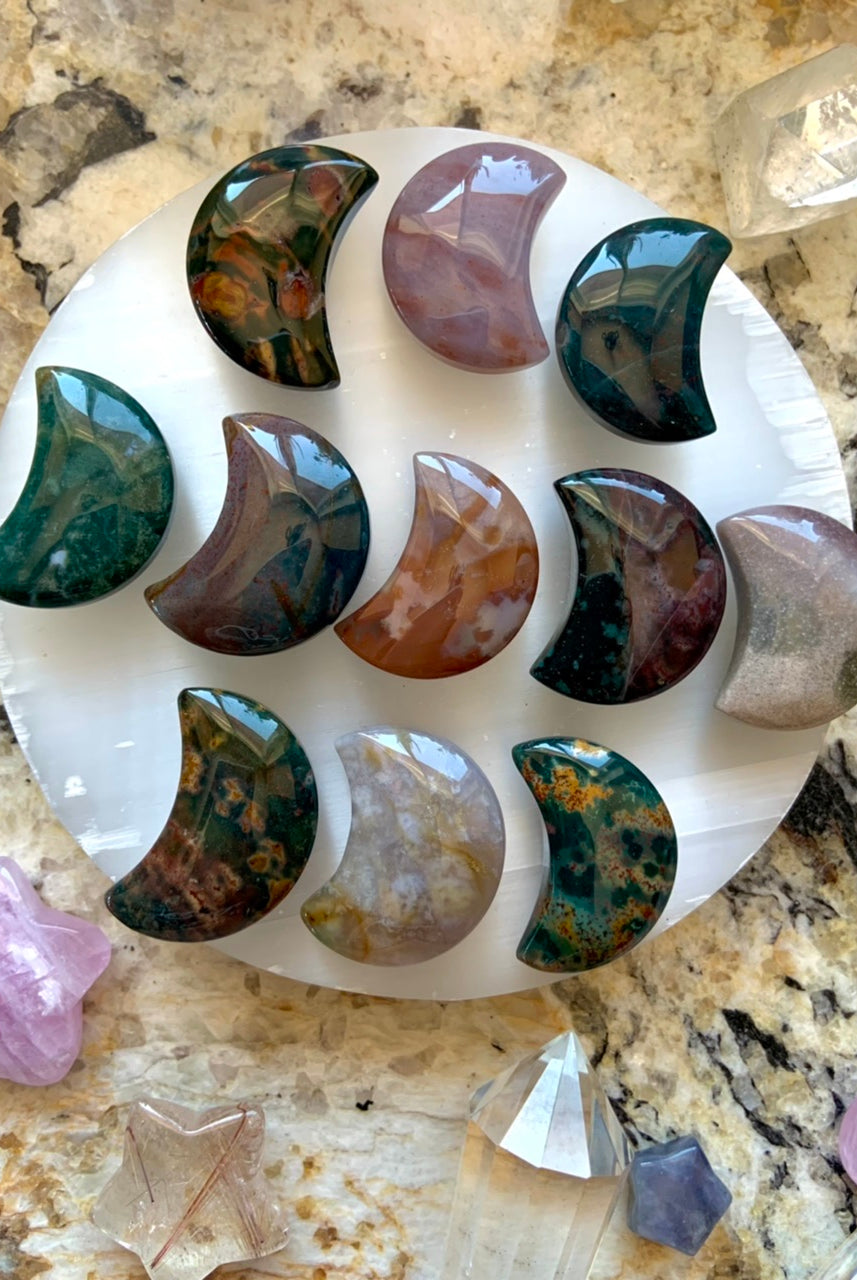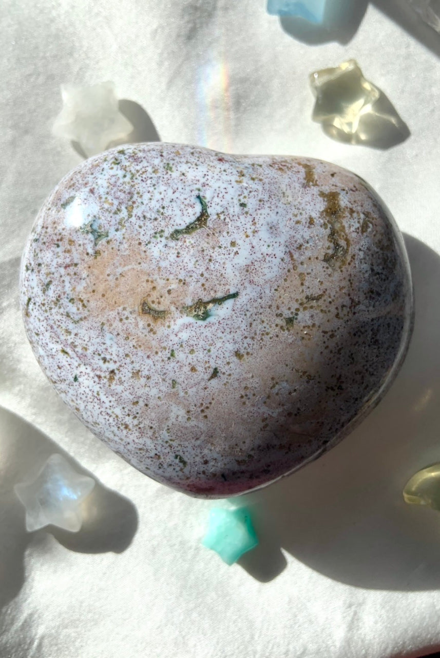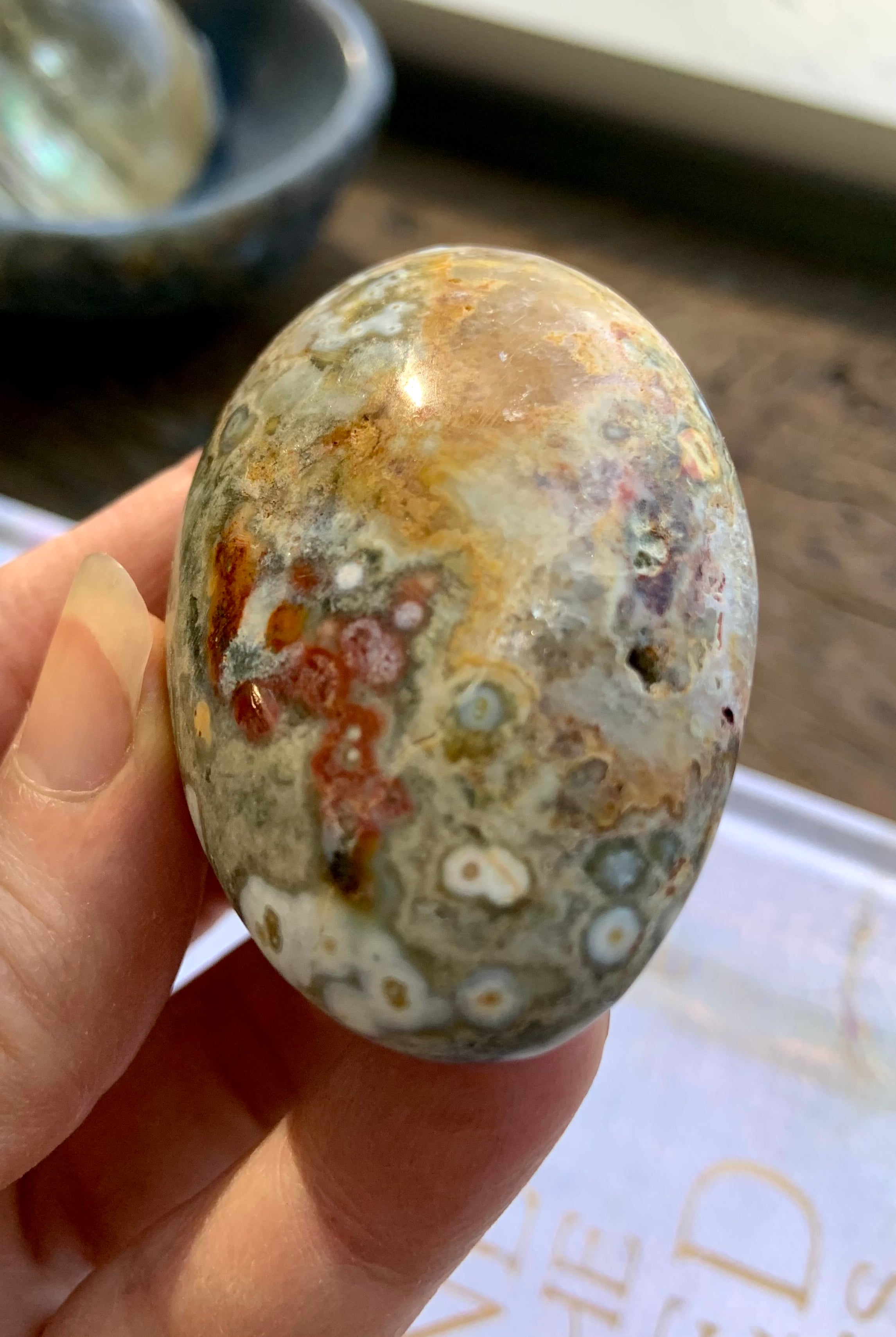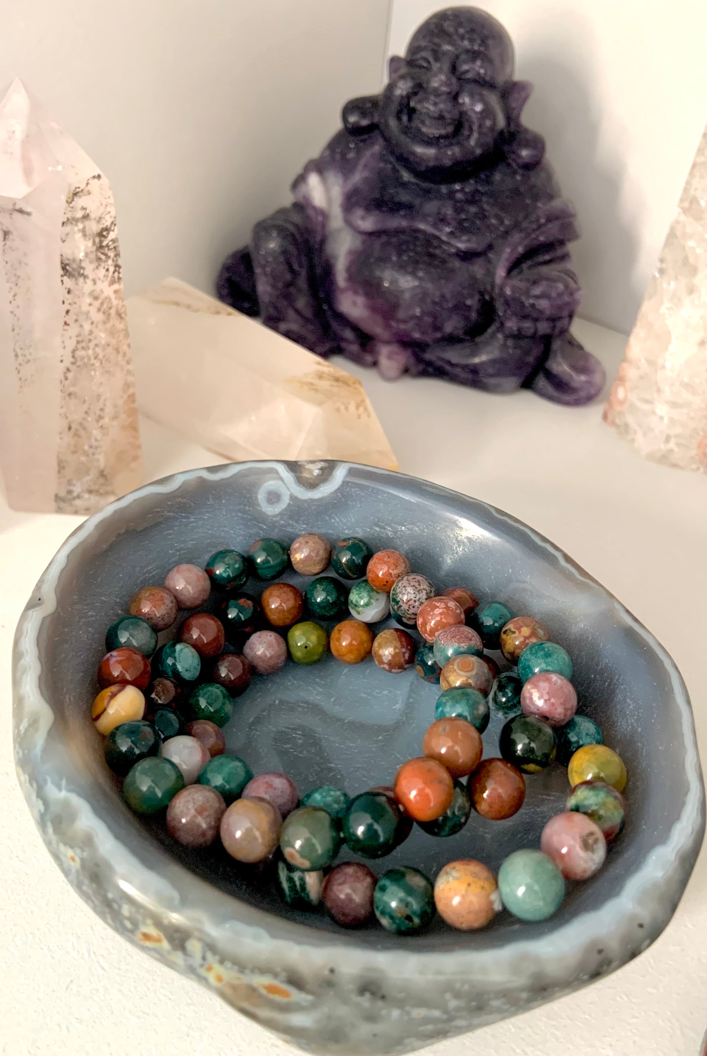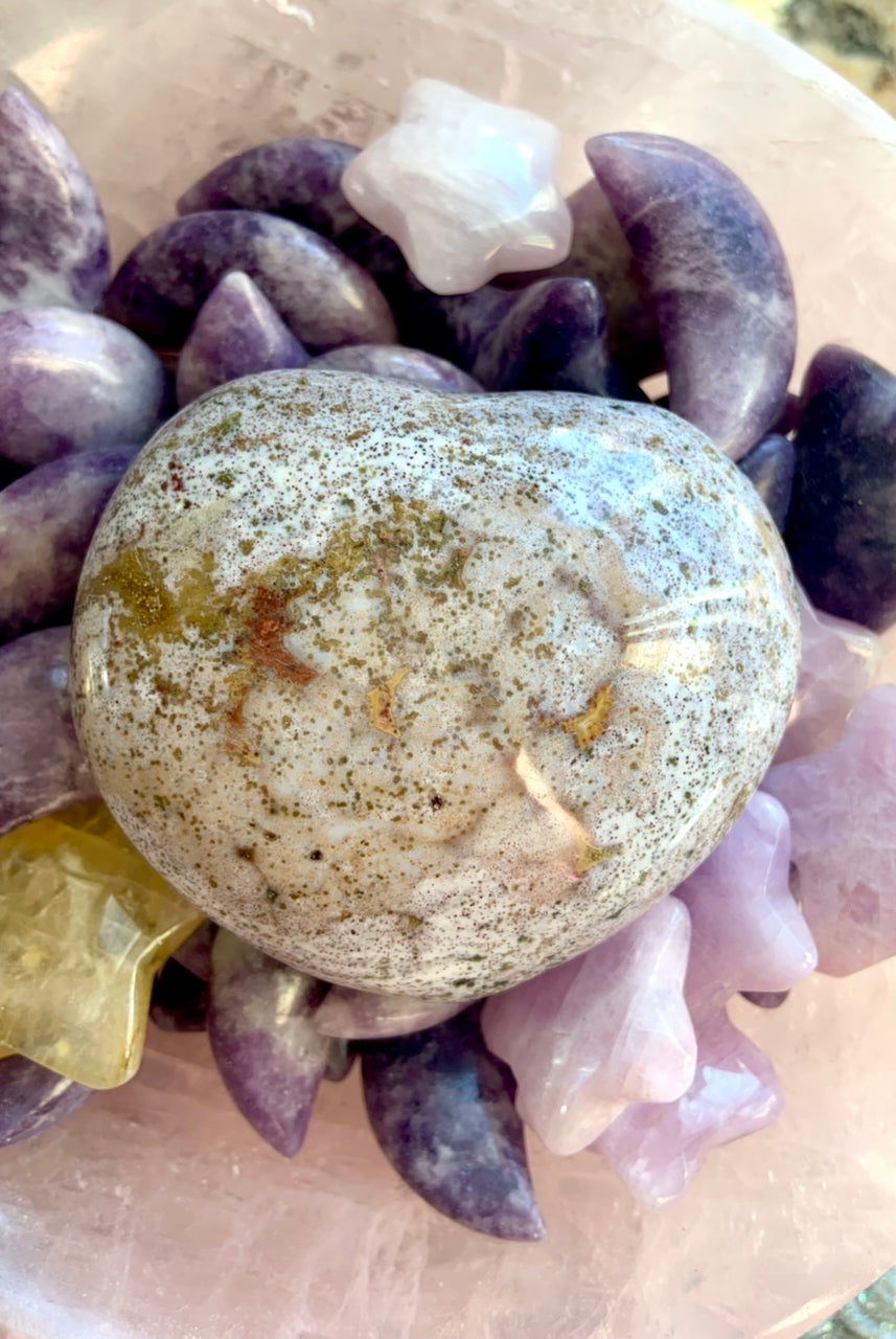 This collection features one-of-a-kind bowls, statement freeforms, hearts, moons, stars, palm stones, mushroom carvings, and bracelets—alongside a rotating selection of dragons, angels, spheres, towers, and unique carved treasures. Ocean Jasper supports Root and Heart Chakra healing, bringing balance, introspection, and grounded compassion to your journey of healing and remembrance.
