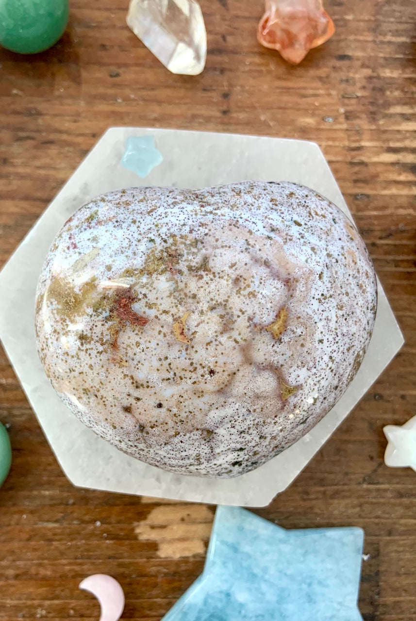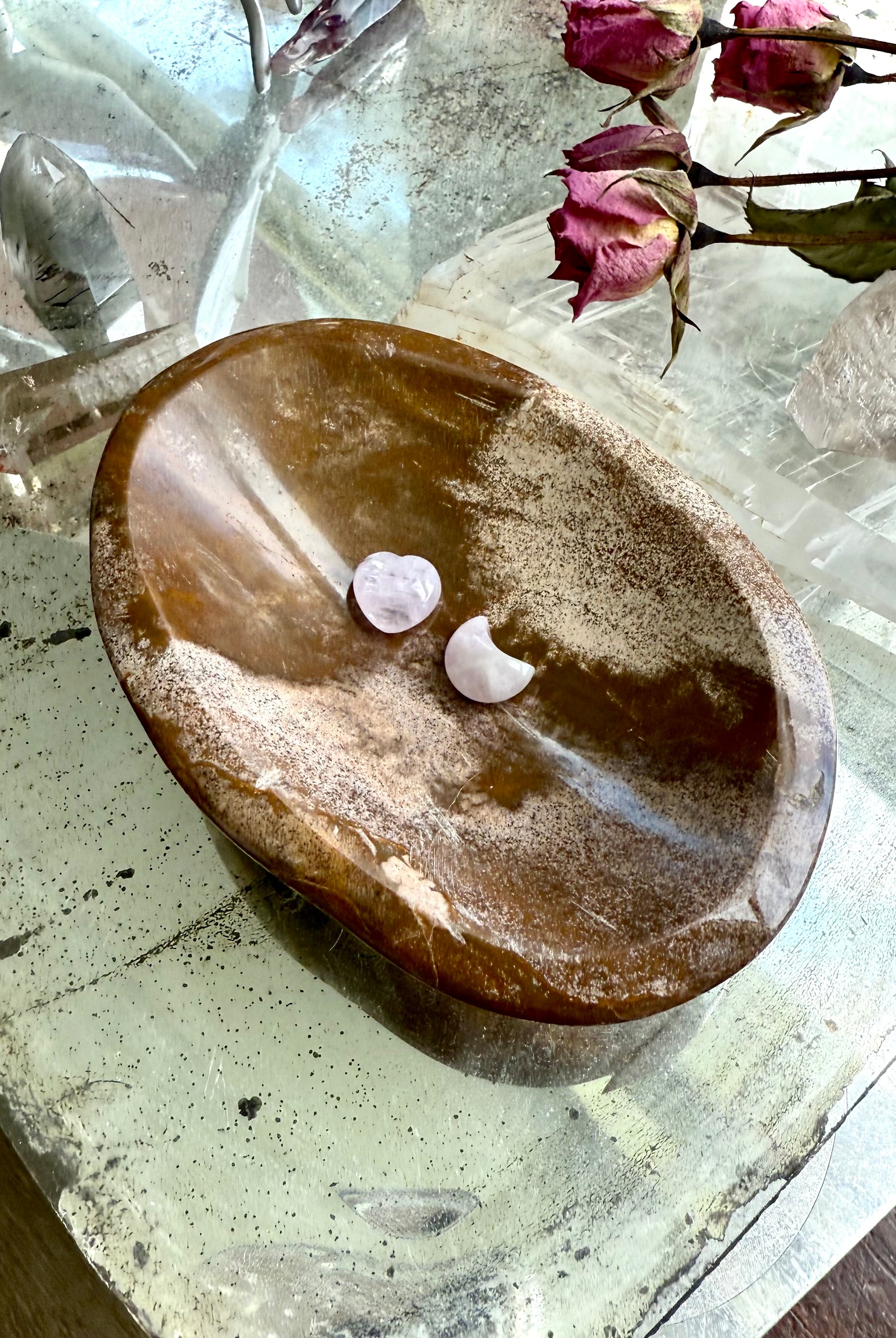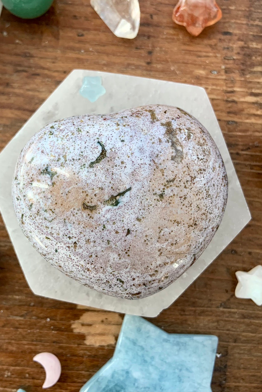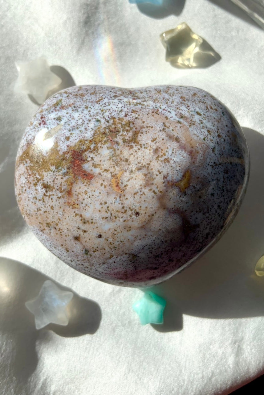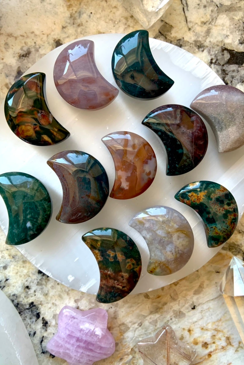 This collection features one-of-a-kind bowls, statement freeforms, hearts, moons, stars, palm stones, mushroom carvings, and bracelets—alongside a rotating selection of dragons, angels, spheres, towers, and unique carved treasures. Ocean Jasper supports Root and Heart Chakra healing, bringing balance, introspection, and grounded compassion to your journey of healing and remembrance.