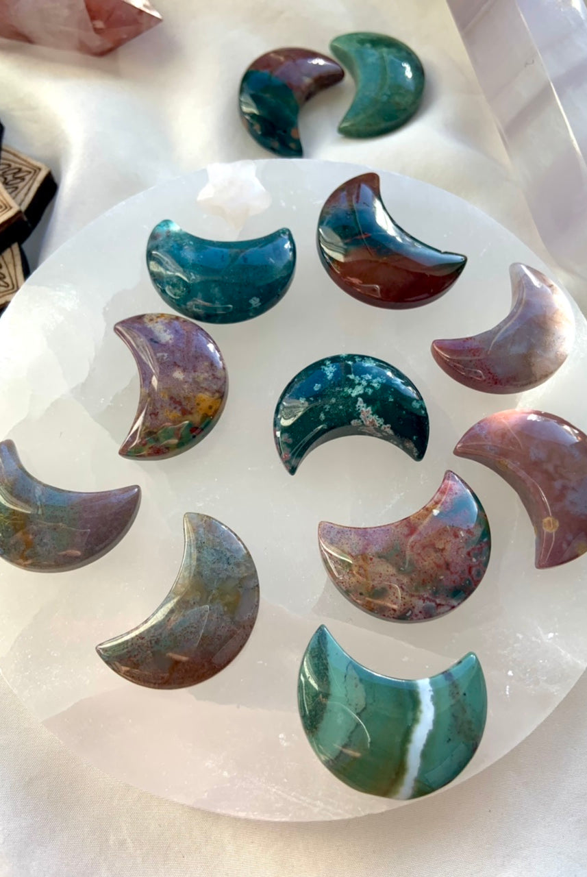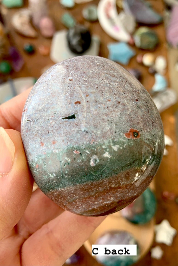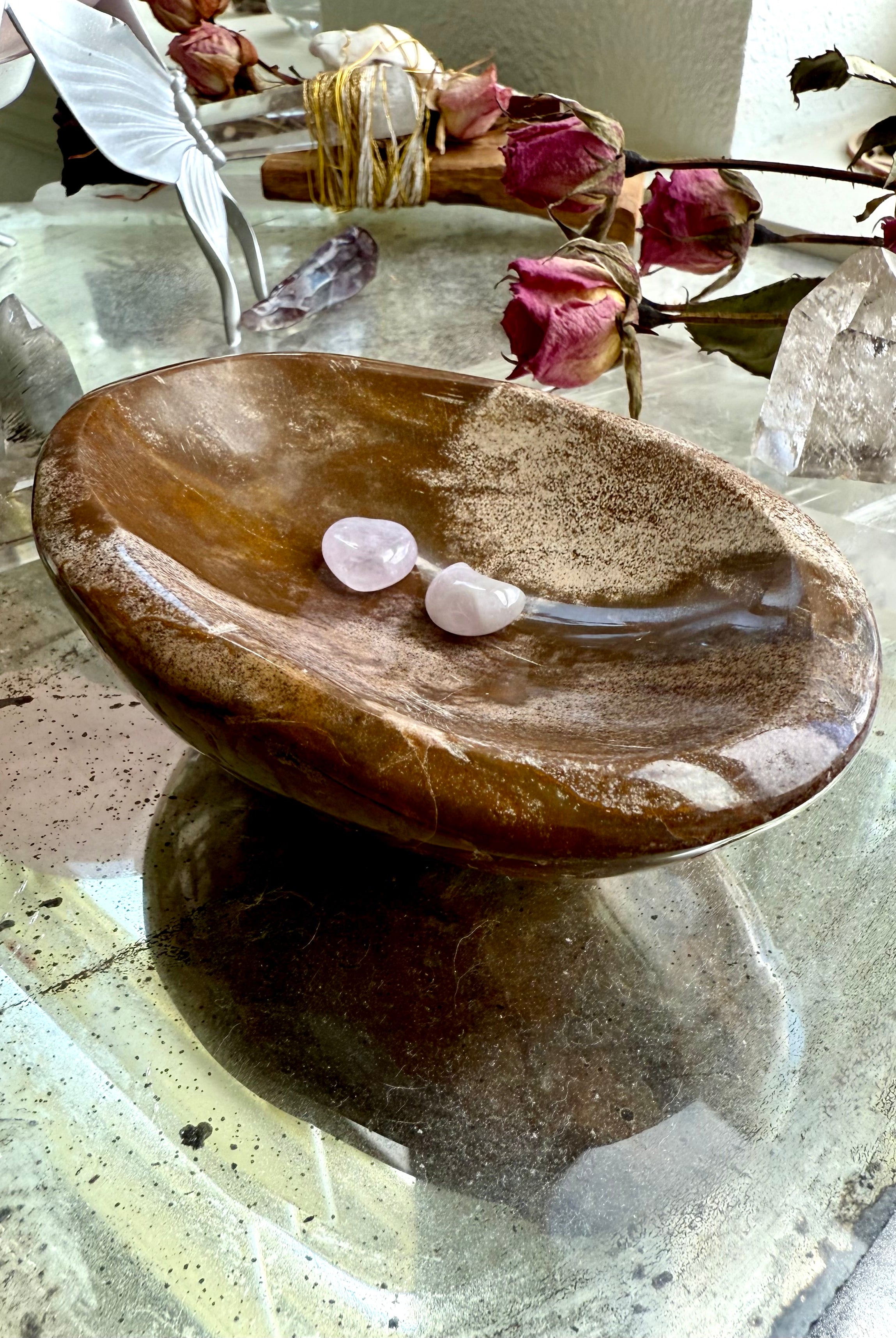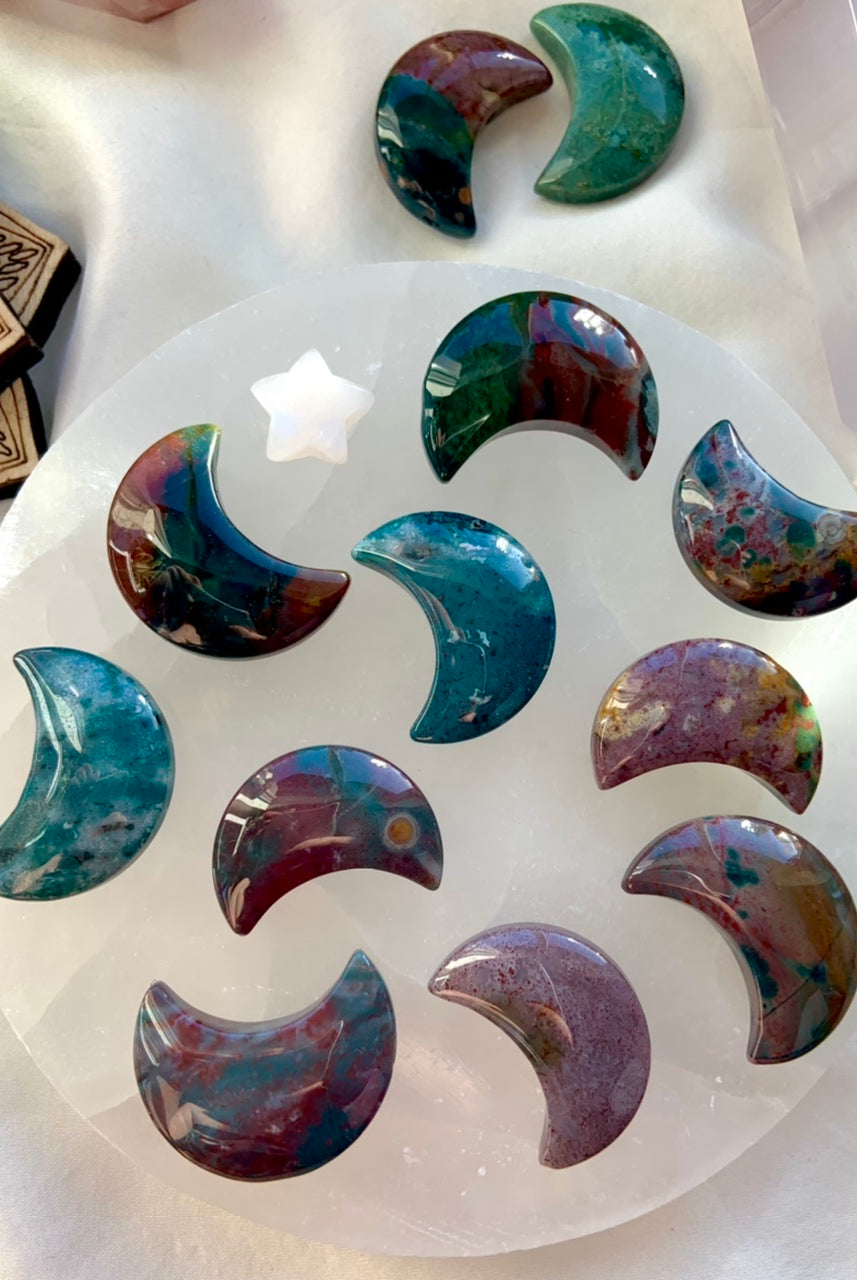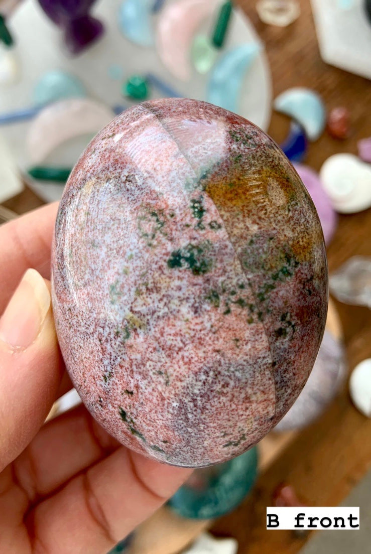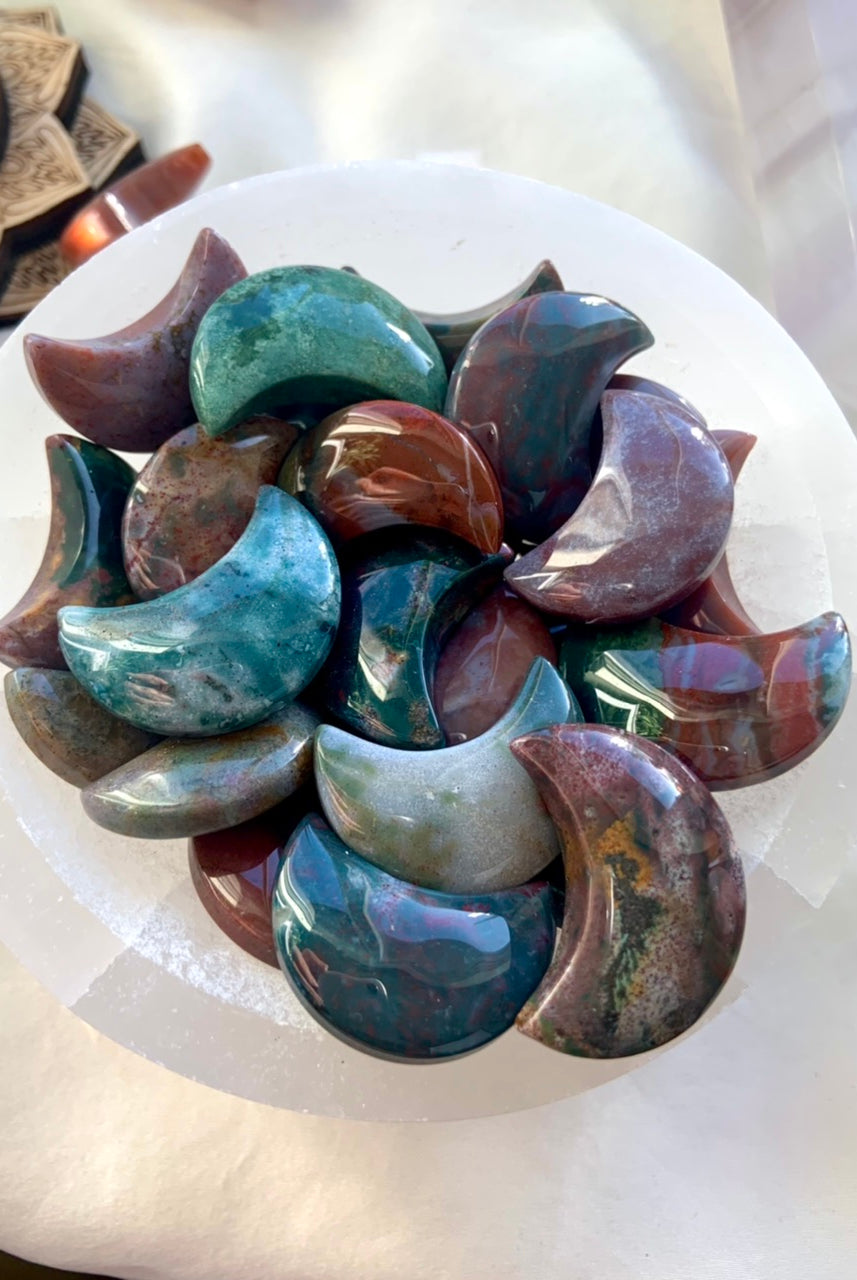 This collection features one-of-a-kind bowls, statement freeforms, hearts, moons, stars, palm stones, mushroom carvings, and bracelets—alongside a rotating selection of dragons, angels, spheres, towers, and unique carved treasures. Ocean Jasper supports Root and Heart Chakra healing, bringing balance, introspection, and grounded compassion to your journey of healing and remembrance.
