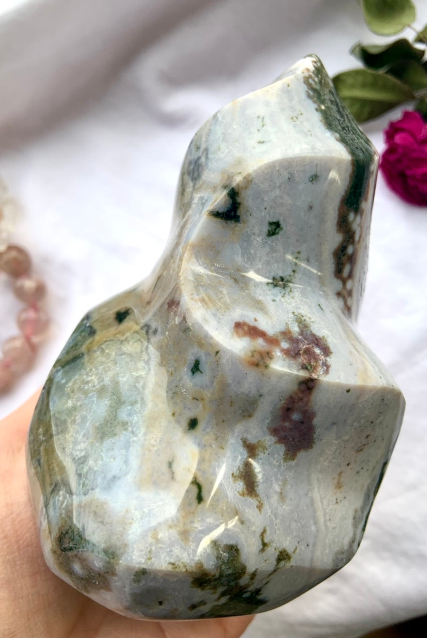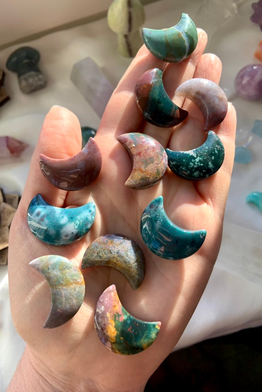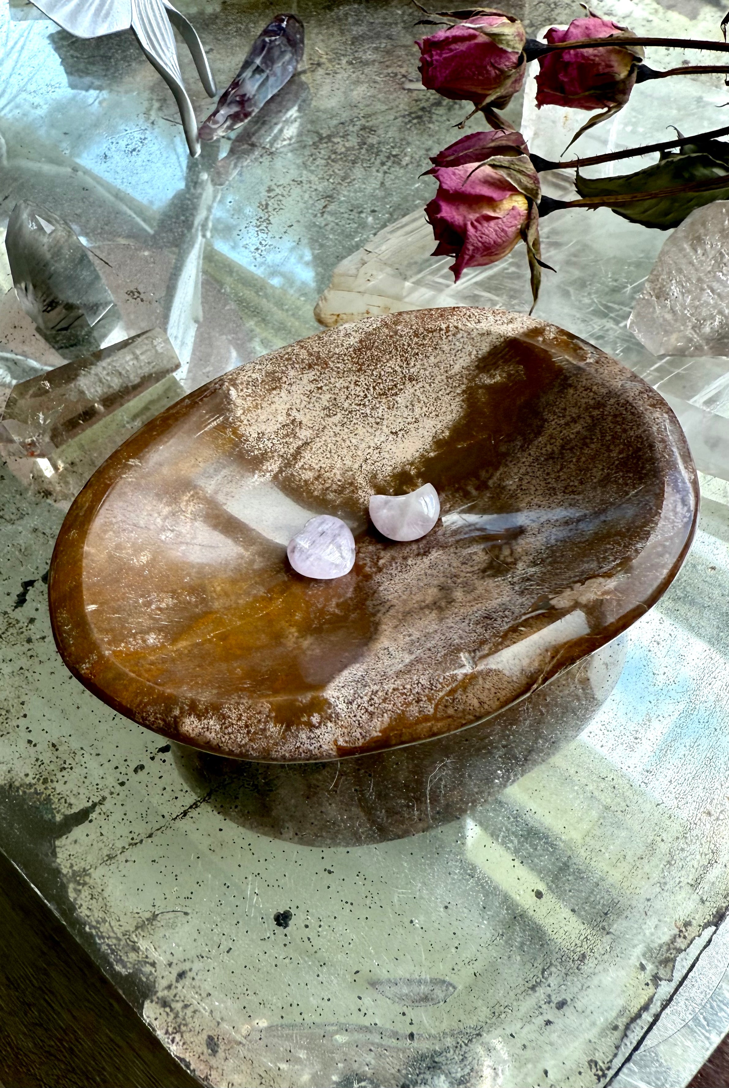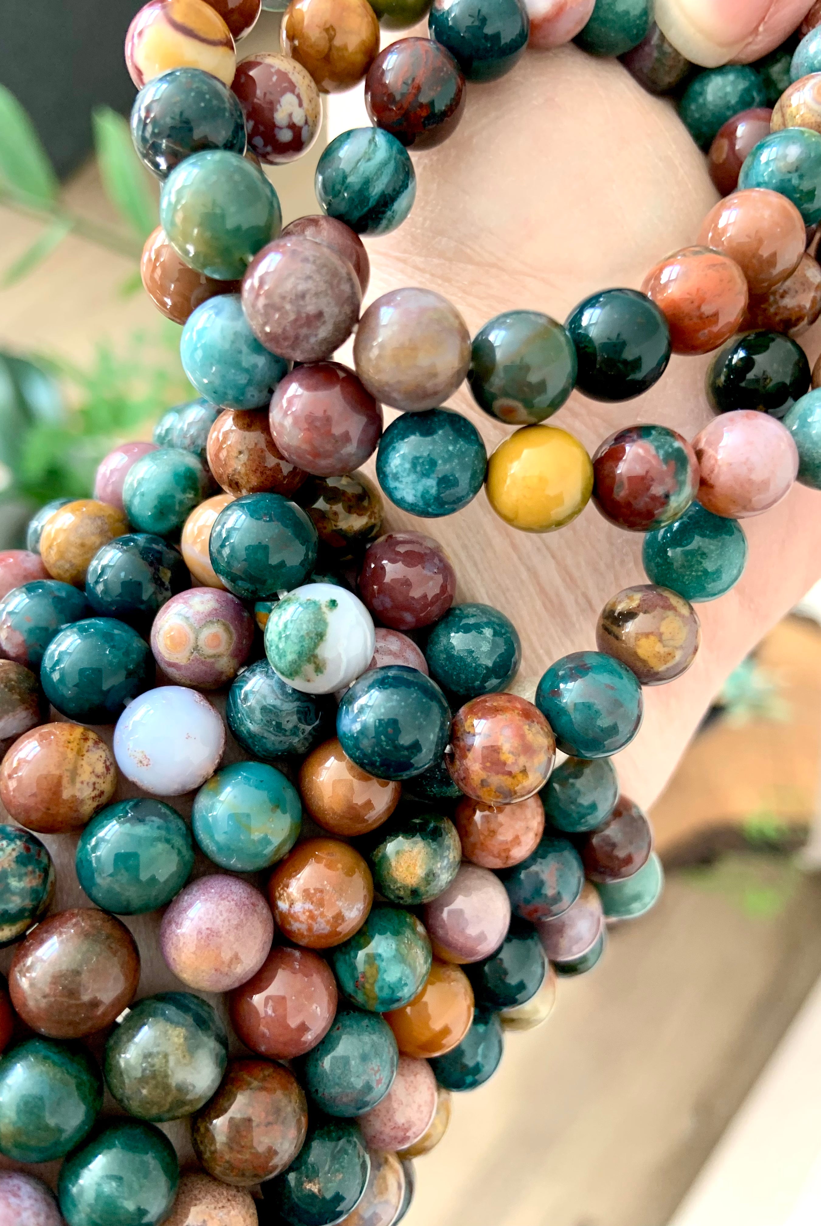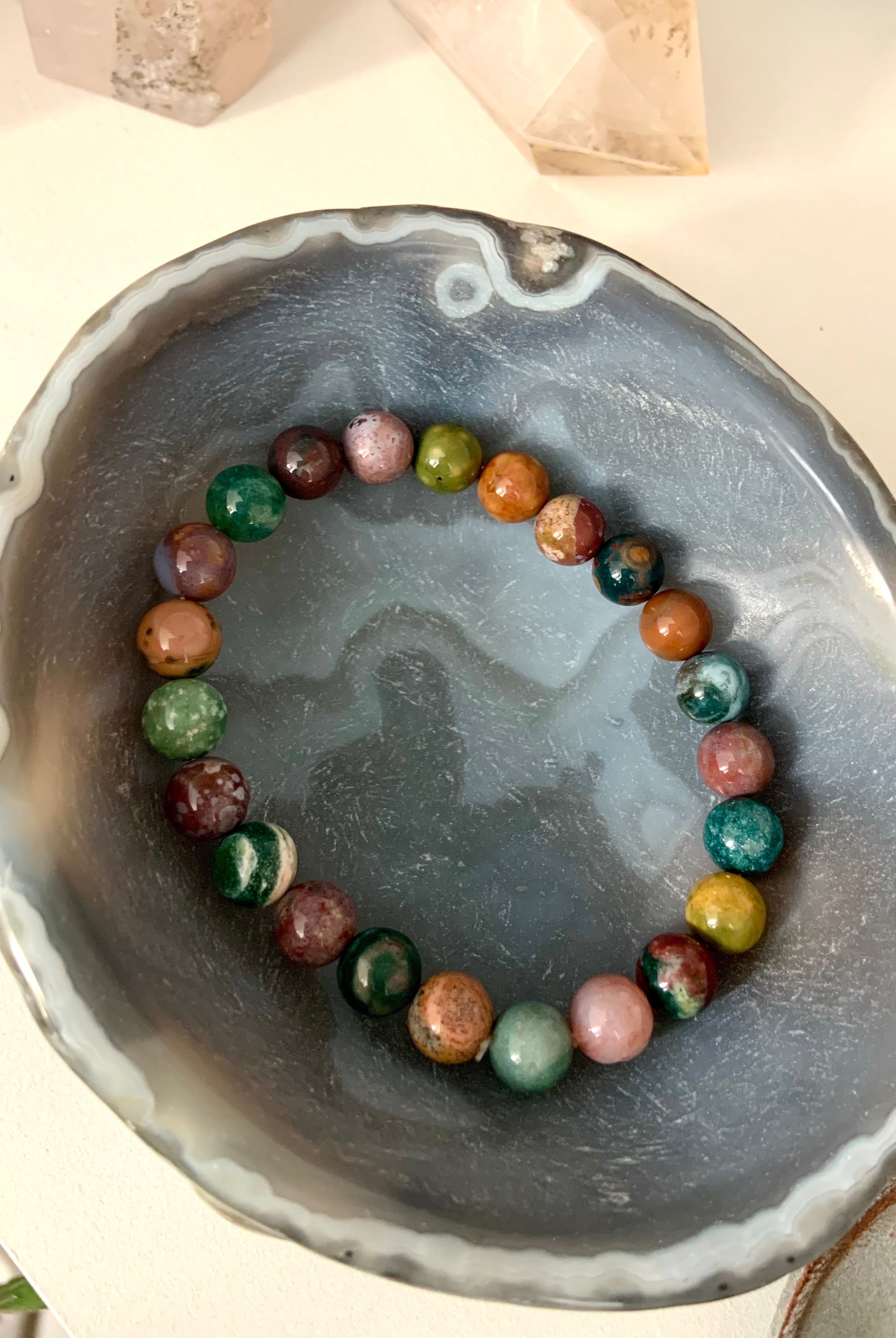 This collection features one-of-a-kind bowls, statement freeforms, hearts, moons, stars, palm stones, mushroom carvings, and bracelets—alongside a rotating selection of dragons, angels, spheres, towers, and unique carved treasures. Ocean Jasper supports Root and Heart Chakra healing, bringing balance, introspection, and grounded compassion to your journey of healing and remembrance.