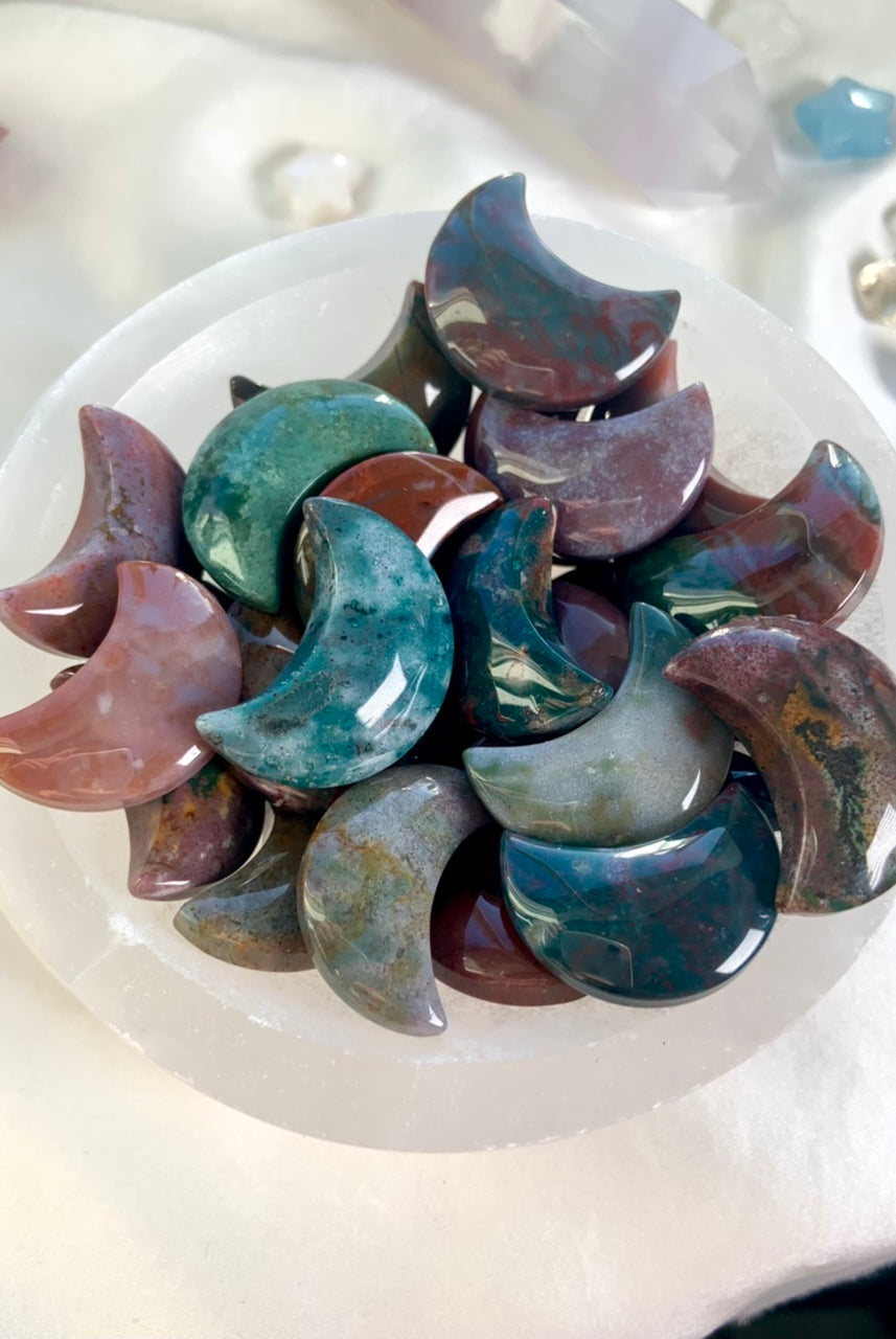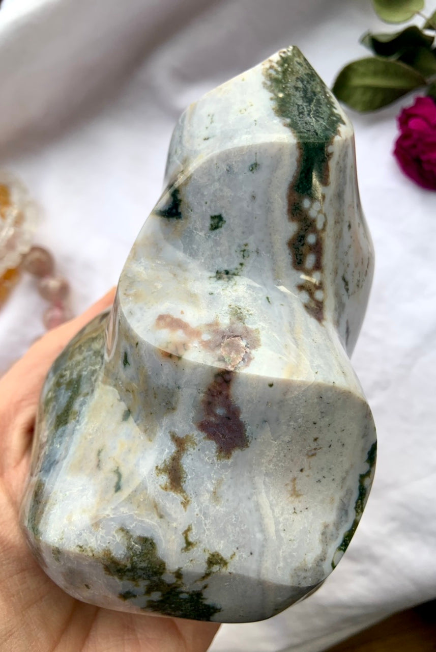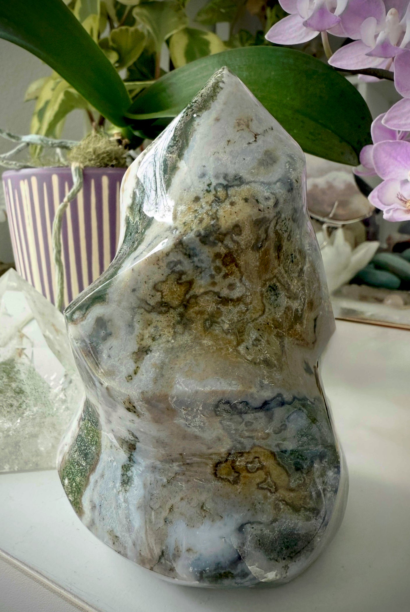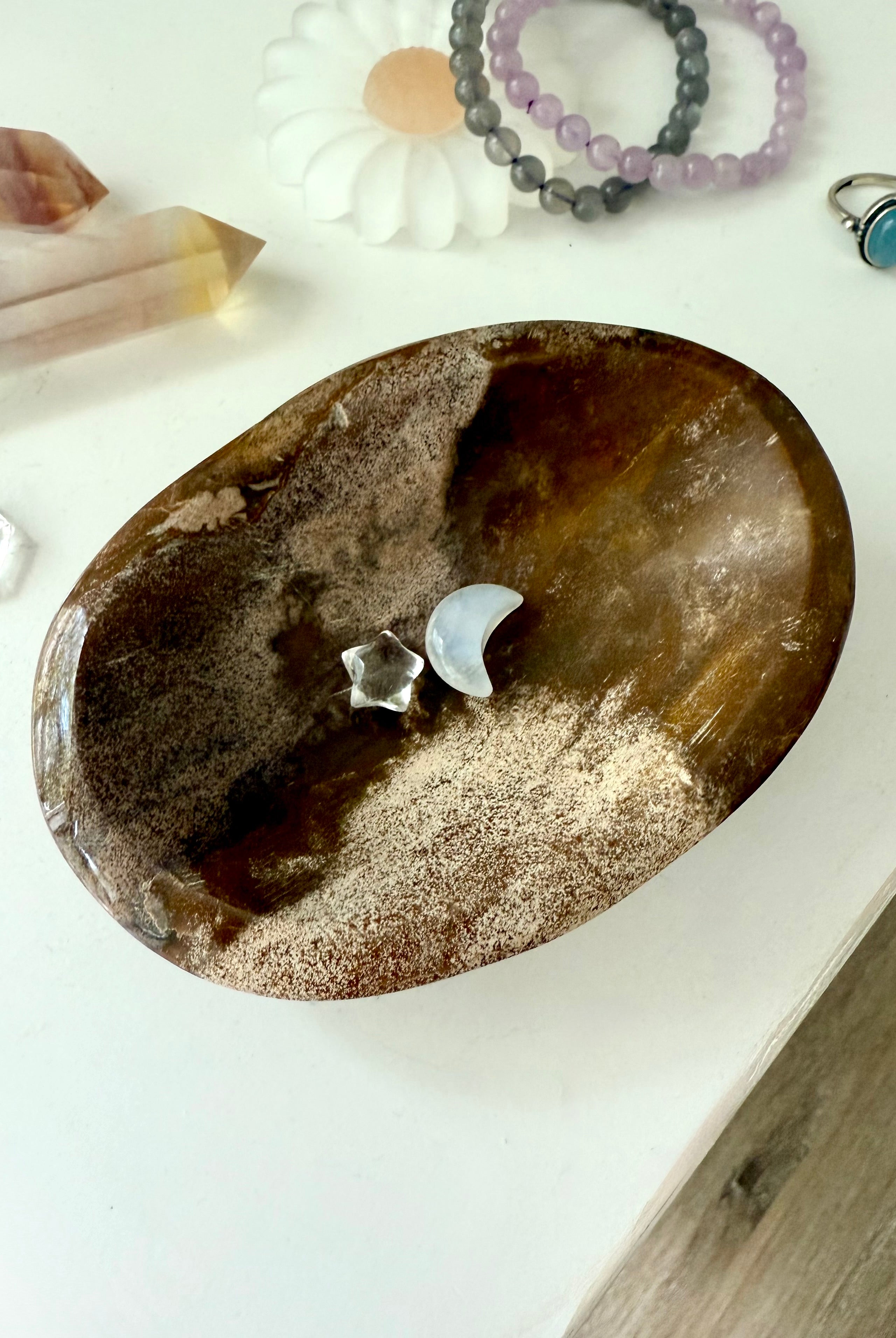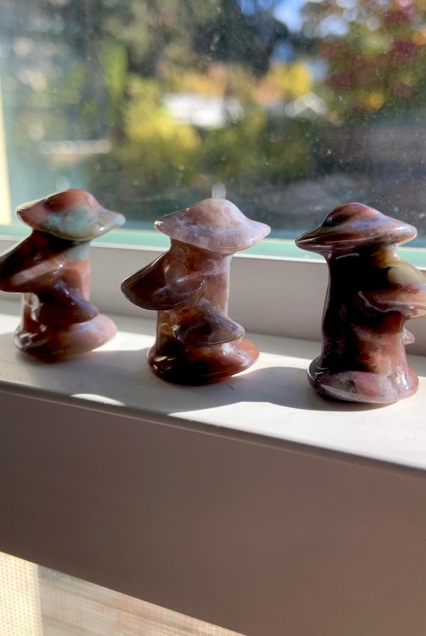 This collection features one-of-a-kind bowls, statement freeforms, hearts, moons, stars, palm stones, mushroom carvings, and bracelets—alongside a rotating selection of dragons, angels, spheres, towers, and unique carved treasures. Ocean Jasper supports Root and Heart Chakra healing, bringing balance, introspection, and grounded compassion to your journey of healing and remembrance.