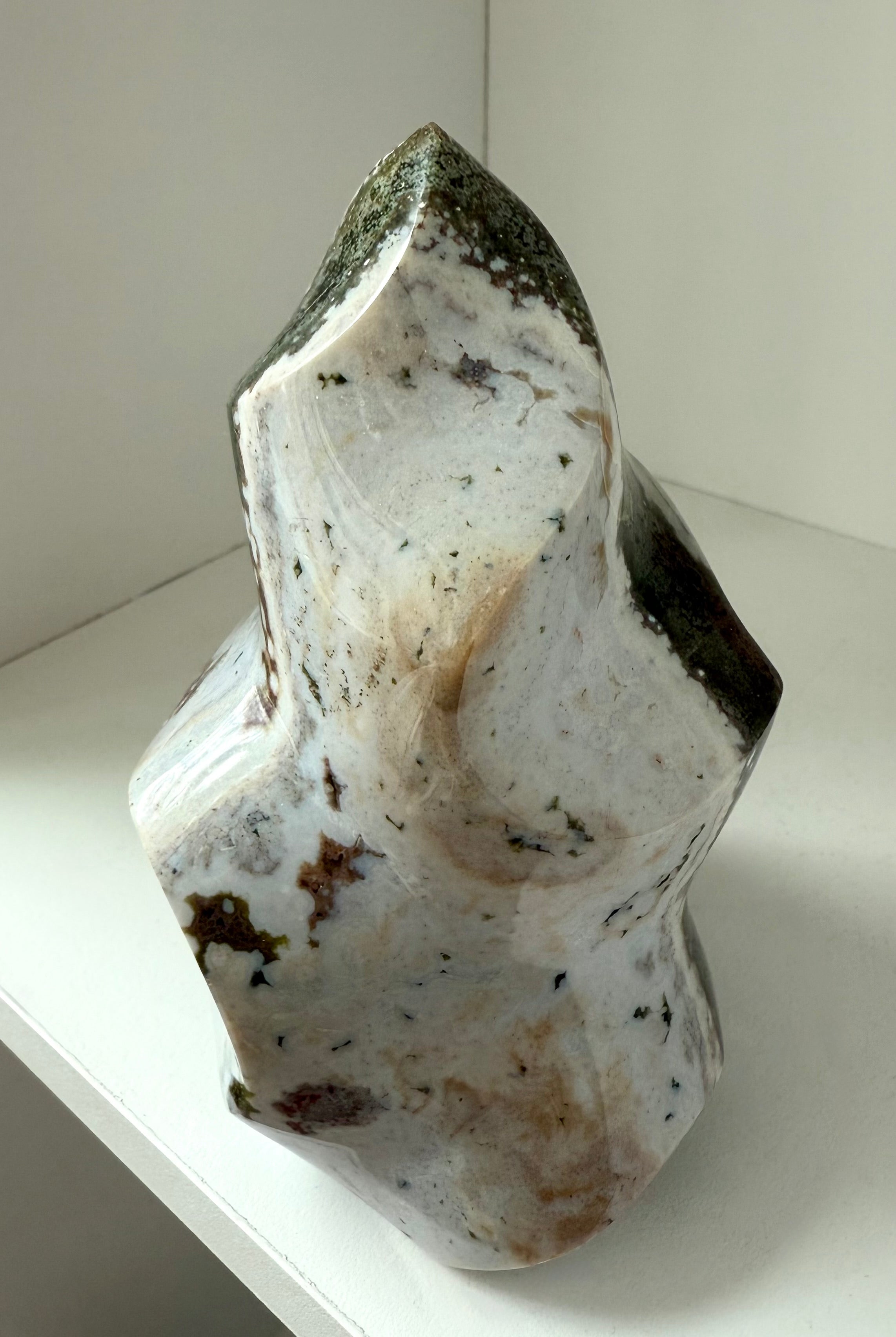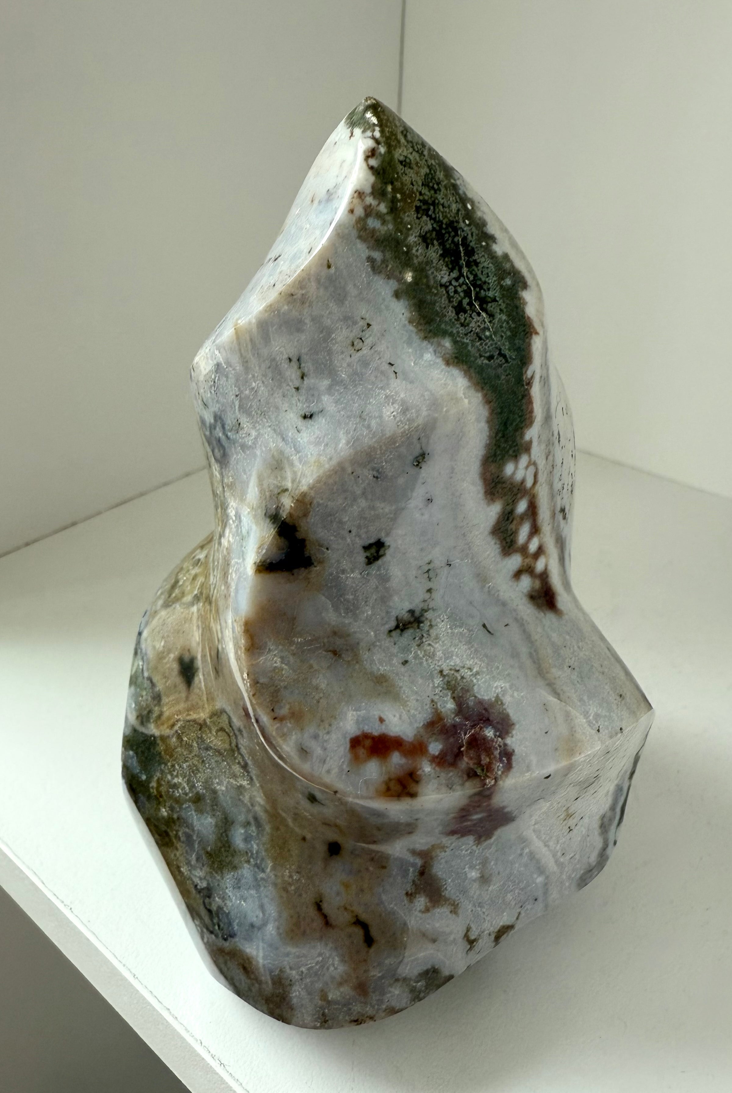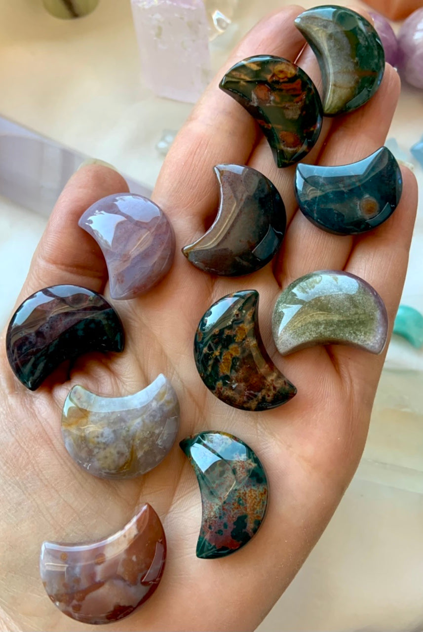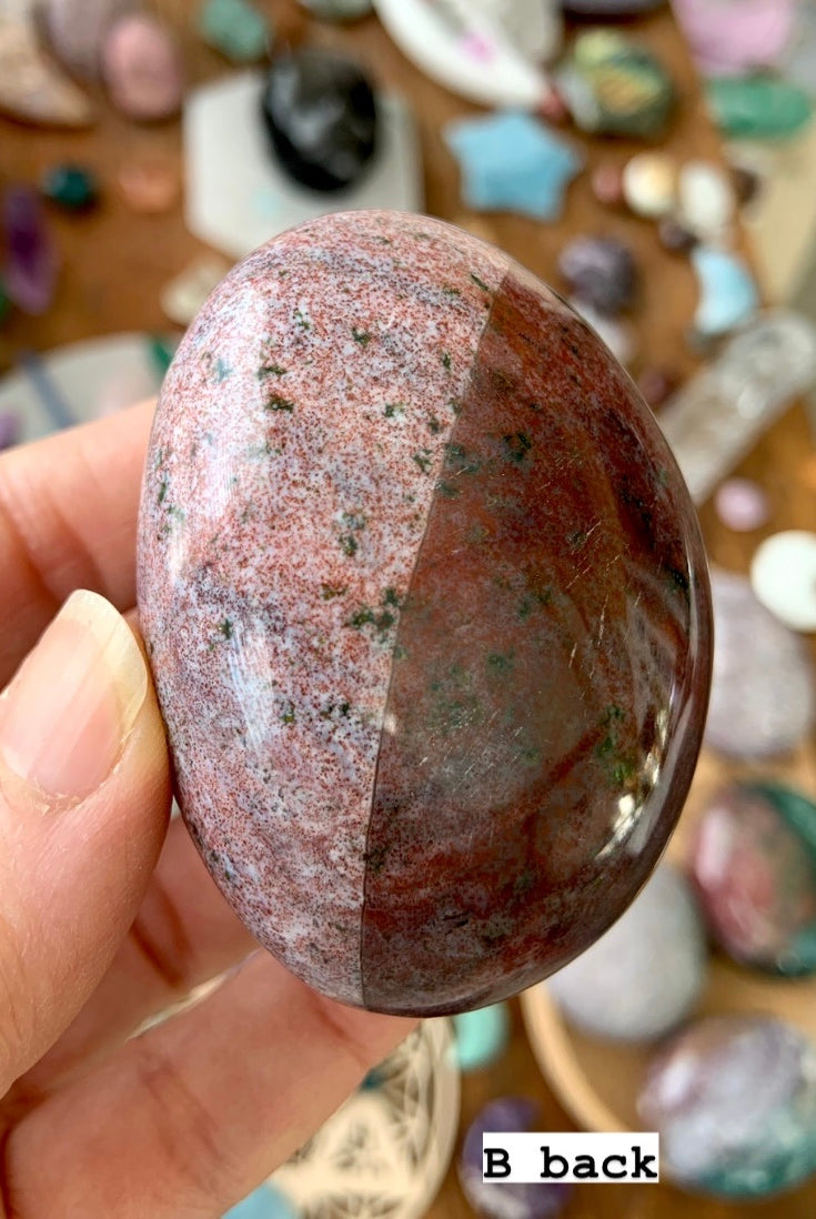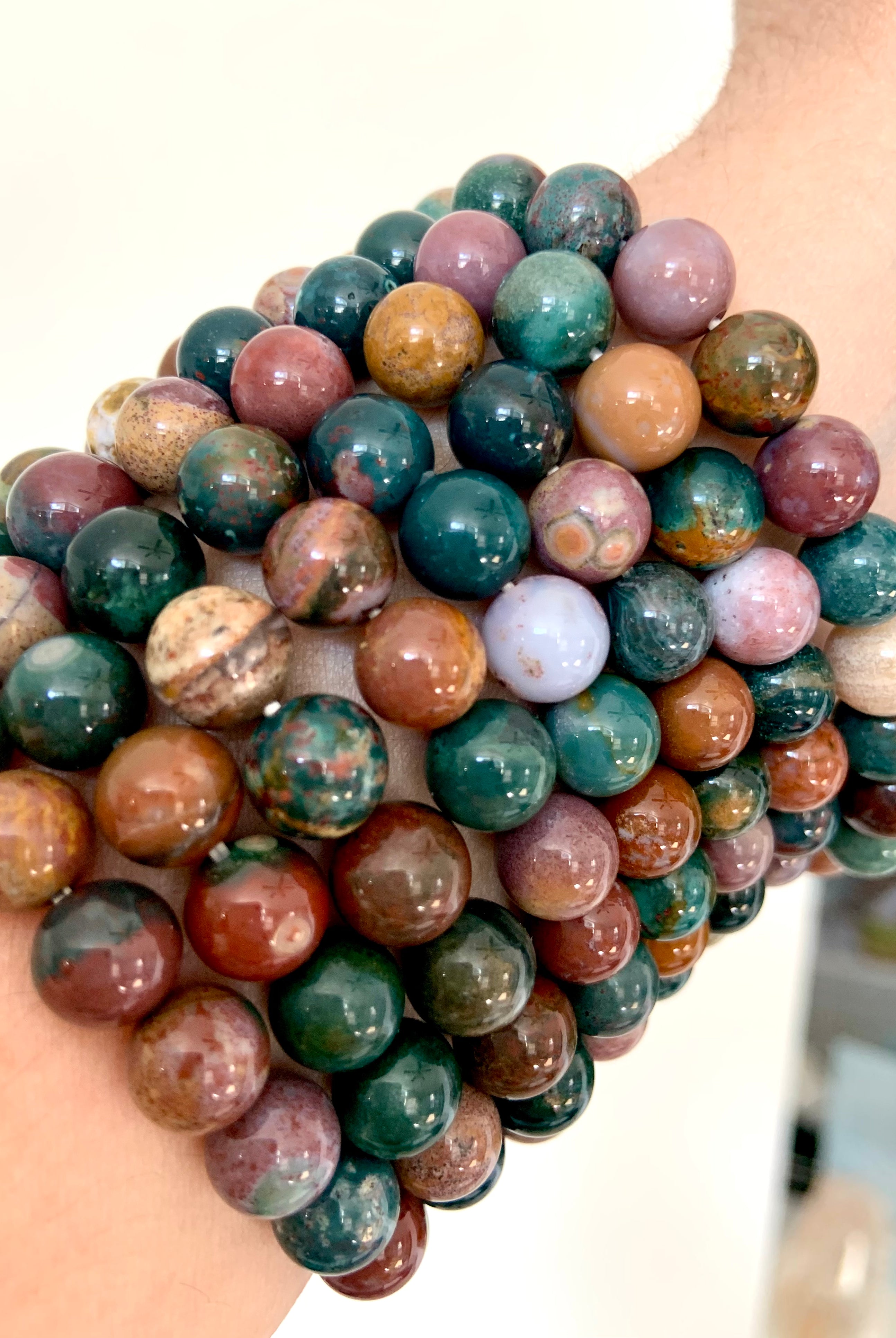 This collection features one-of-a-kind bowls, statement freeforms, hearts, moons, stars, palm stones, mushroom carvings, and bracelets—alongside a rotating selection of dragons, angels, spheres, towers, and unique carved treasures. Ocean Jasper supports Root and Heart Chakra healing, bringing balance, introspection, and grounded compassion to your journey of healing and remembrance.