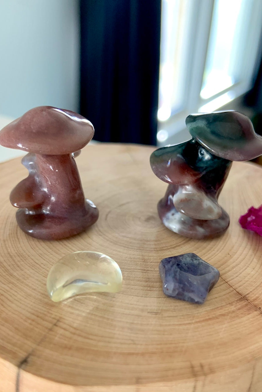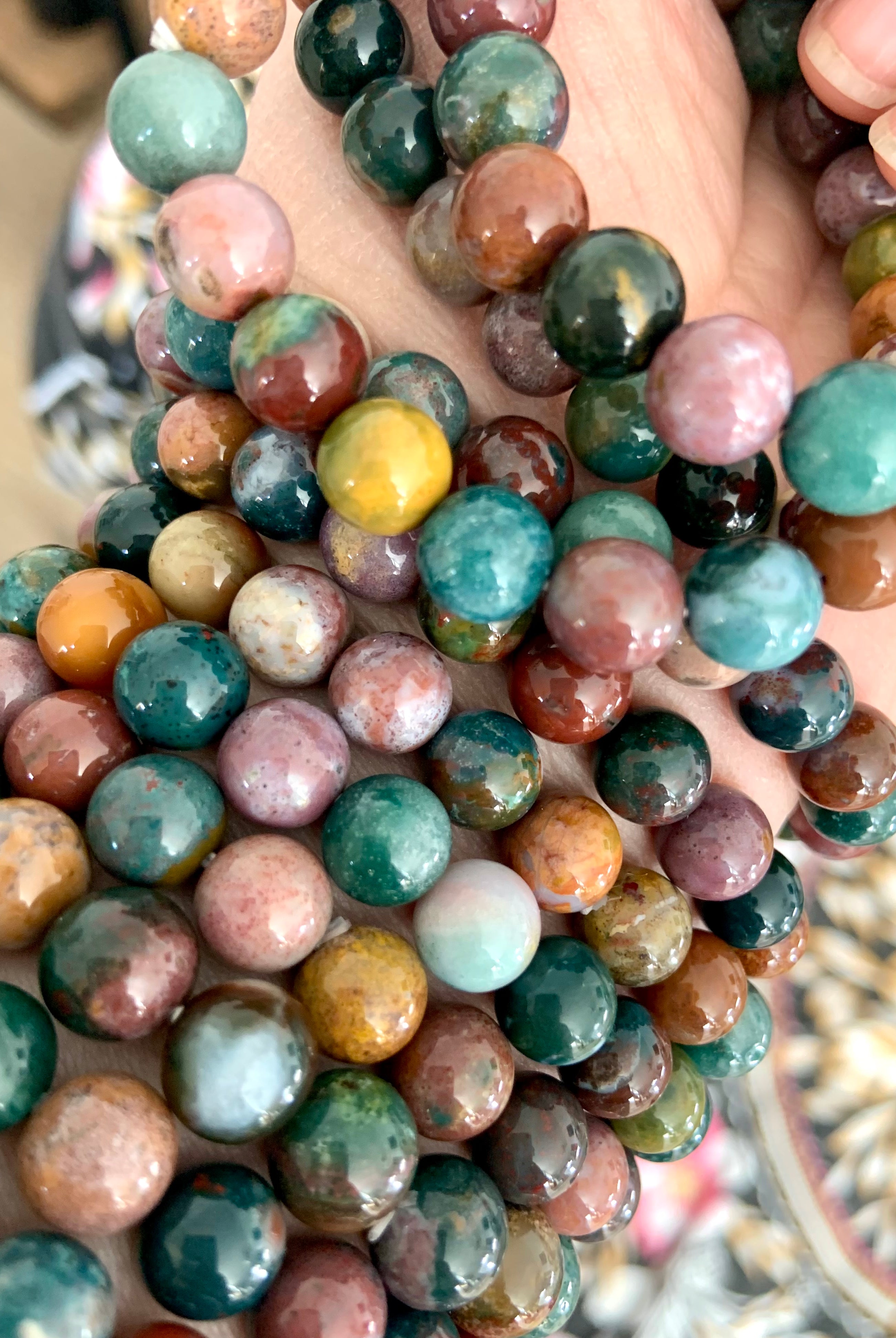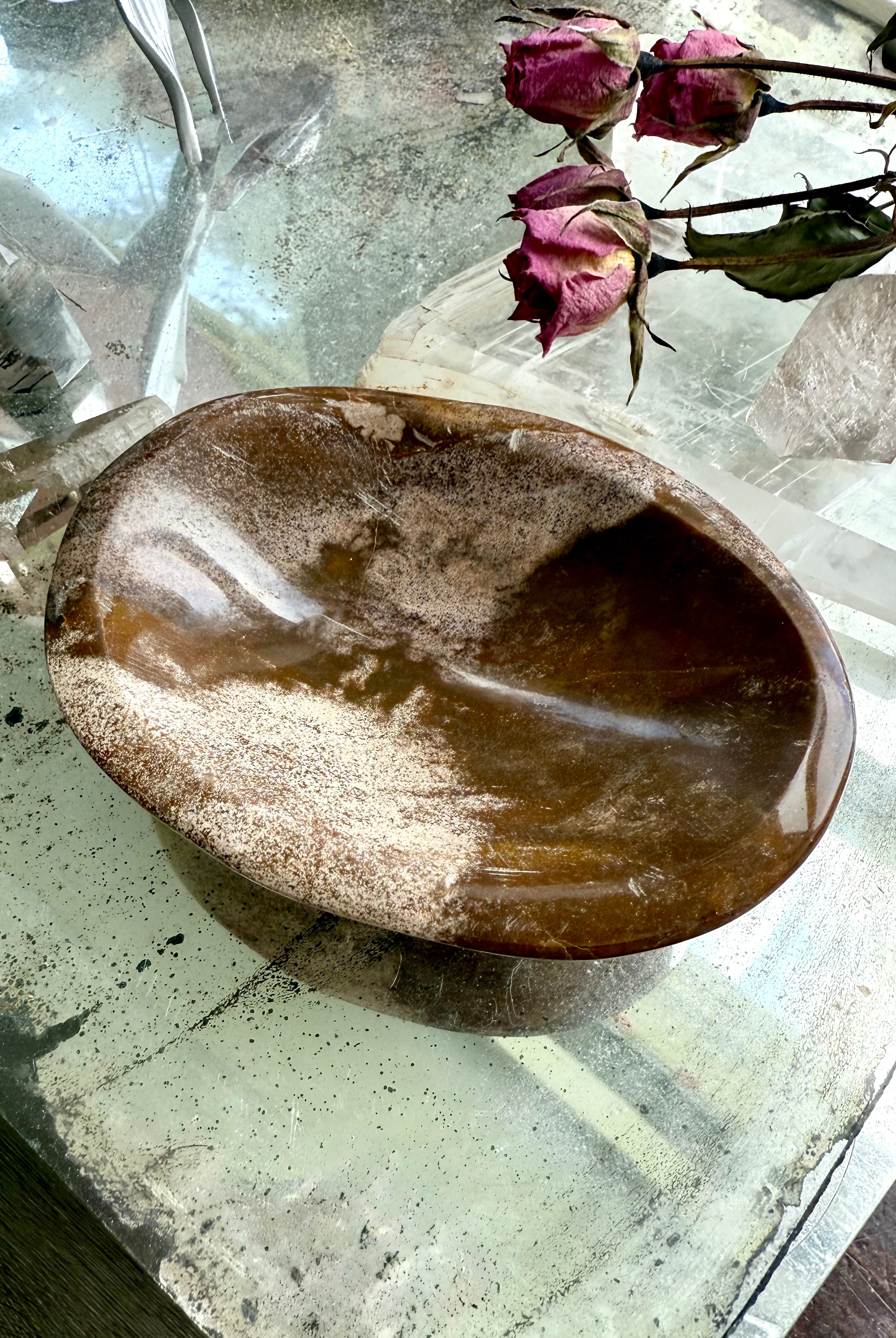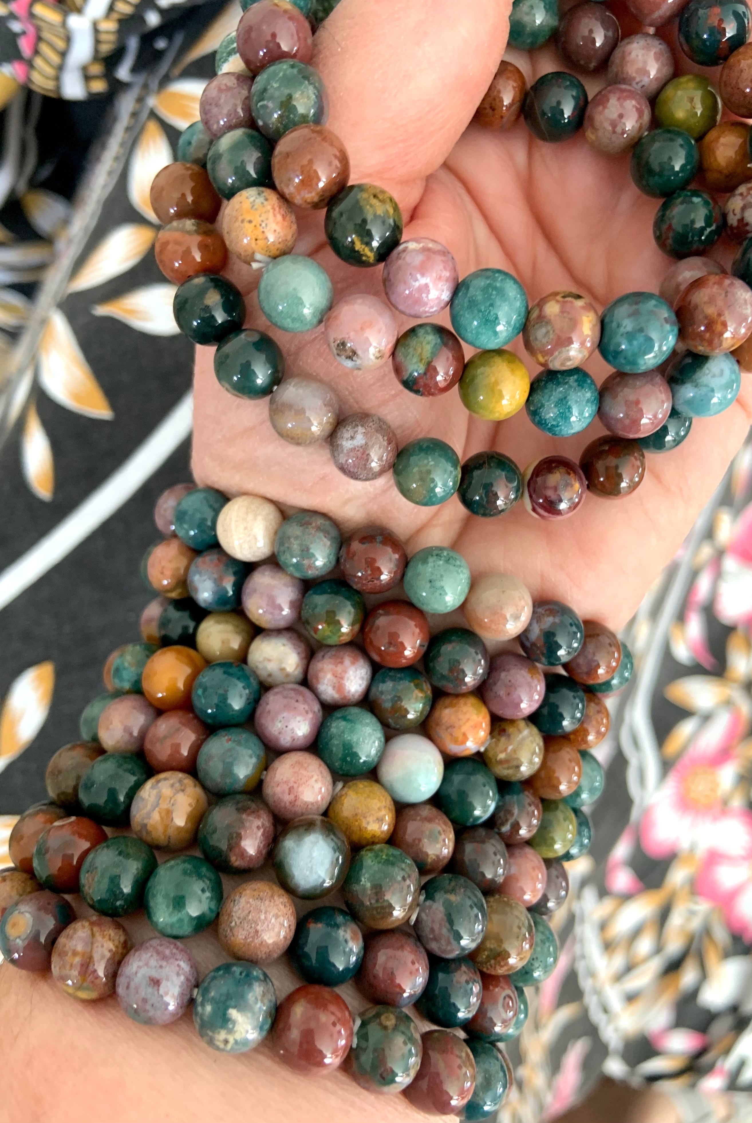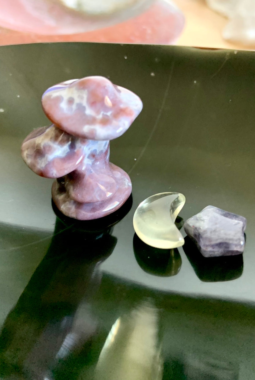 This collection features one-of-a-kind bowls, statement freeforms, hearts, moons, stars, palm stones, mushroom carvings, and bracelets—alongside a rotating selection of dragons, angels, spheres, towers, and unique carved treasures. Ocean Jasper supports Root and Heart Chakra healing, bringing balance, introspection, and grounded compassion to your journey of healing and remembrance.