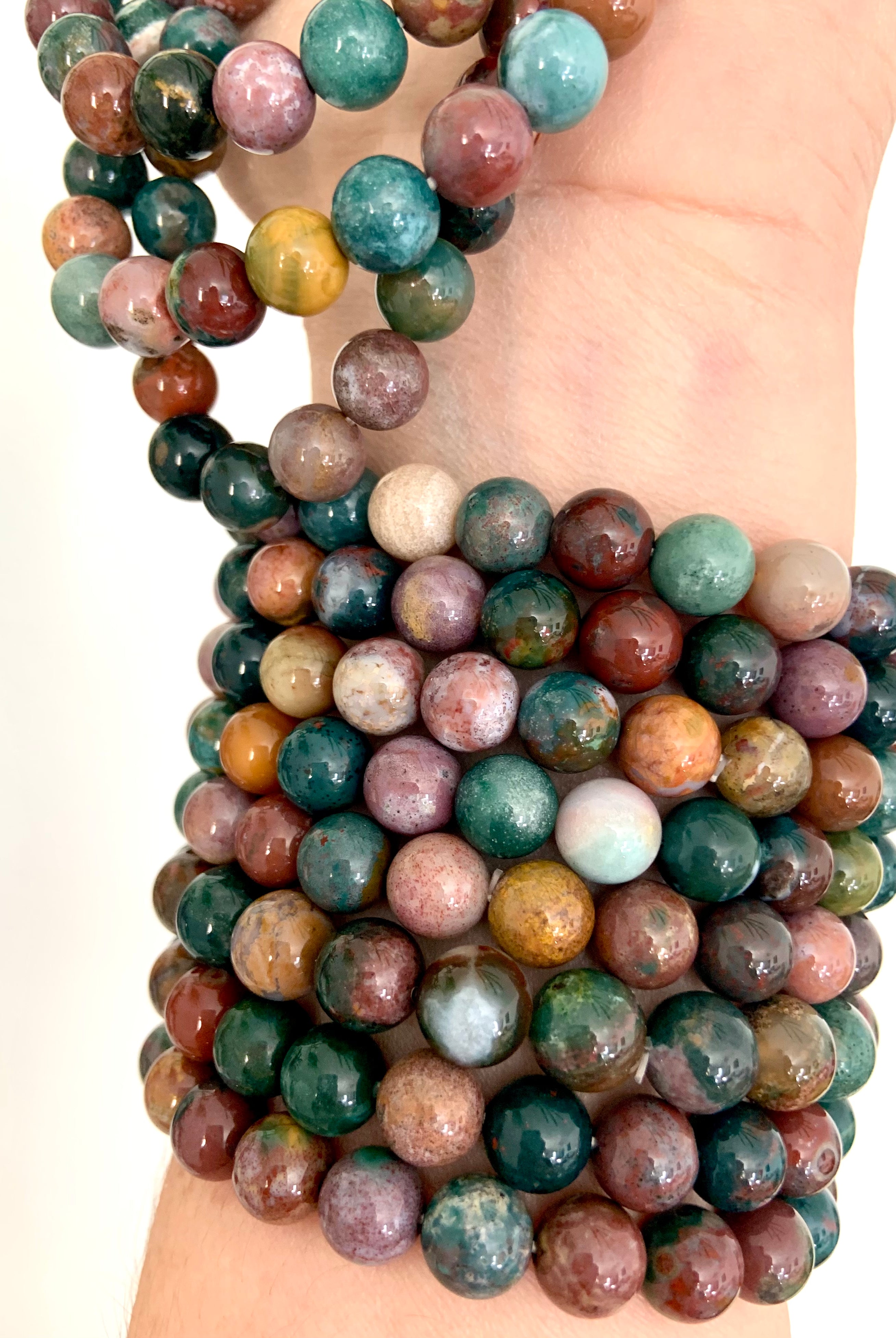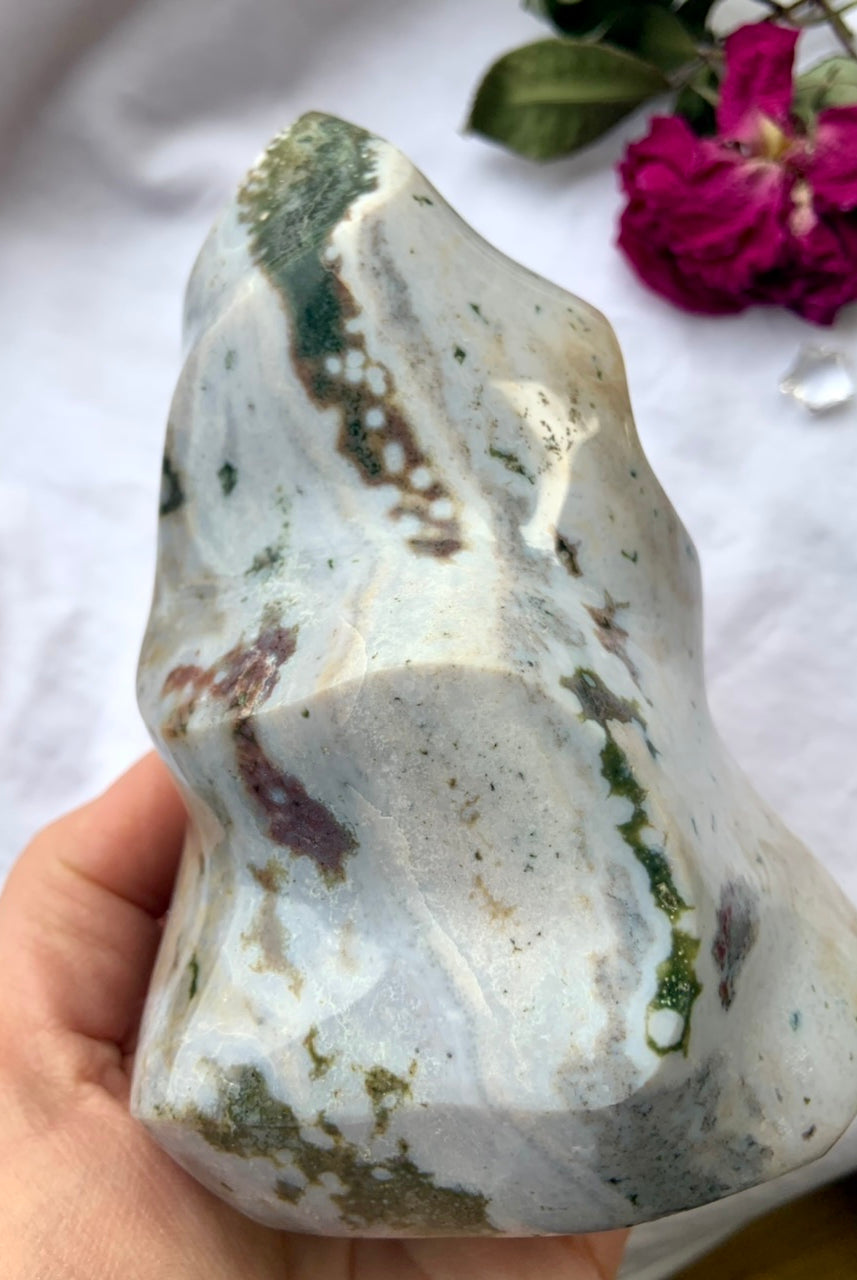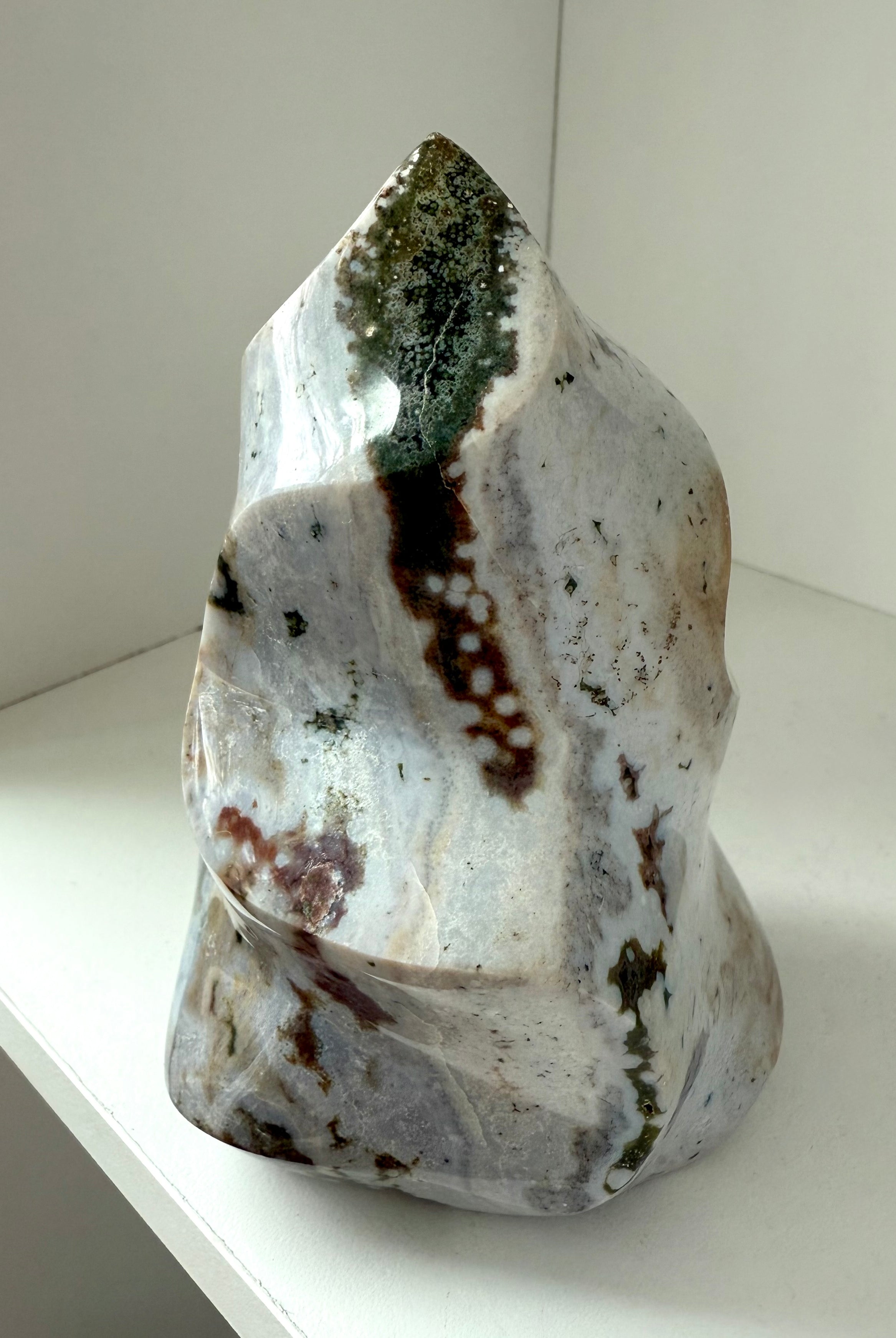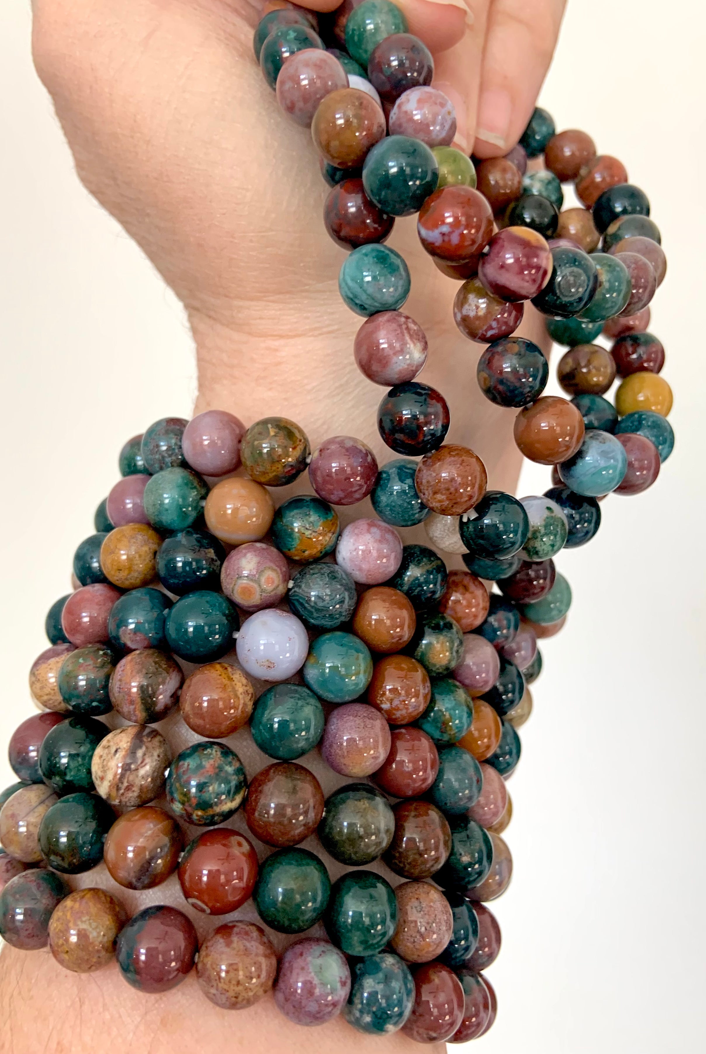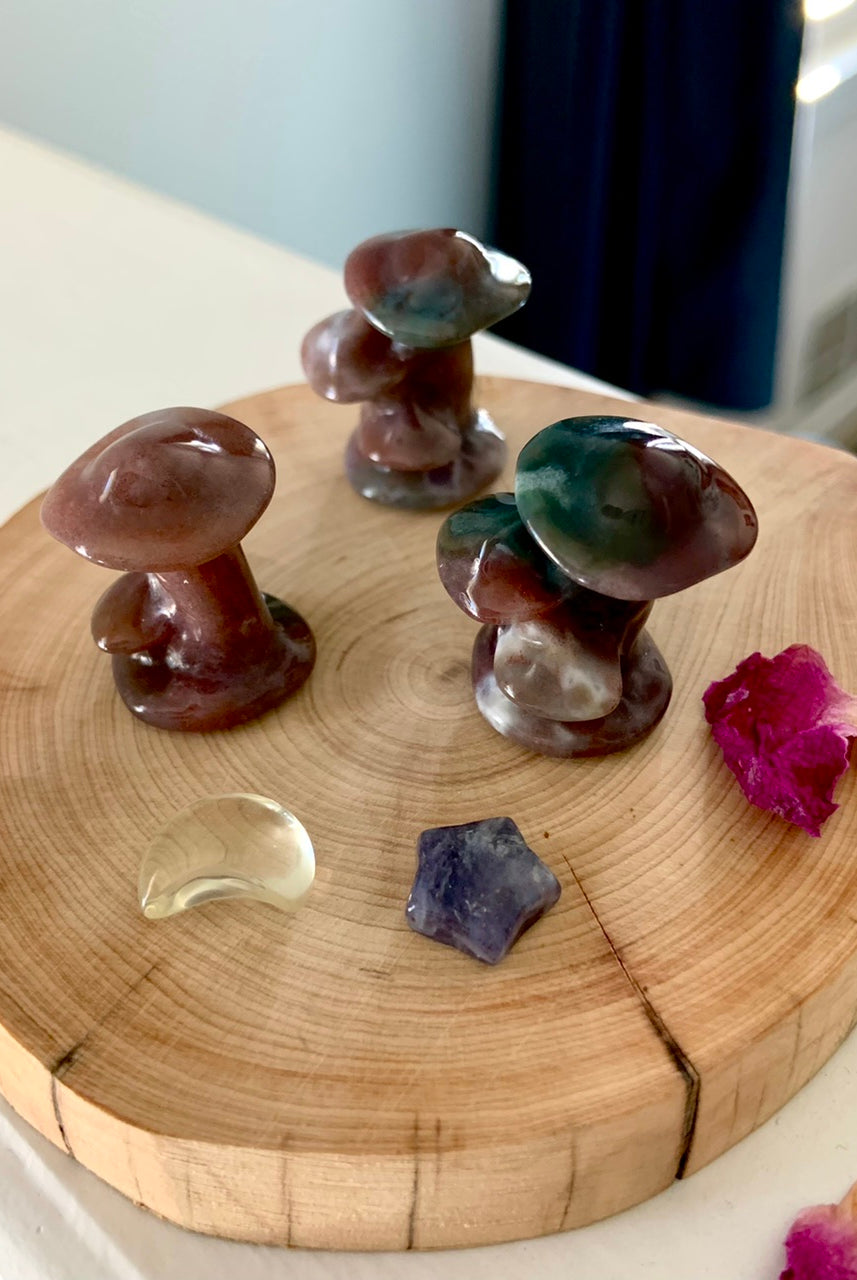 This collection features one-of-a-kind bowls, statement freeforms, hearts, moons, stars, palm stones, mushroom carvings, and bracelets—alongside a rotating selection of dragons, angels, spheres, towers, and unique carved treasures. Ocean Jasper supports Root and Heart Chakra healing, bringing balance, introspection, and grounded compassion to your journey of healing and remembrance.
