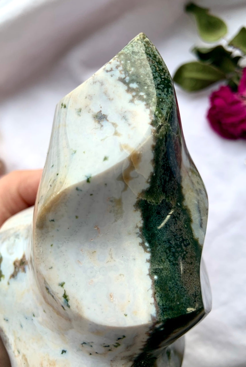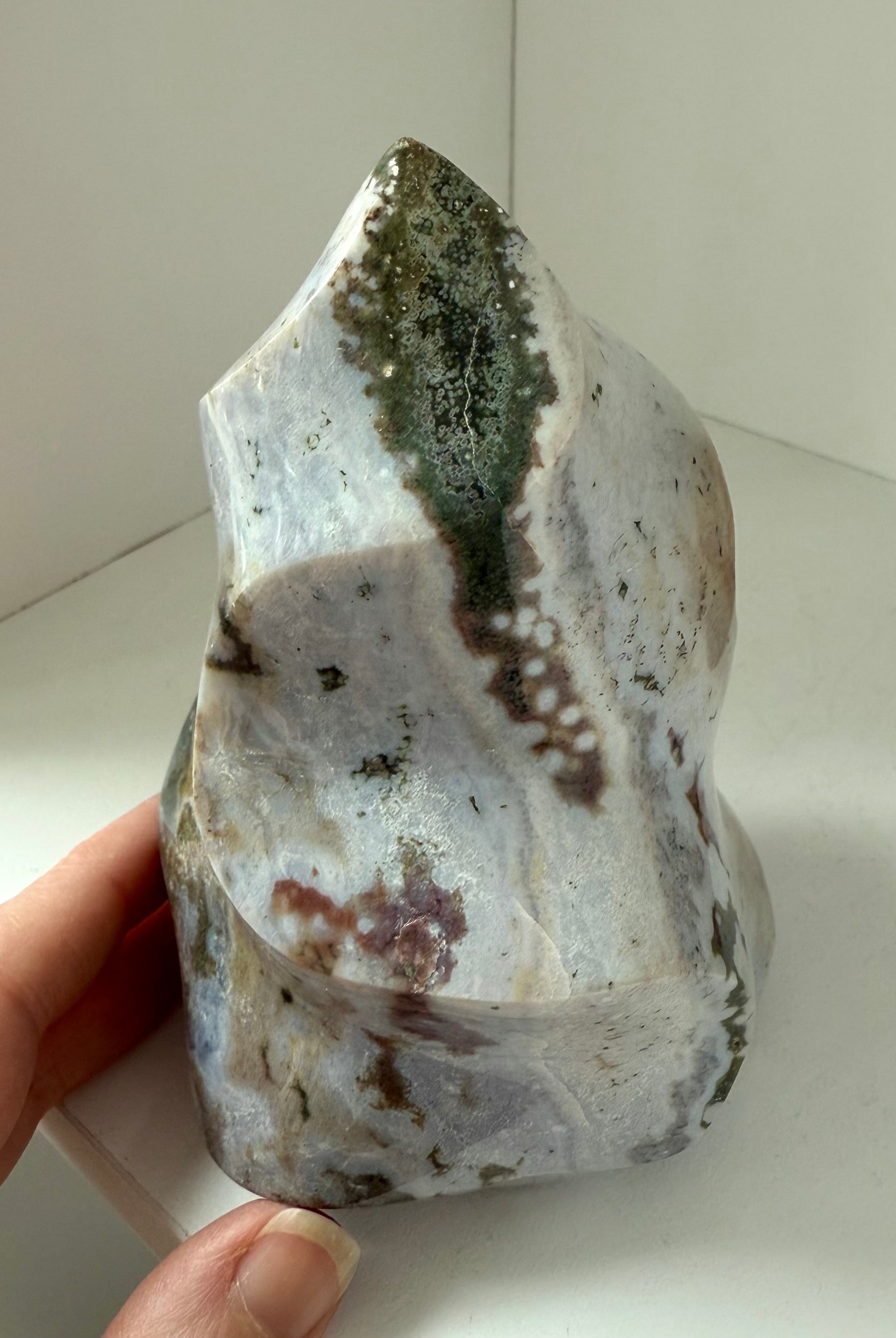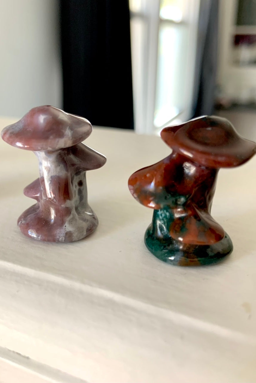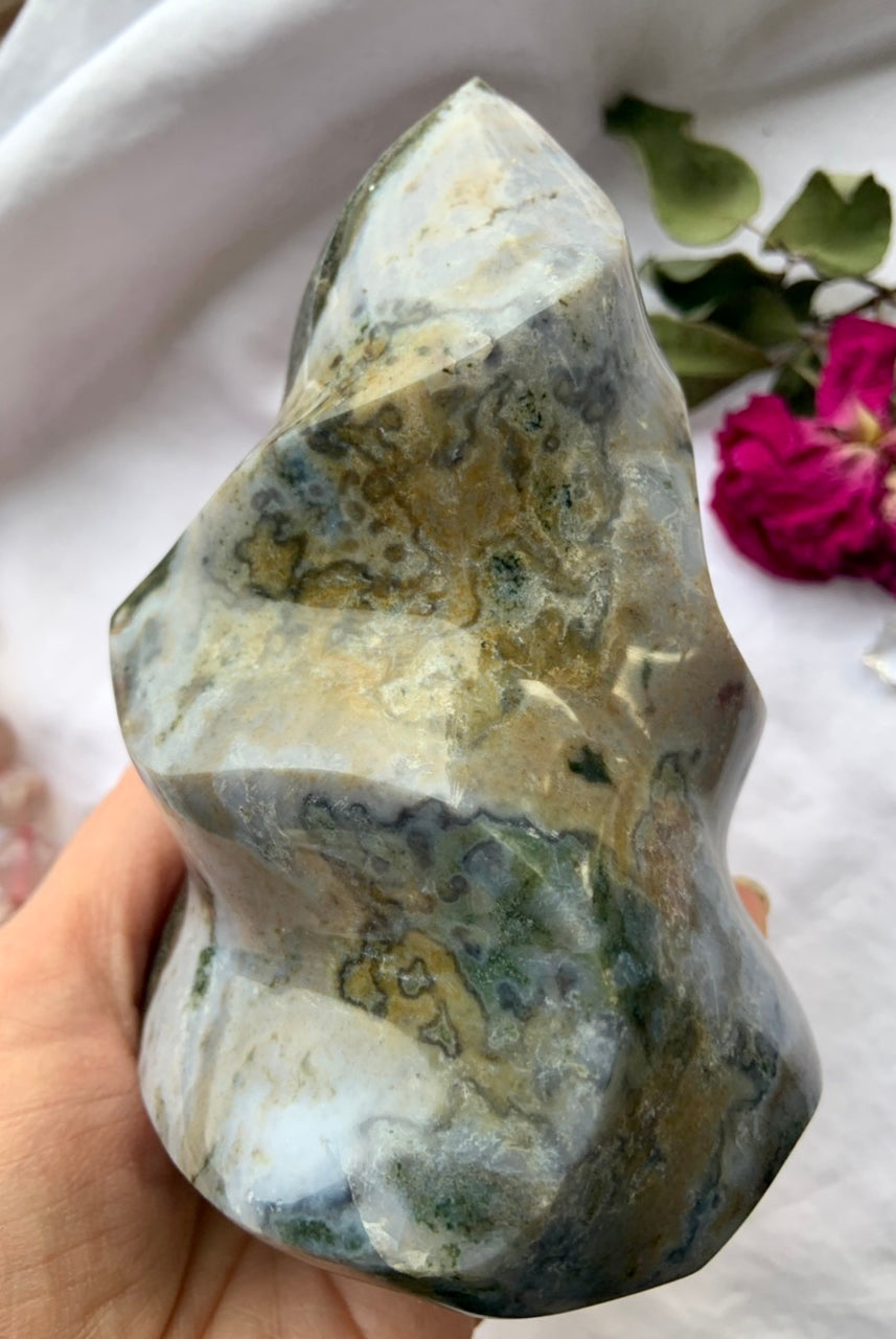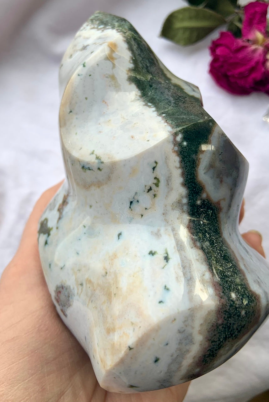 This collection features one-of-a-kind bowls, statement freeforms, hearts, moons, stars, palm stones, mushroom carvings, and bracelets—alongside a rotating selection of dragons, angels, spheres, towers, and unique carved treasures. Ocean Jasper supports Root and Heart Chakra healing, bringing balance, introspection, and grounded compassion to your journey of healing and remembrance.
