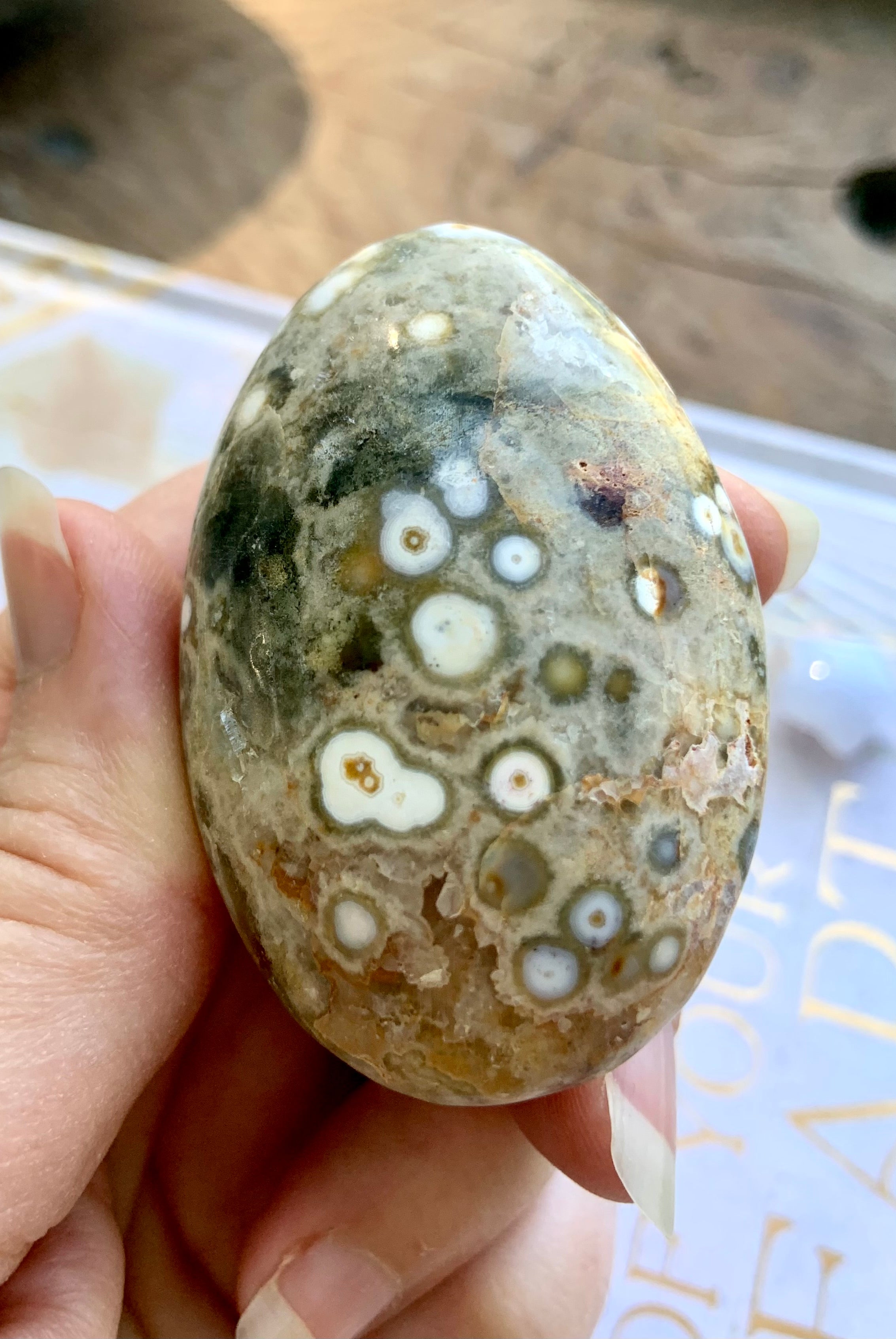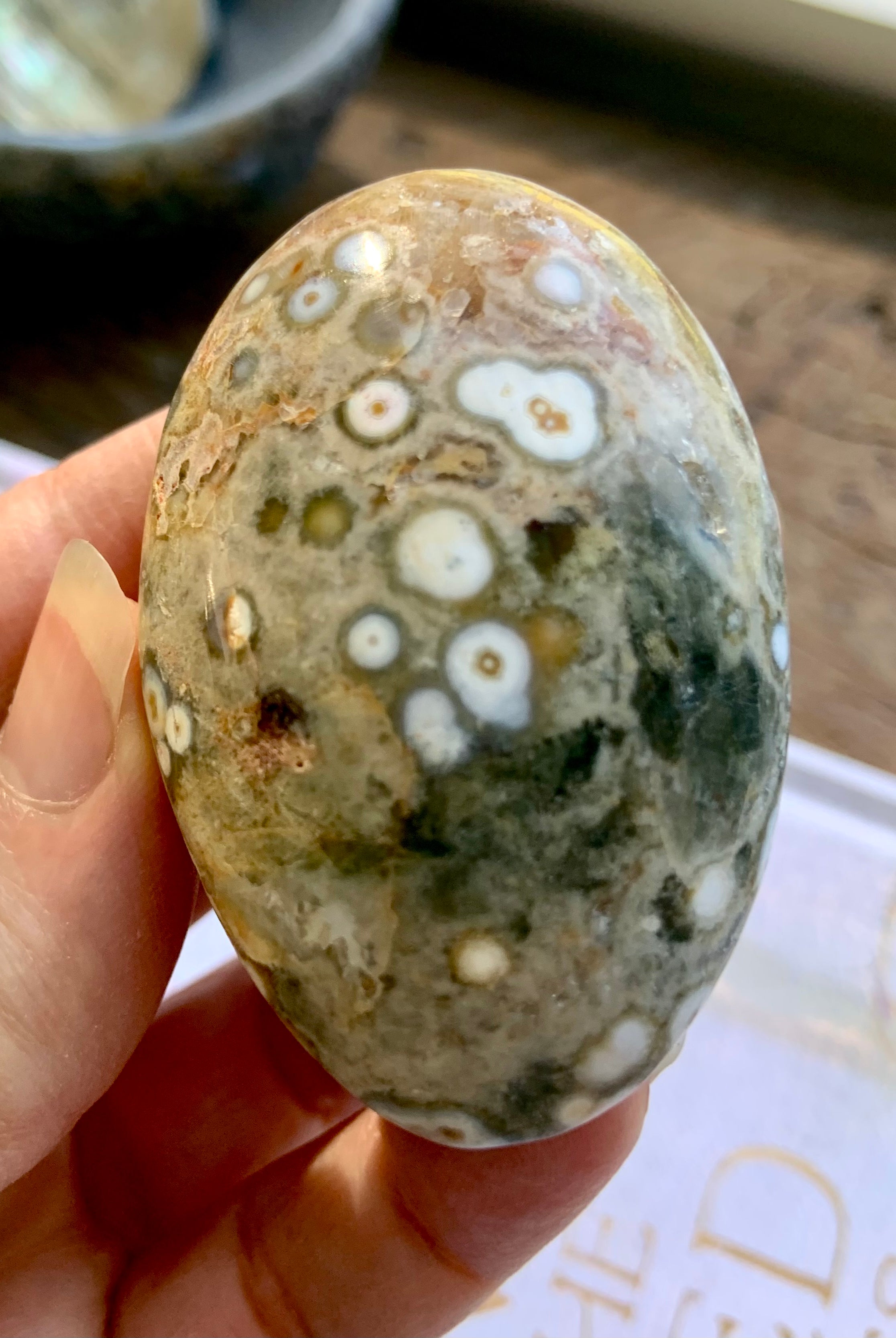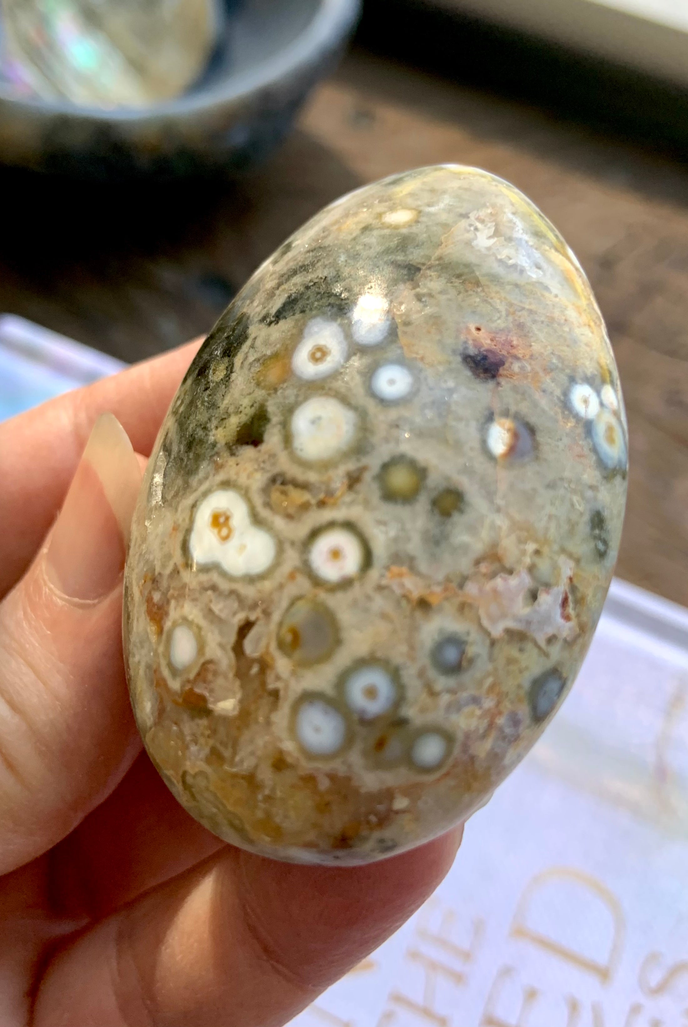 With soothing earth-and-sea tones and bubbly orbicular patterns, Ocean Jasper promotes focus, patience, and a deeper connection to self. Its calming energy is especially helpful in meditation, gently clearing the mind and inviting insight from the subconscious and spiritual realms.