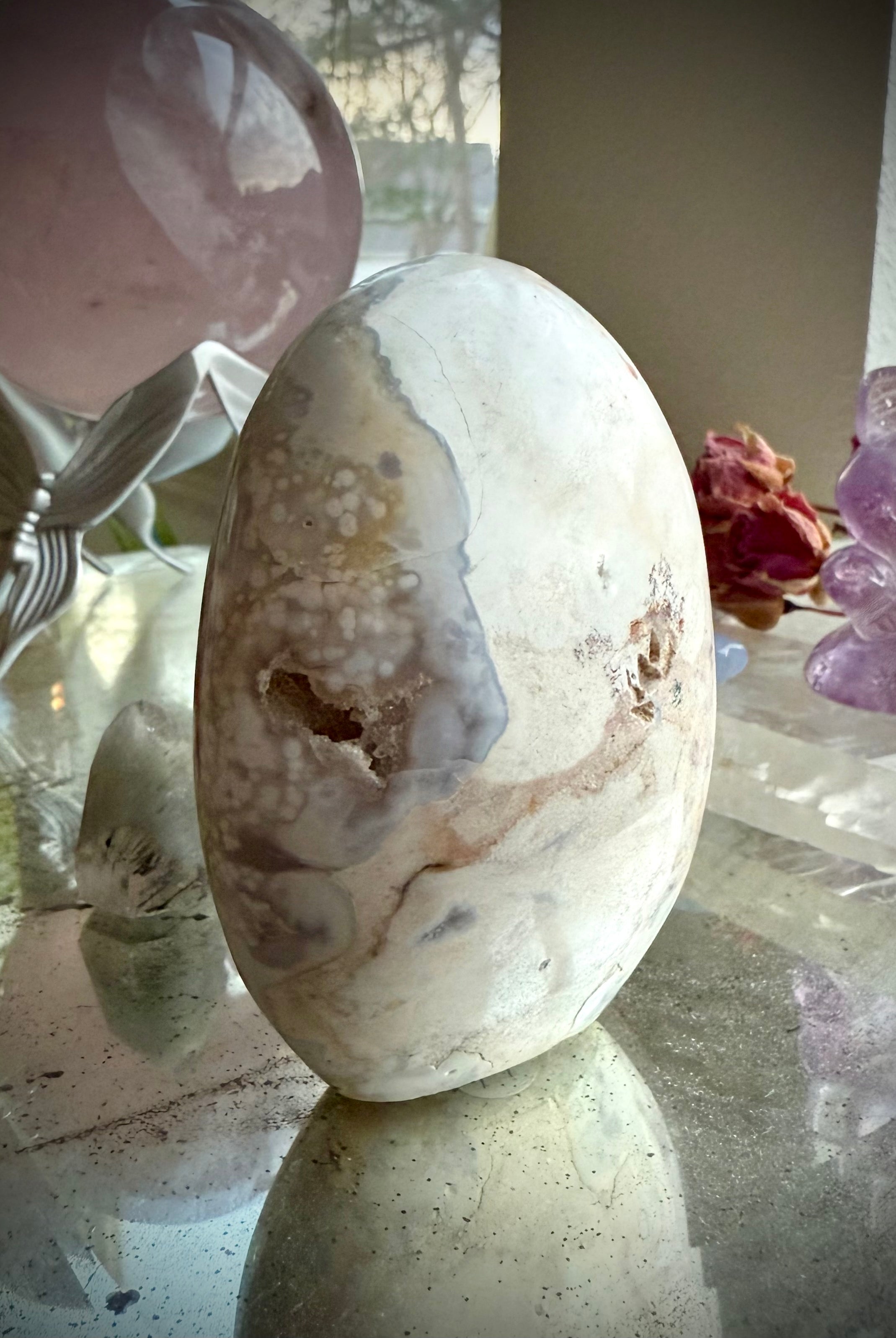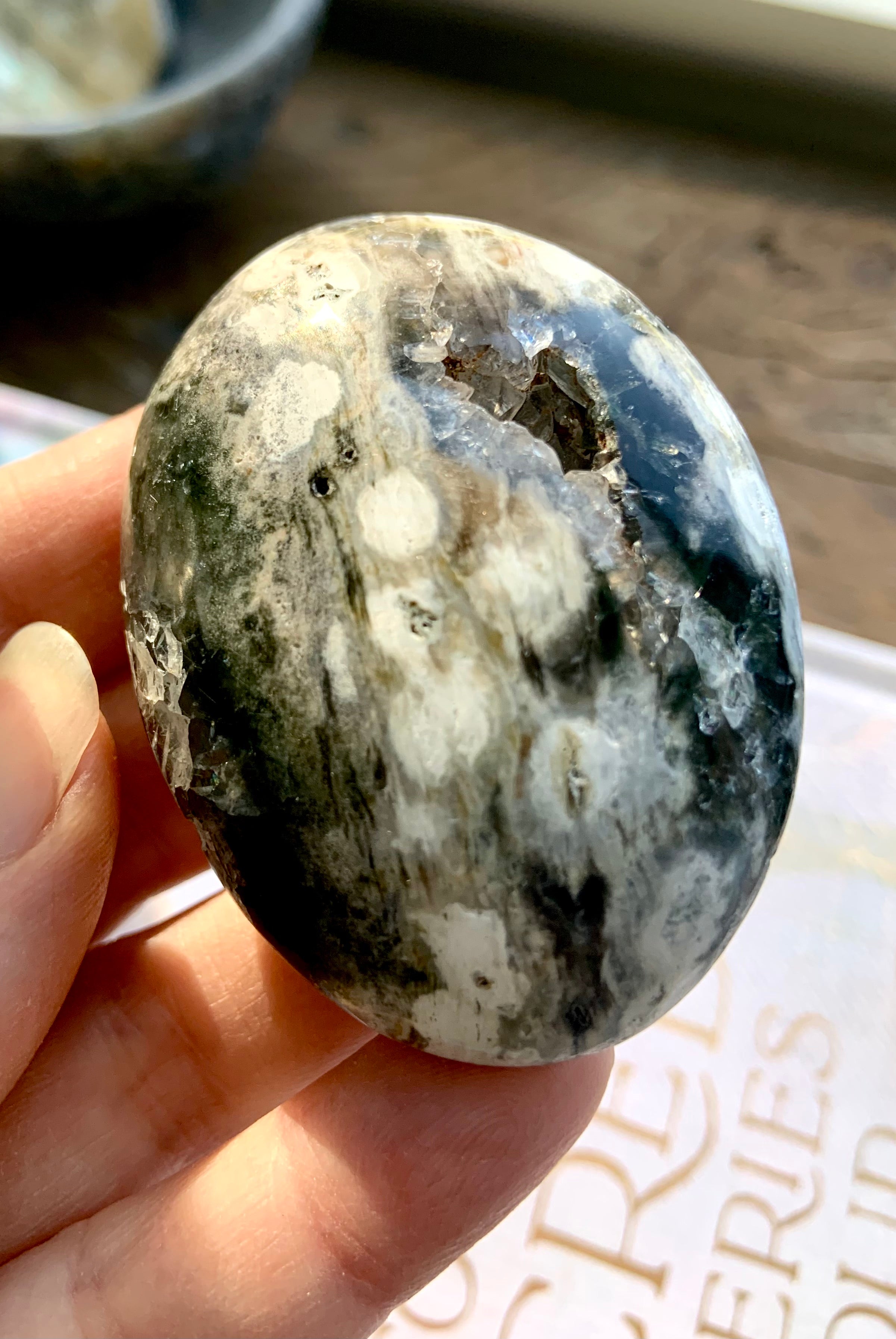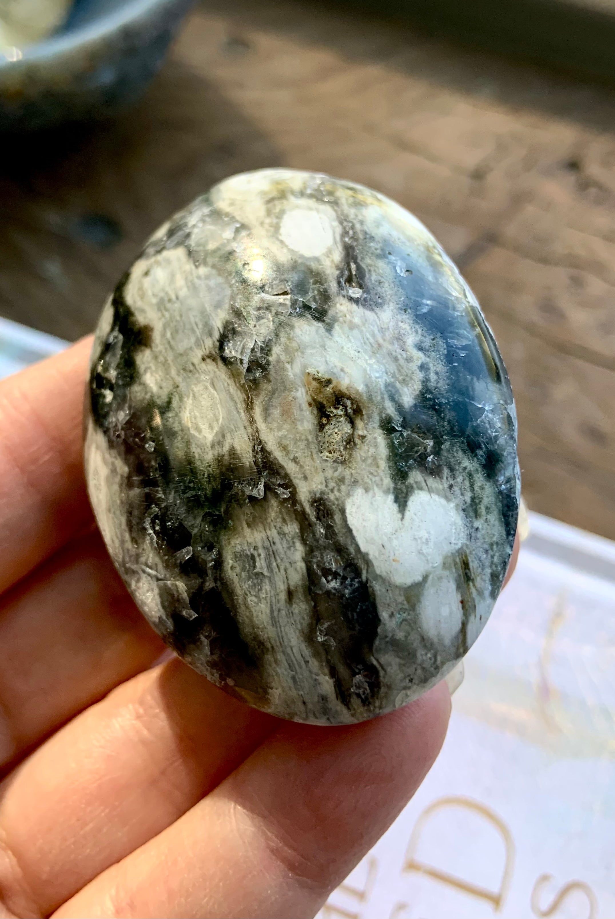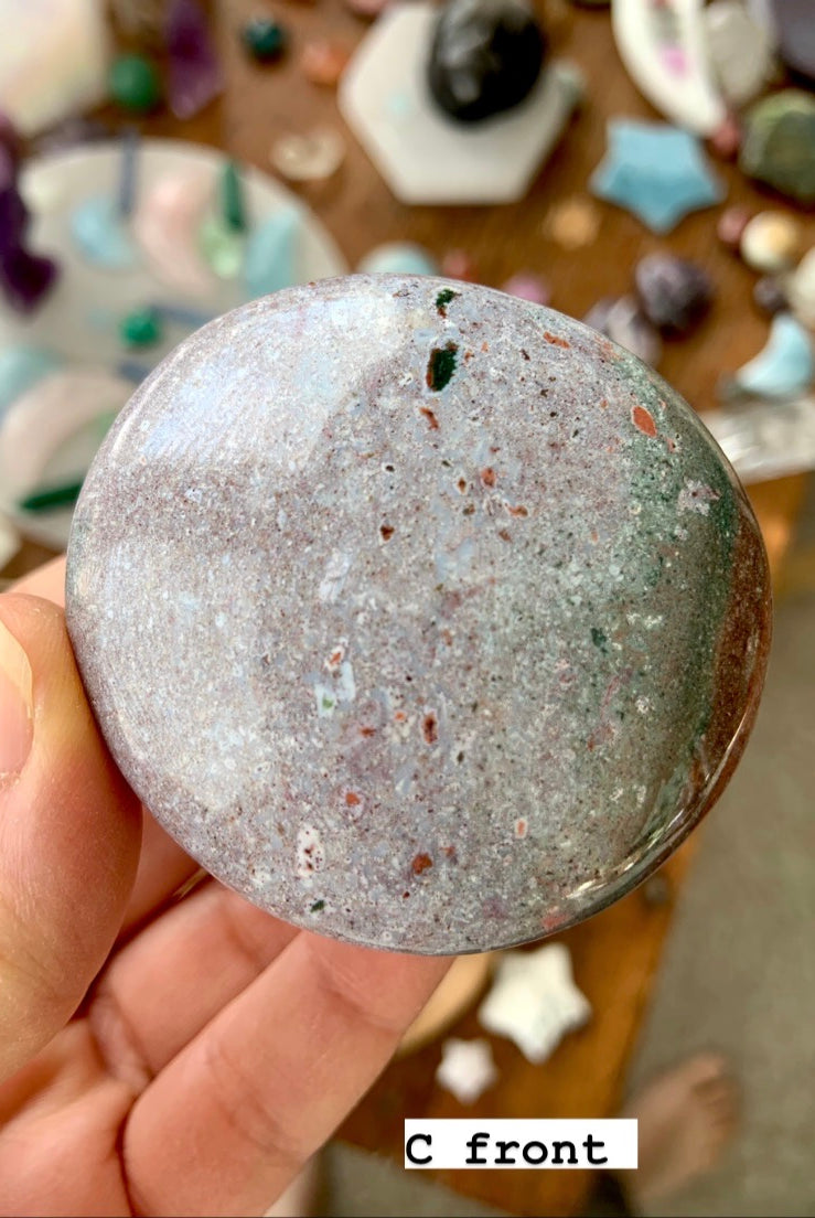 With soothing earth-and-sea tones and bubbly orbicular patterns, Ocean Jasper promotes focus, patience, and a deeper connection to self. Its calming energy is especially helpful in meditation, gently clearing the mind and inviting insight from the subconscious and spiritual realms.
