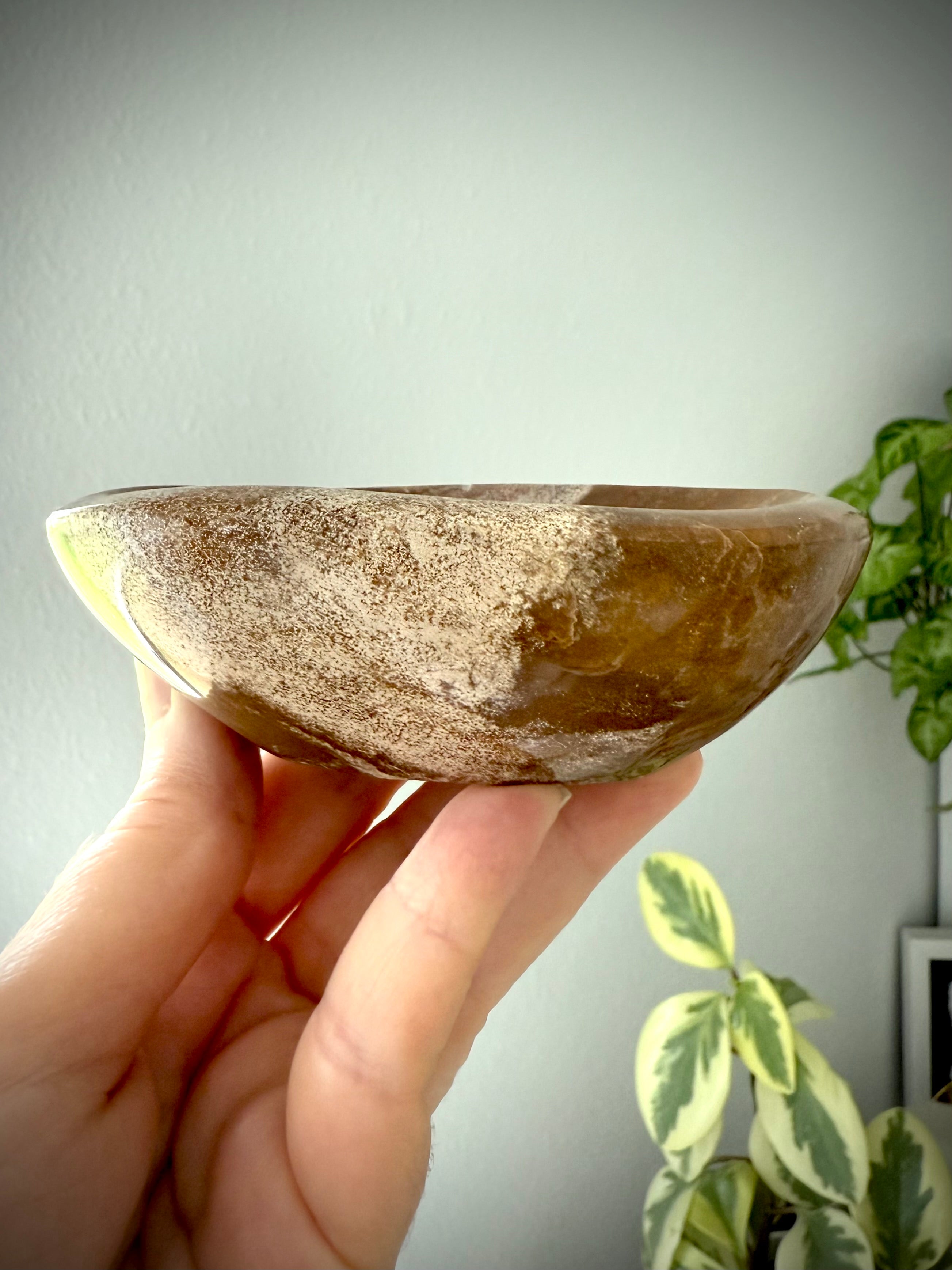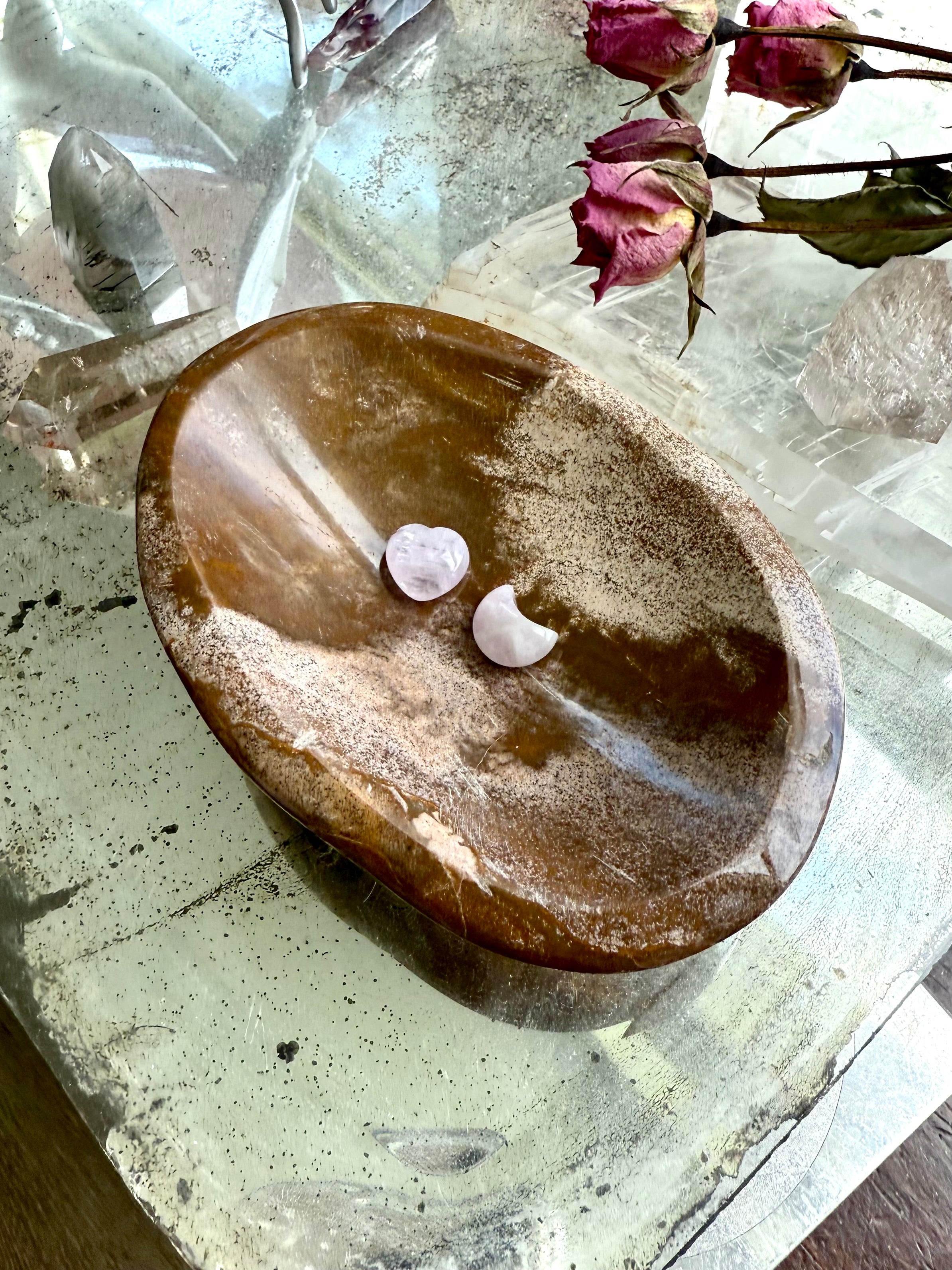 Use this artisan crafted jasper offering bowl to organize your treasures. Ocean Jasper brings a calm, uplifting energy to the room. It's the perfect one of a kind stone vessel for using in sacred ceremony + moon rituals or hold jewelry + crystals in style.
