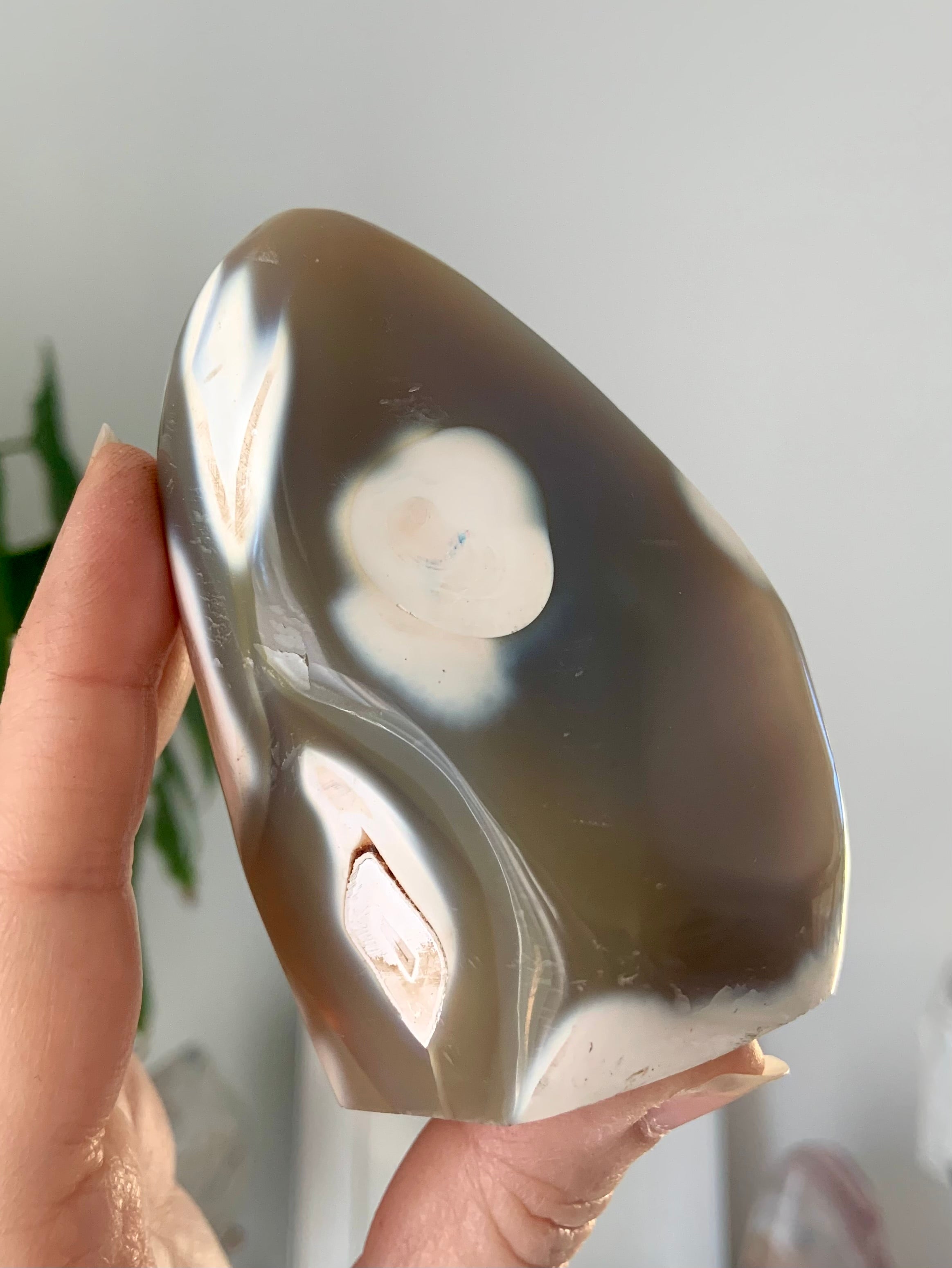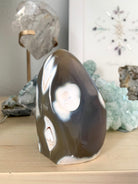 Self-standing with a flat bottom, this smooth-polished Orca Agate will sit beautifully on your shelf with your crystal collection. The rounded swirling shape also makes this a nice meditation stone to hold as you commune with its soothing energy + crystal healing properties.