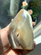 Consider this unique creamy orangey Gray Orca Agate Carnelian Flame for your crystal collection. Hand-shaped with organic curves that show off the undulating vertical patterns, contrasting white + a couple of prominent tree ring patterns + a little druzy. The agate has a milky, ethereal translucence in direct light or looks more opaque in ambient lighting.