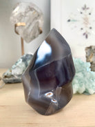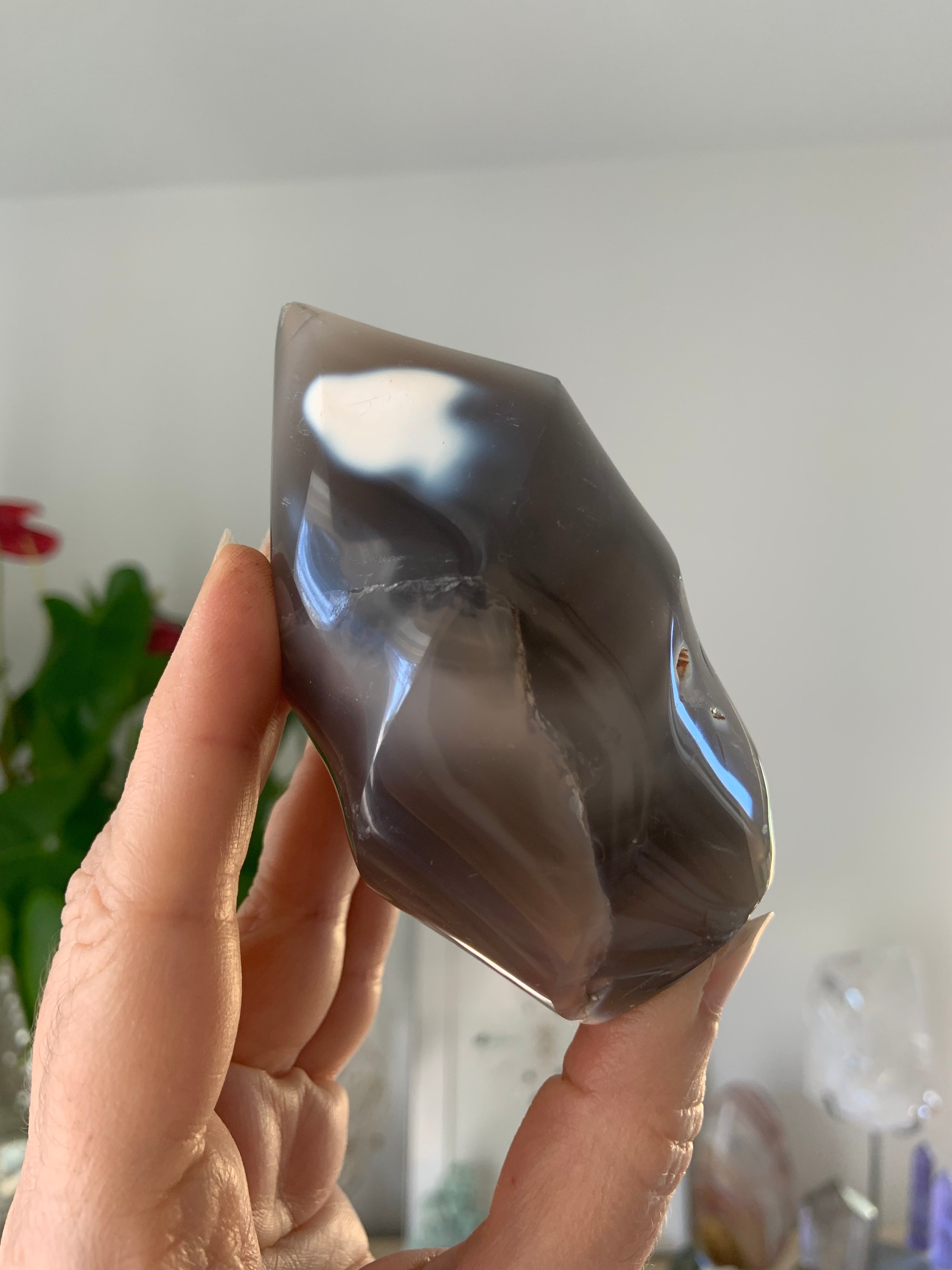 This inky Gray Orca Agate Freeform will compliment your crystal collection. Hand-shaped with organic curves that show off luminous dark gray + white accents with undulating patterns in the agate. This orca agate has an inky, ethereal translucence in direct light or looks more opaque in ambient lighting.