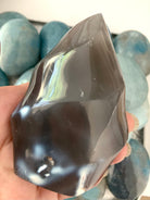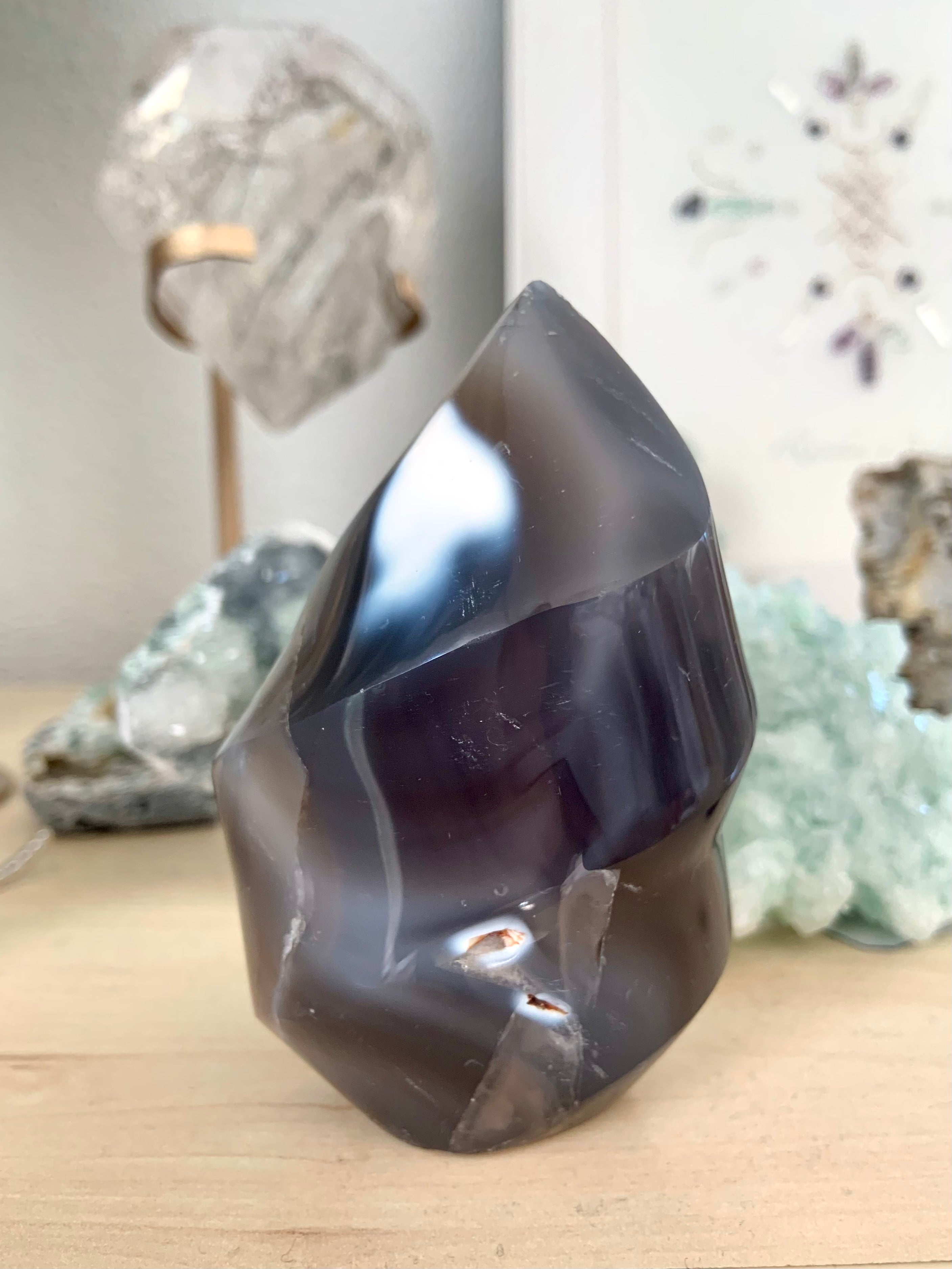 Self-standing with a flat bottom, this polished Orca Agate will sit beautifully on your shelf with your crystal decor. The rounded flame shape also makes this a nice stone to hold in meditation to work more deeply with its crystal healing properties.